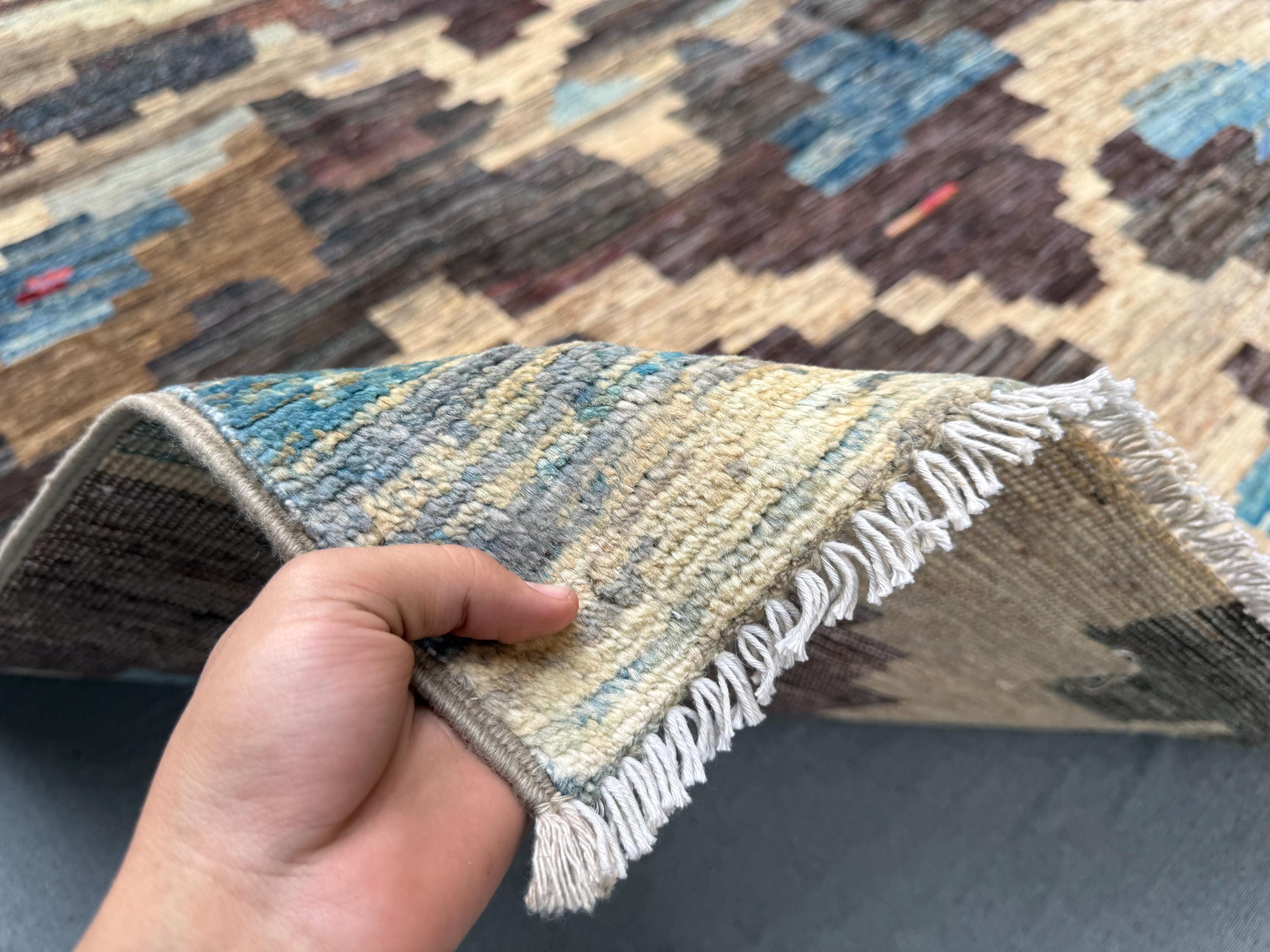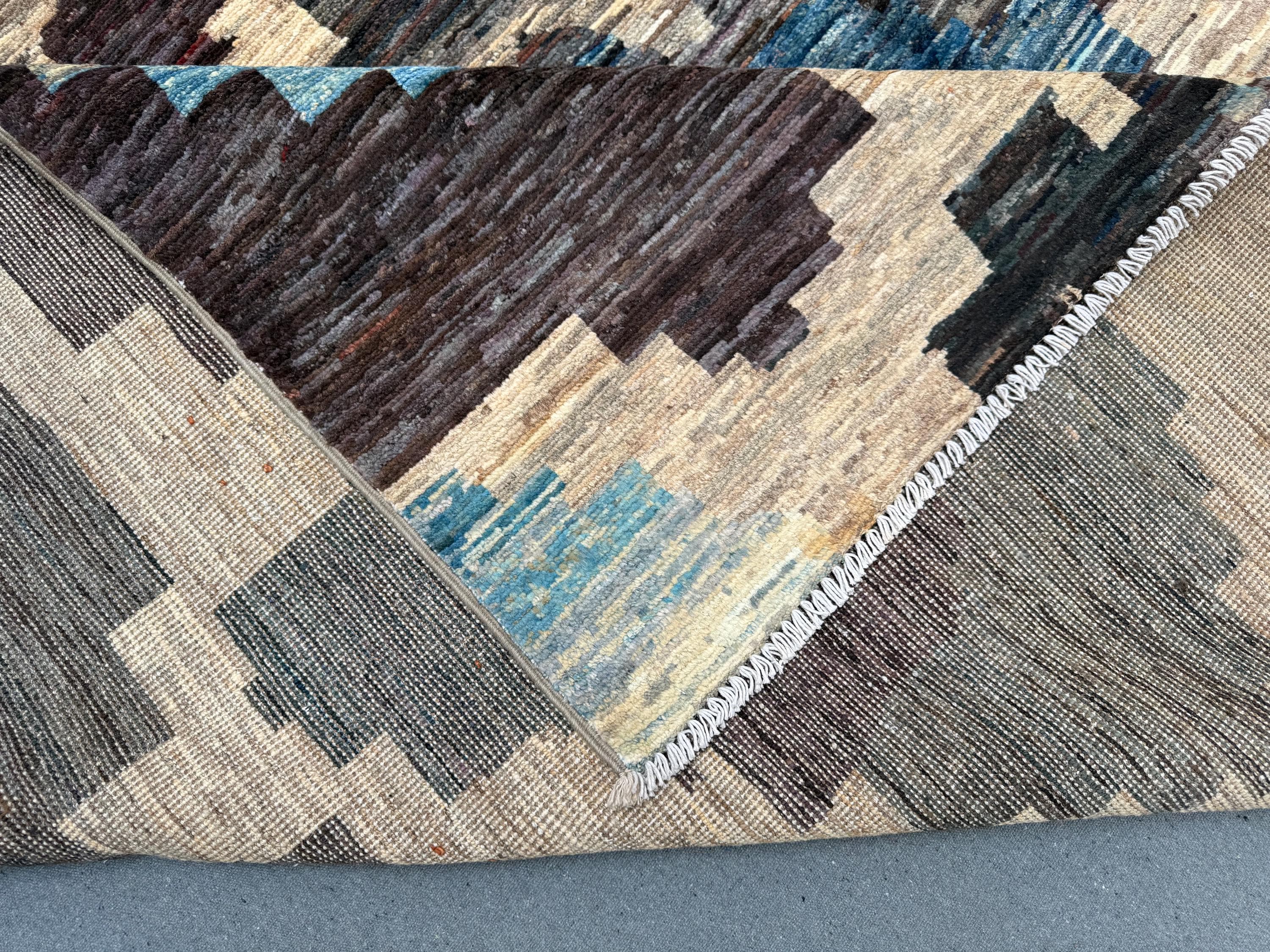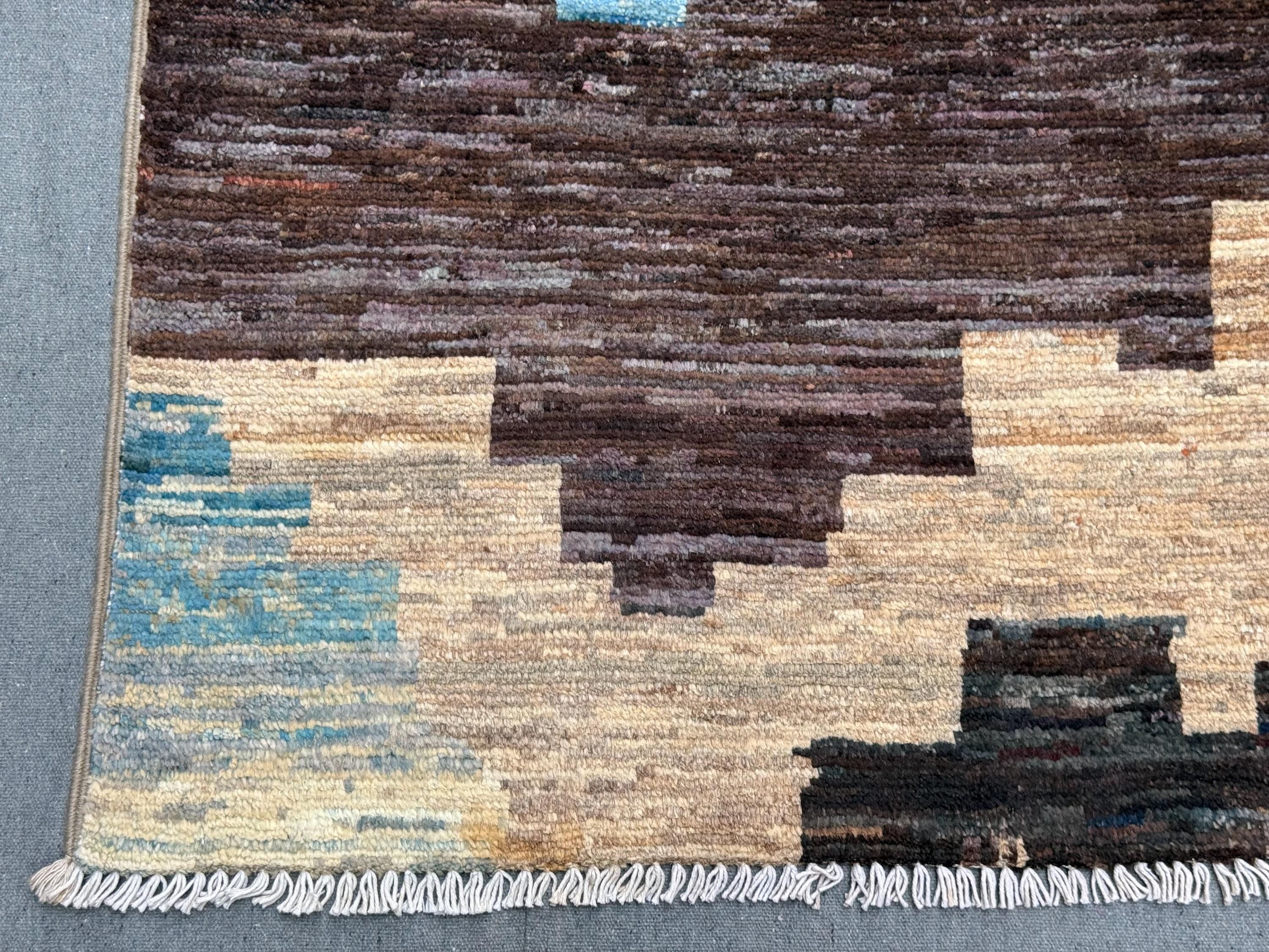 Handmade Moroccan Style Rug 7x8 ft Modern Abstract Geometric Wool Area Rug in Neutral Tones with Blue & Brown Accents