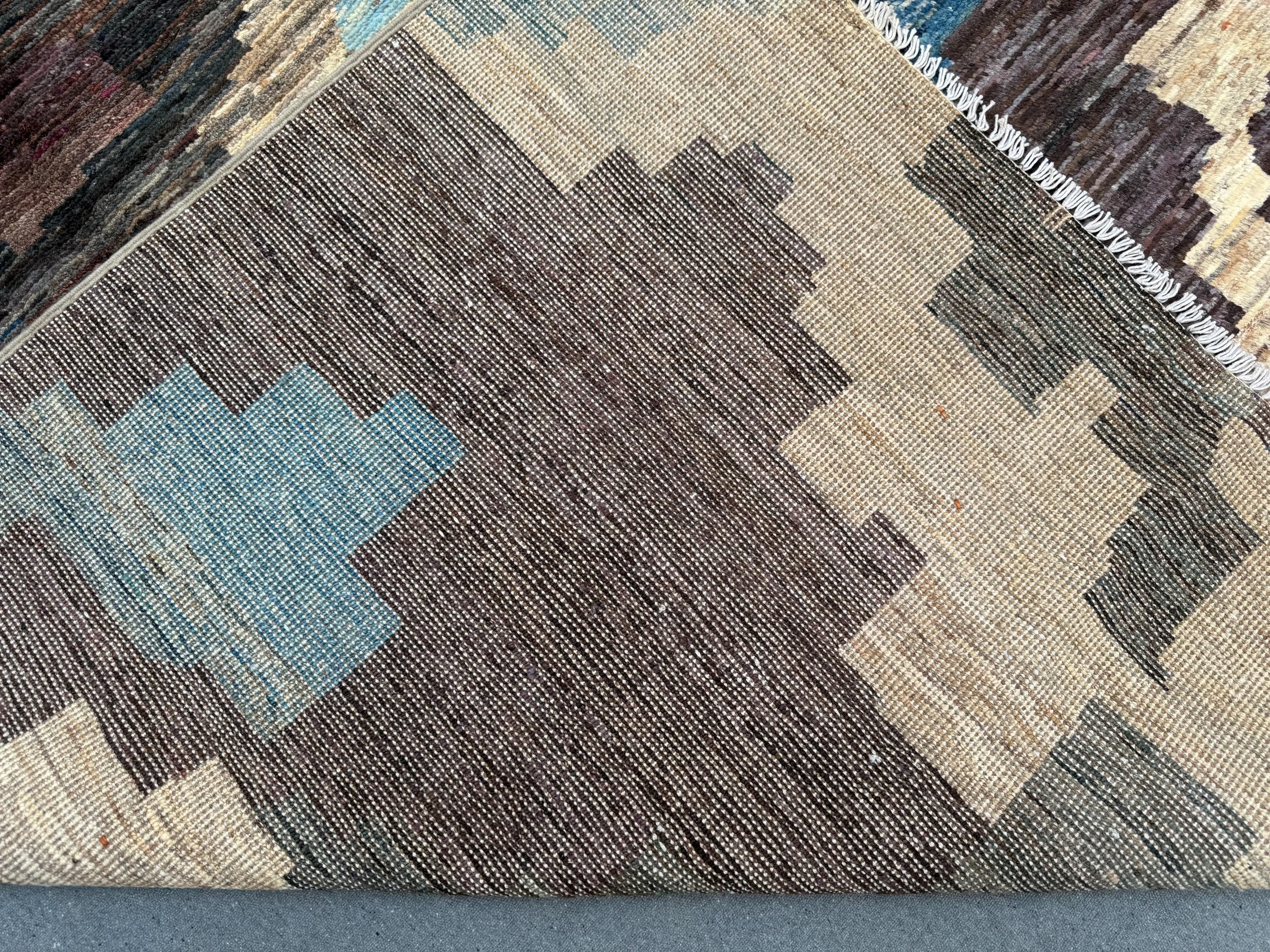This handmade Moroccan-style wool rug showcases a bold abstract geometric composition with layered shapes and natural movement. A rich blend of neutral tones—ivory, beige, charcoal, brown, and soft gray—is accented with touches of muted blue and subtle earthy hues, creating depth without overpowering your space.