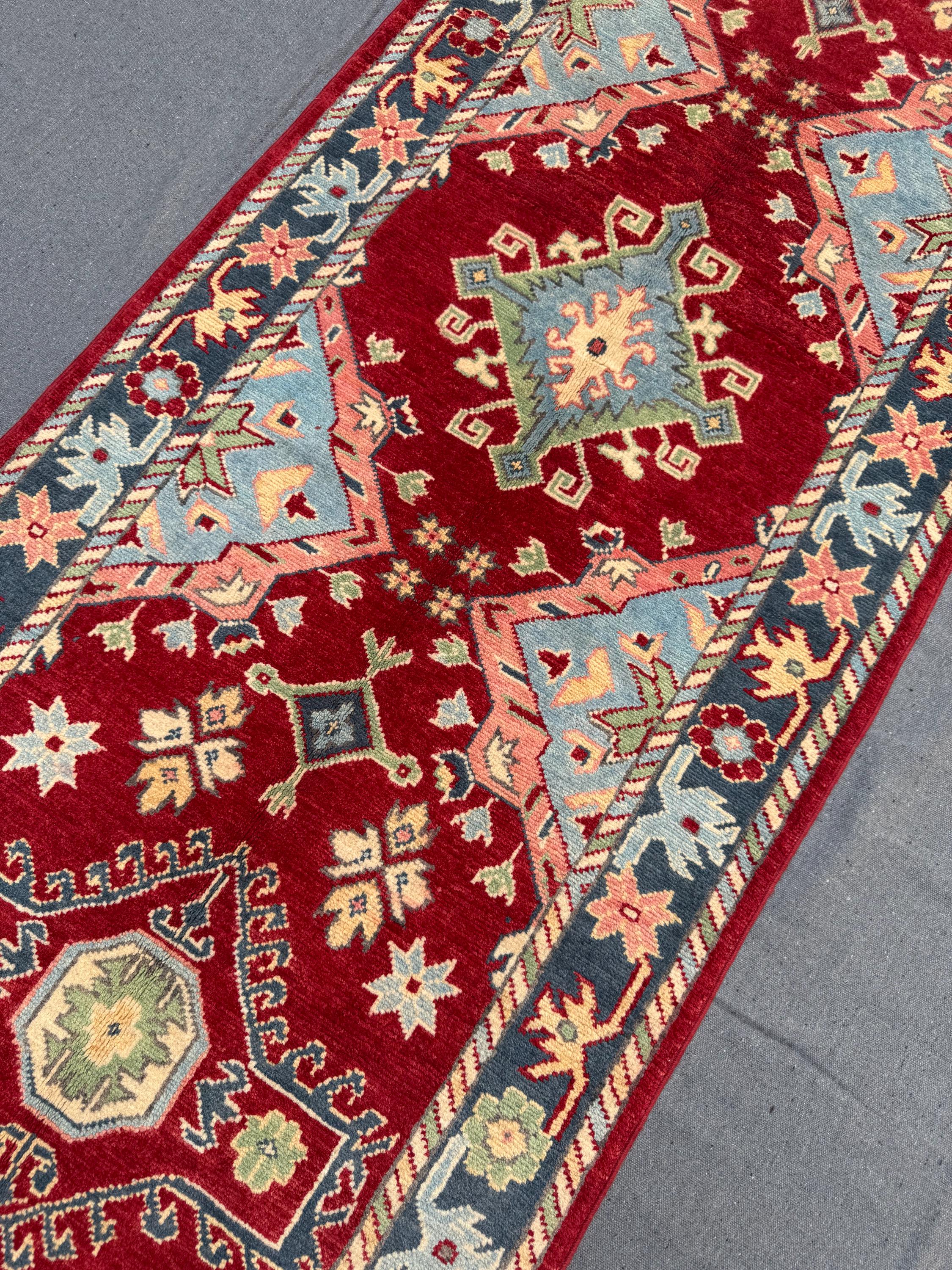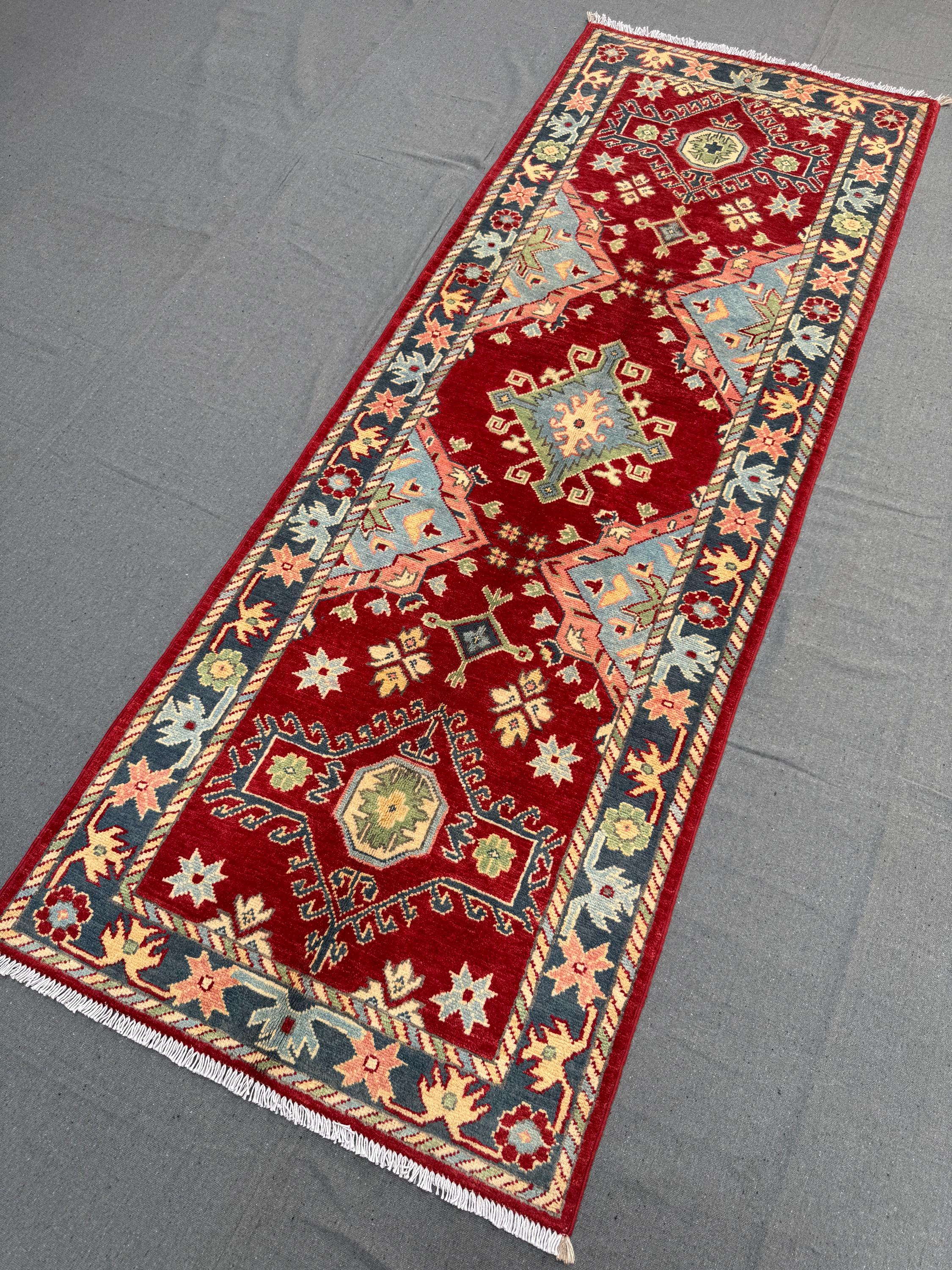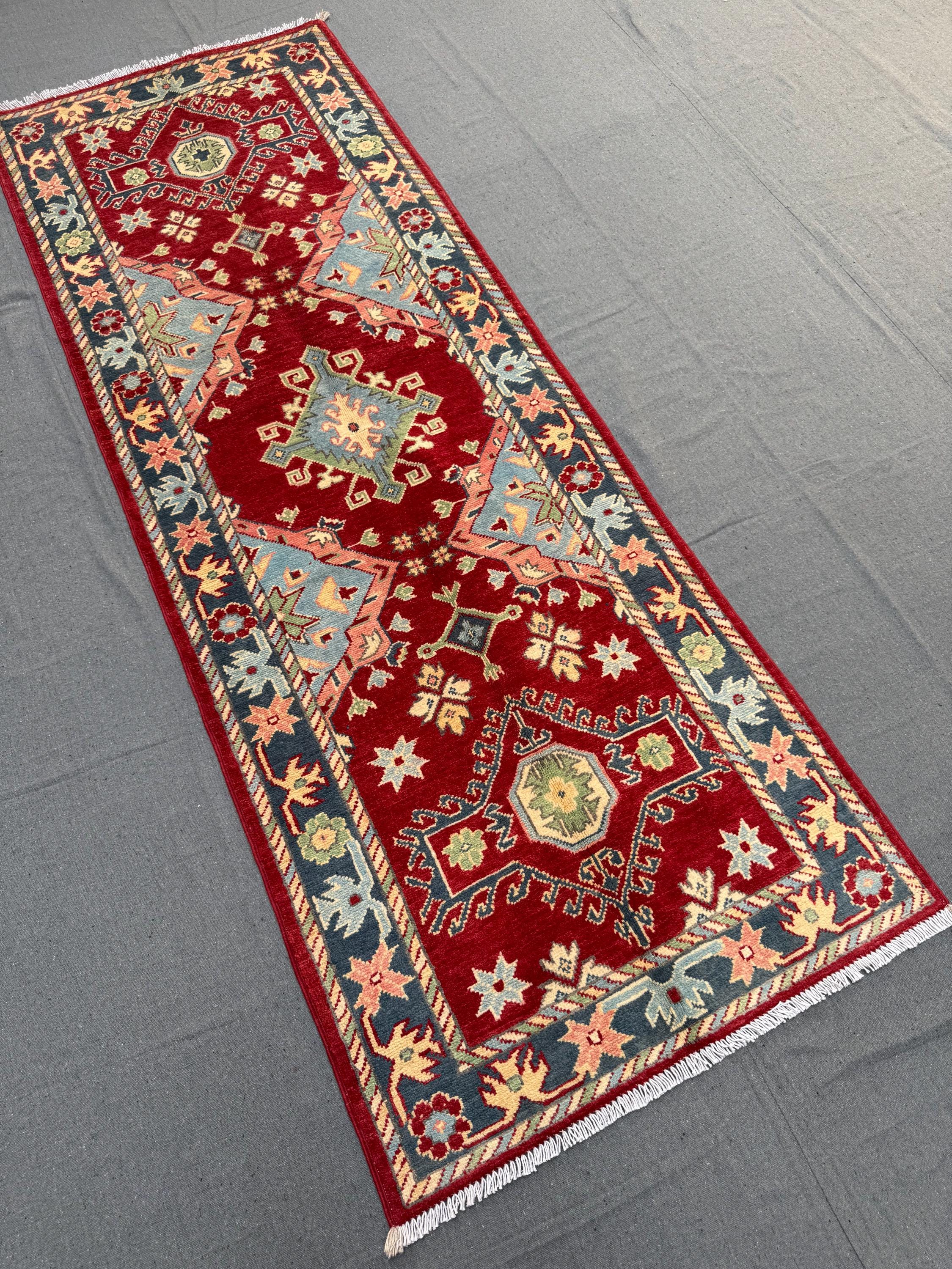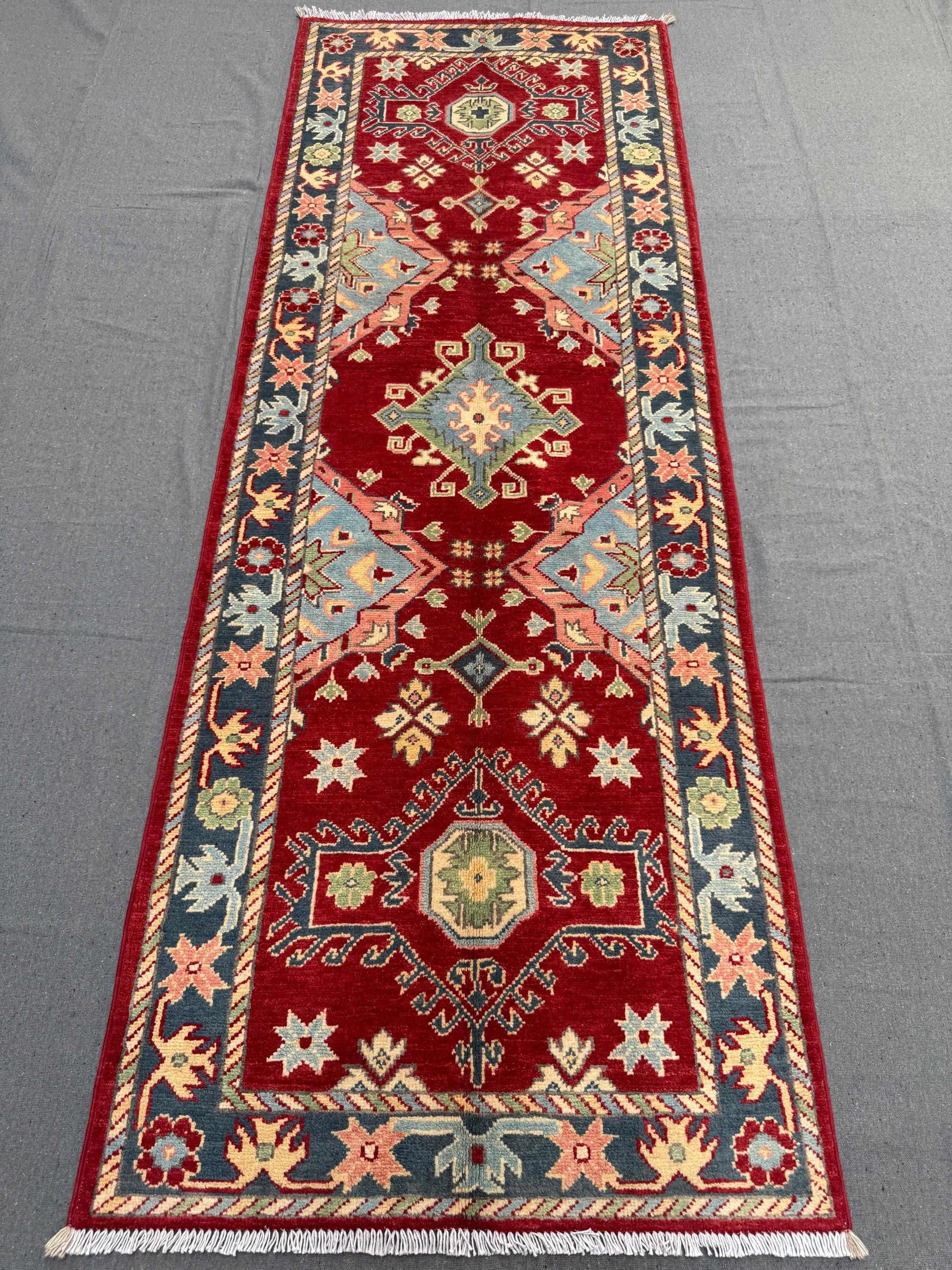 This 2.7x7.2 Kazak runner rug features a stunning deep red base accented with blue borders and intricate tribal medallions in gold, ivory, and green. Its traditional geometric motifs are inspired by authentic Kazak artistry, bringing warmth and sophistication to narrow spaces.