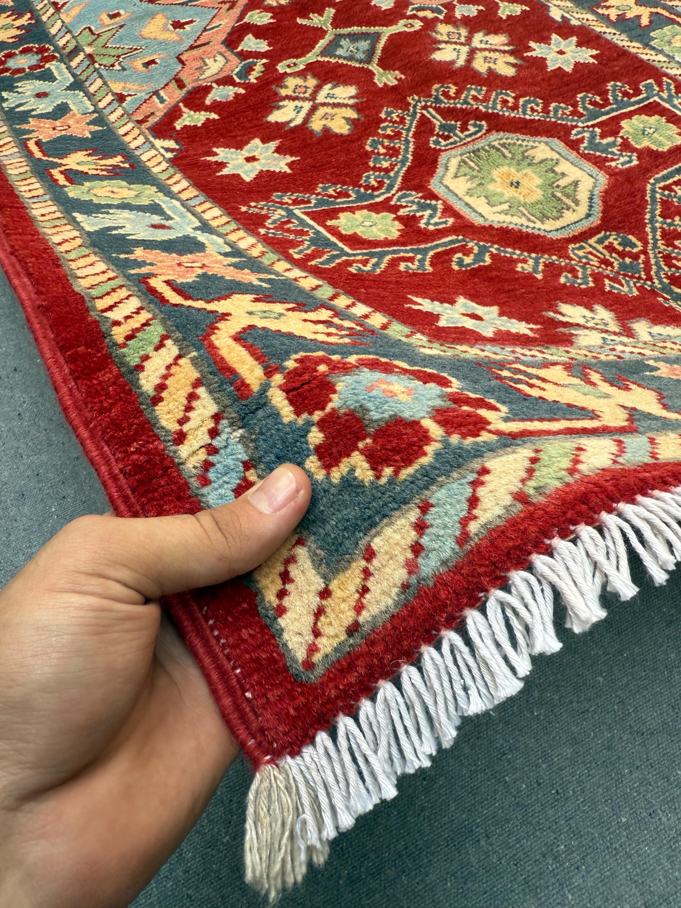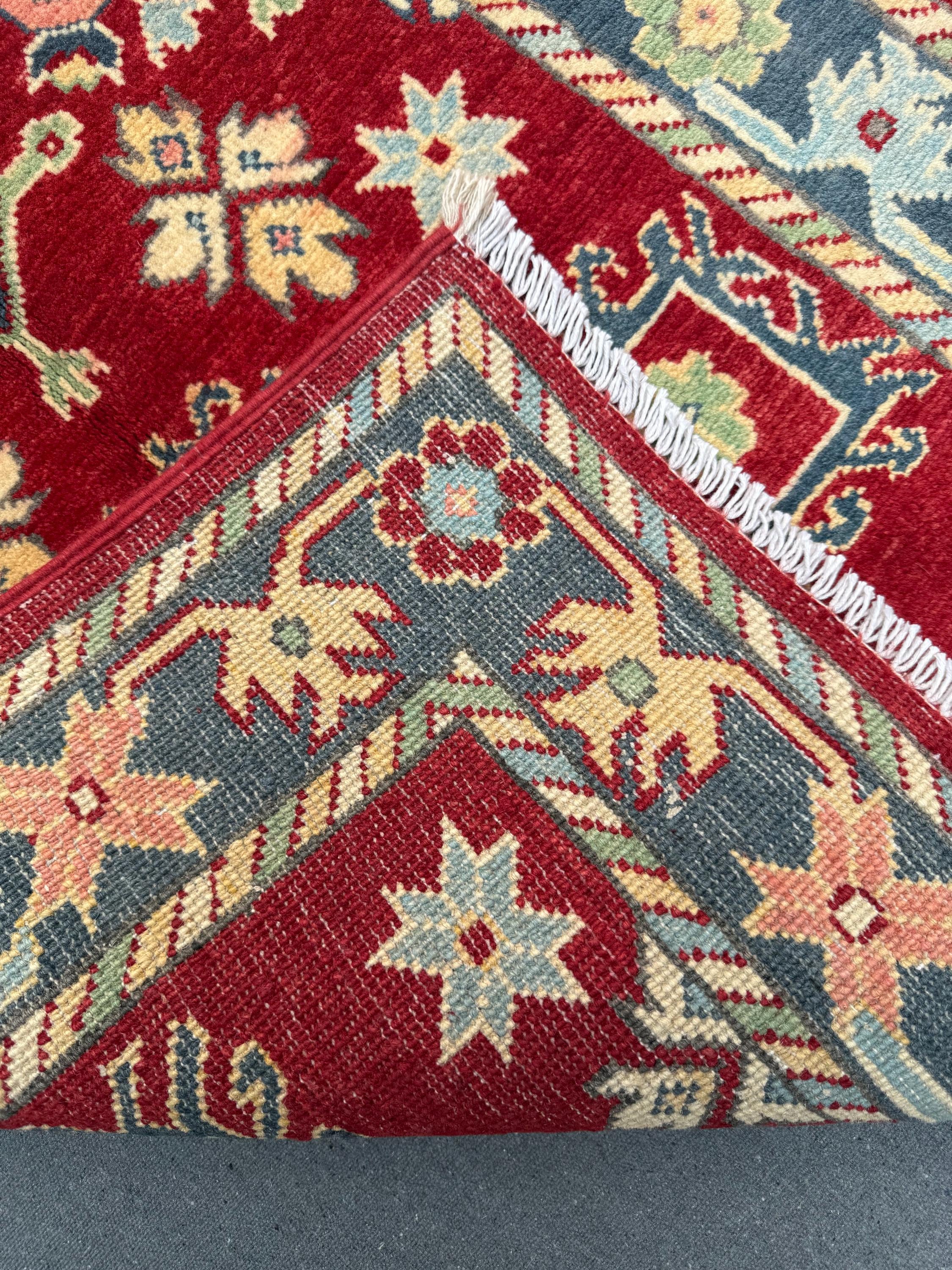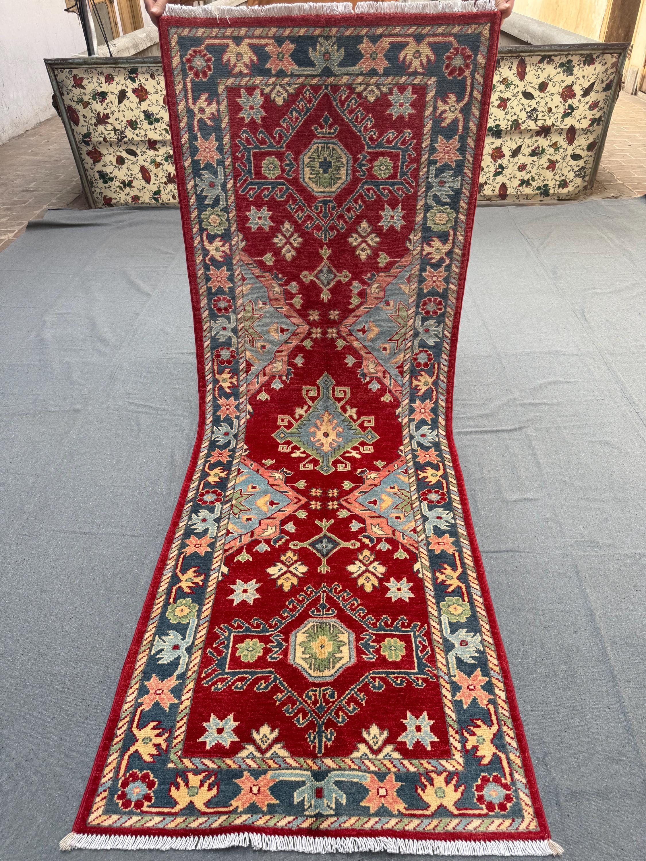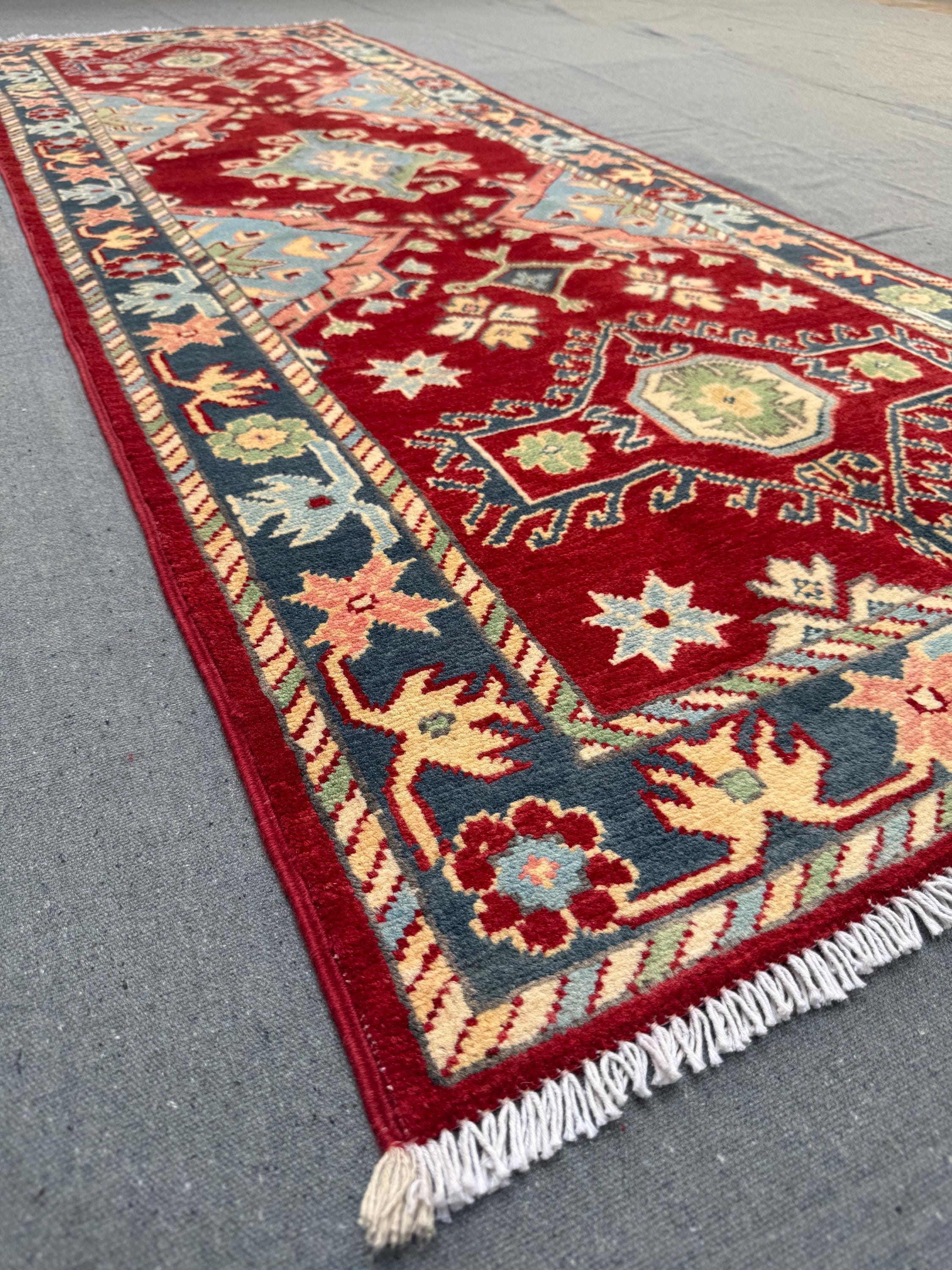 This 2.7x7.2 Kazak runner rug features a stunning deep red base accented with blue borders and intricate tribal medallions in gold, ivory, and green. Its traditional geometric motifs are inspired by authentic Kazak artistry, bringing warmth and sophistication to narrow spaces.