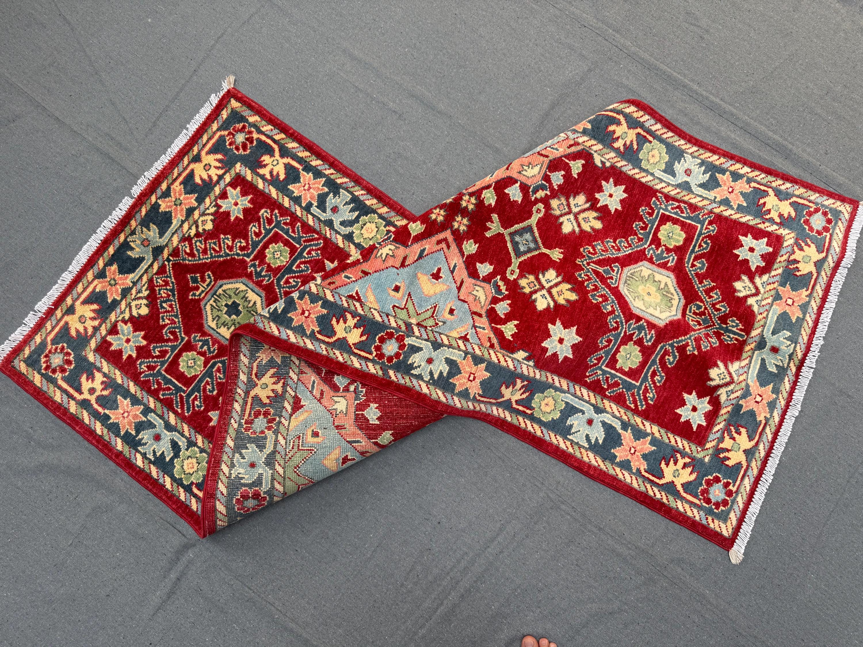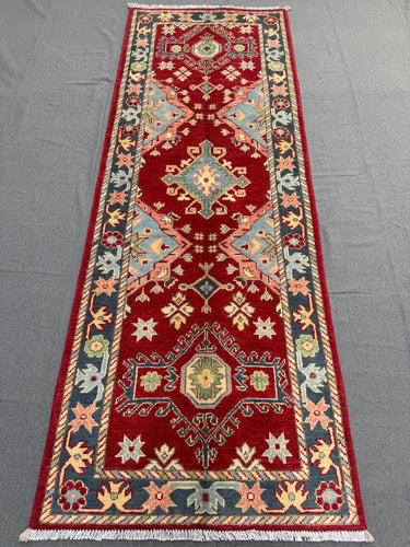 2.7x7.2 Kazak Runner Rug Red and Blue Wool Hallway Runner with Geometric Tribal Design, Handmade-Style Oriental Corridor Carpet
