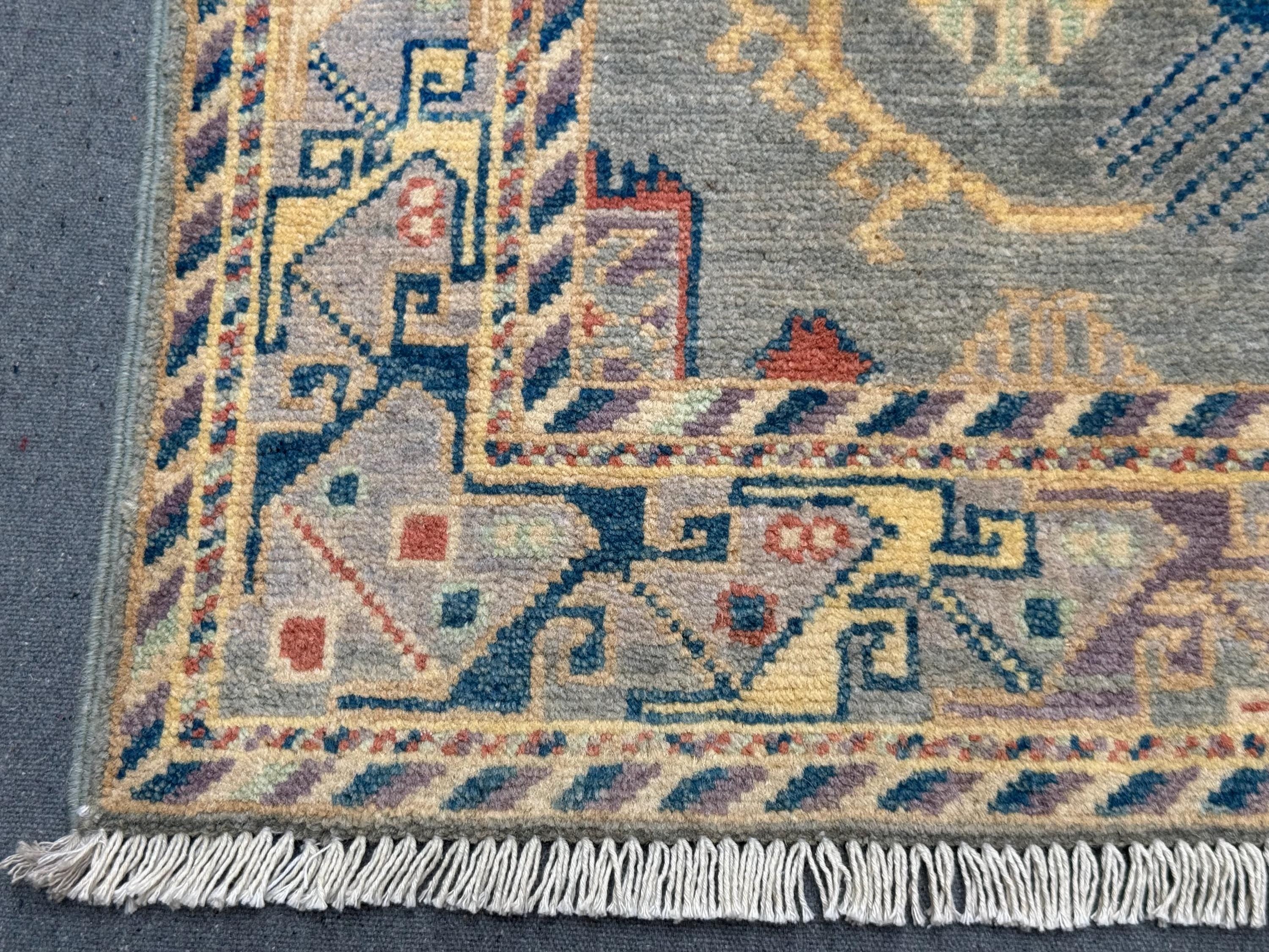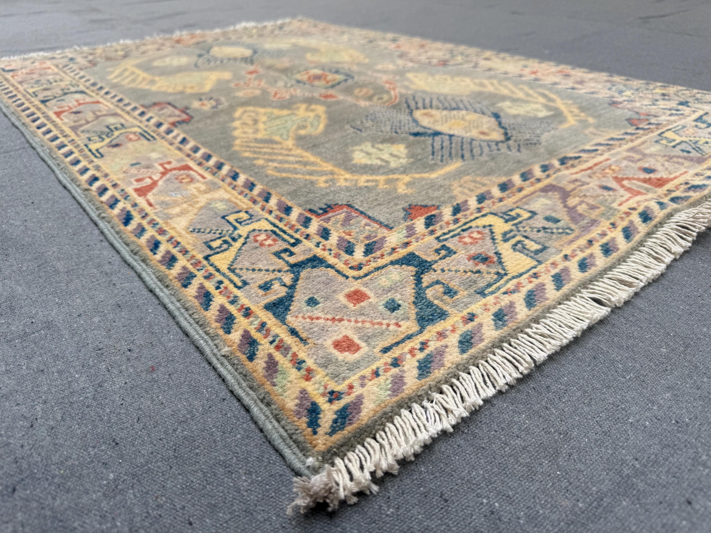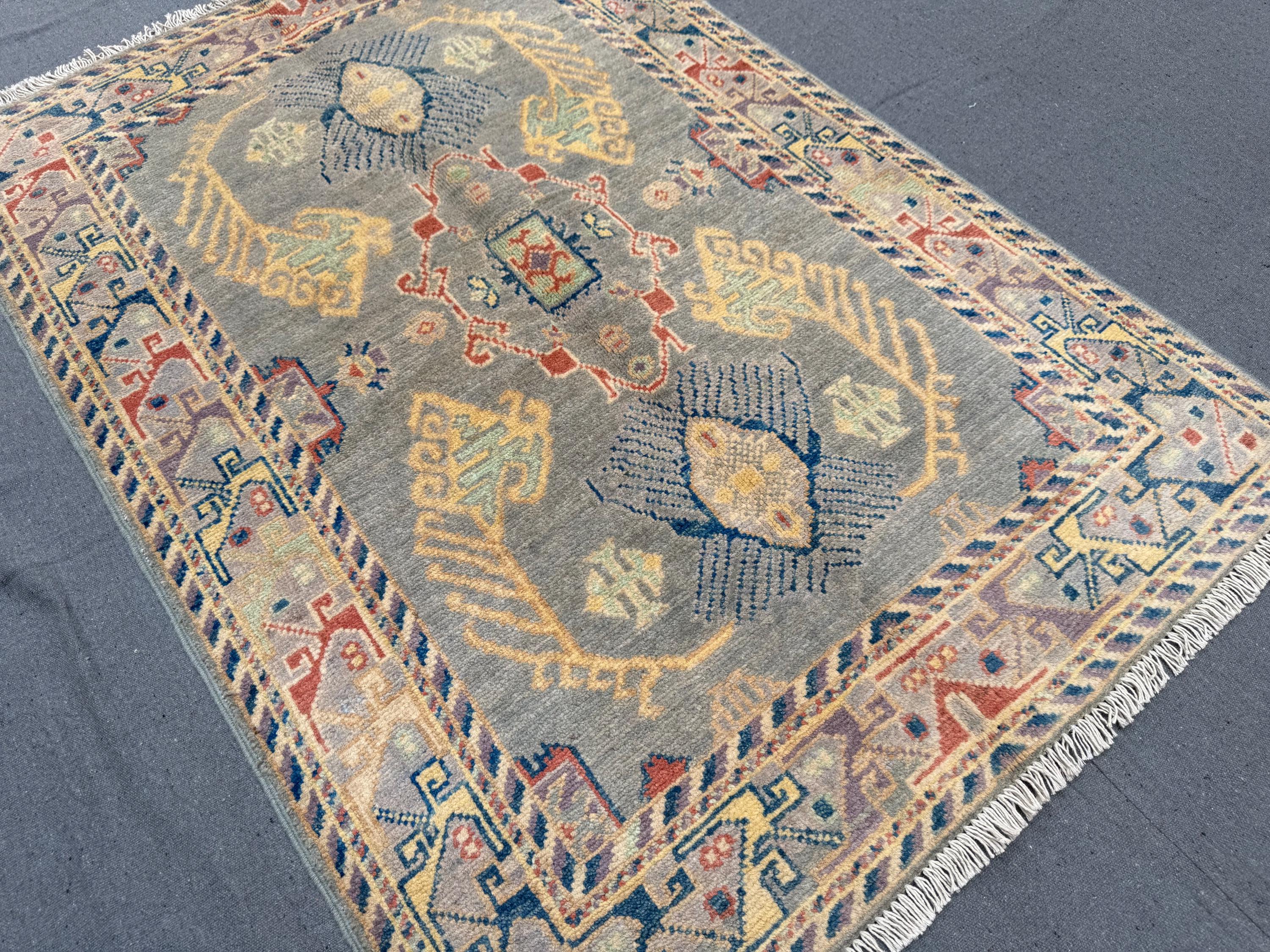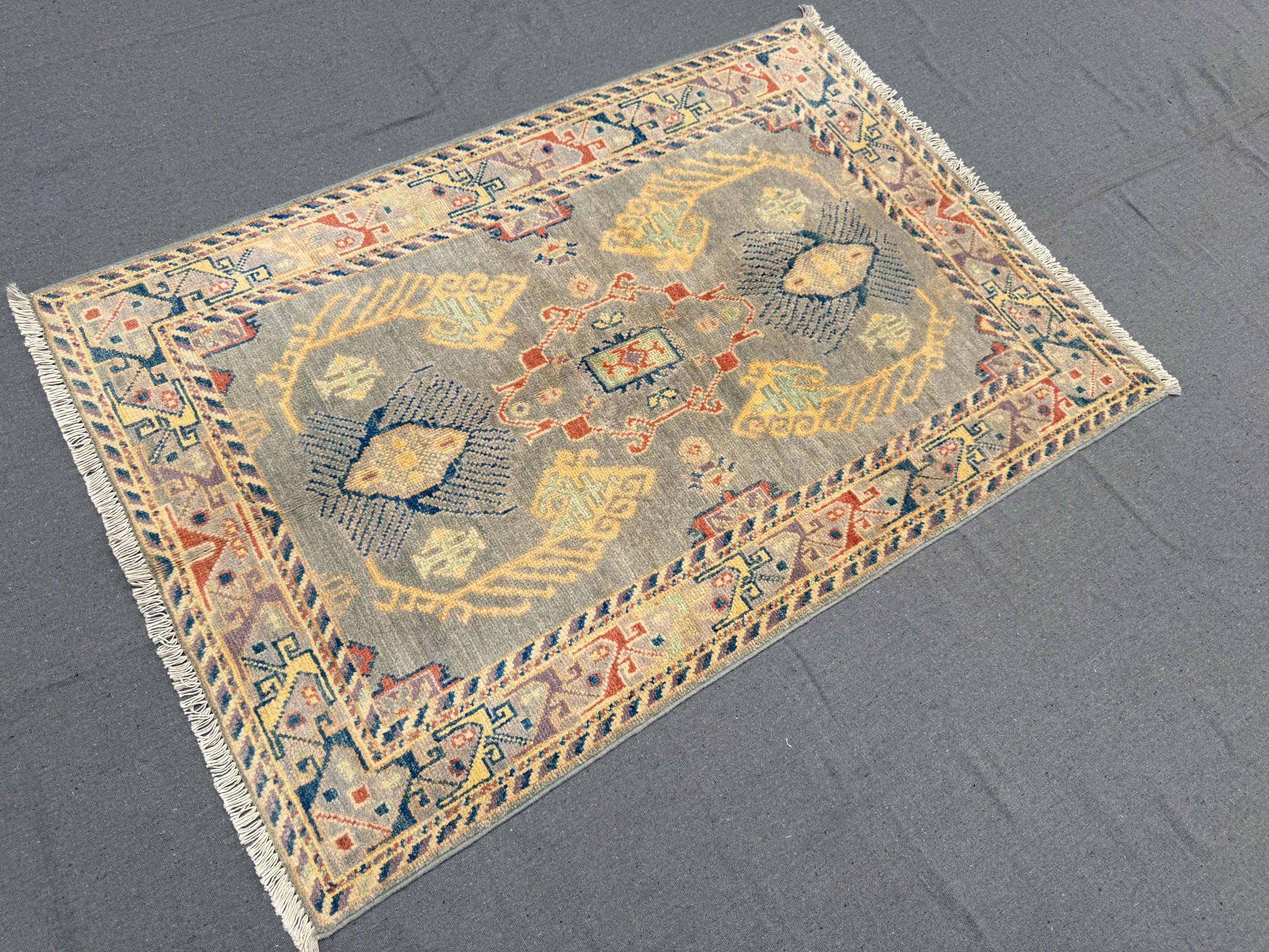 2.9x4 Kazak Rug Muted Wool Area Carpet with Tribal Medallion Design, Gray & Gold Geometric Handwoven-Style Wool Rug for Living Room
