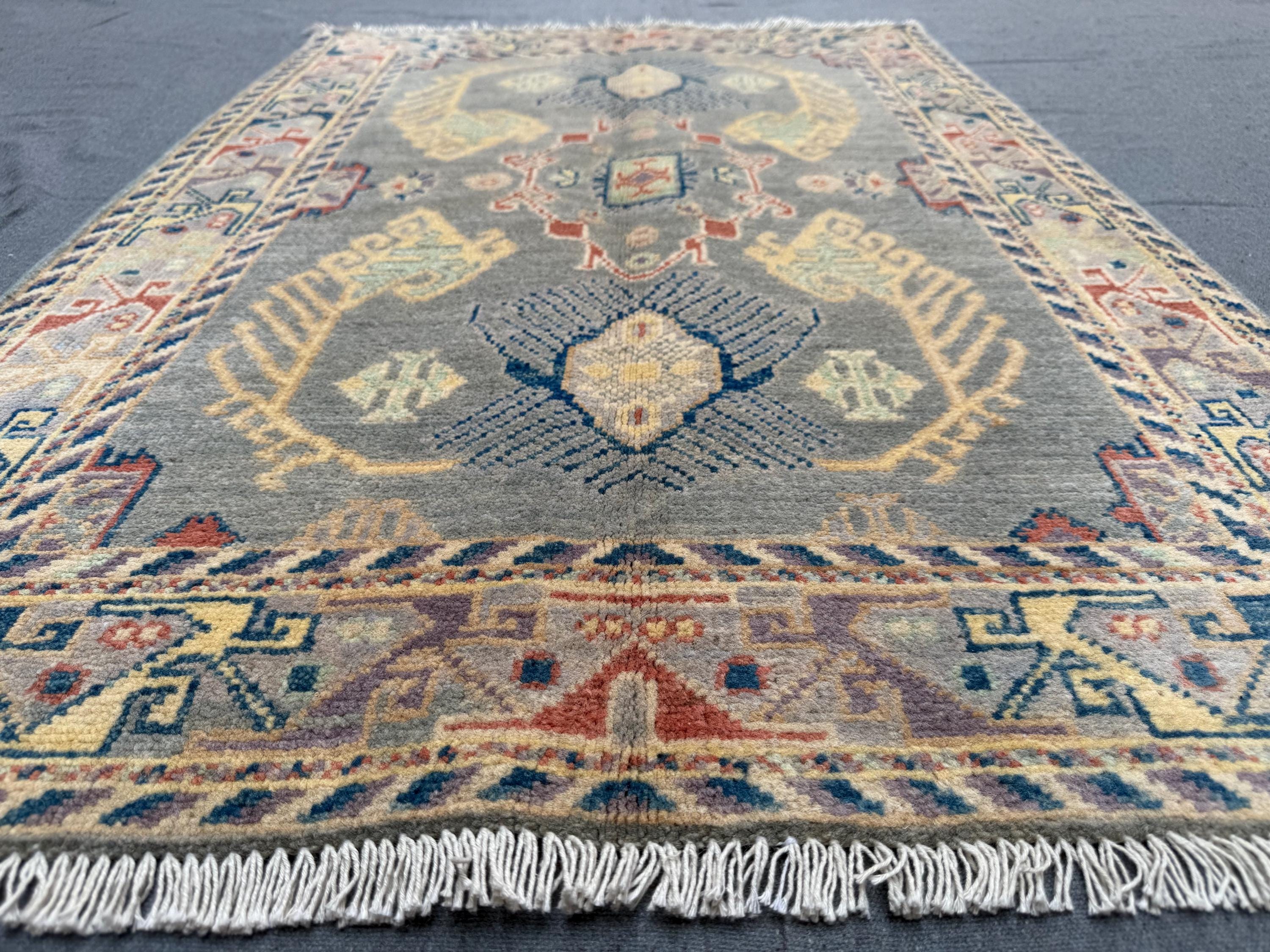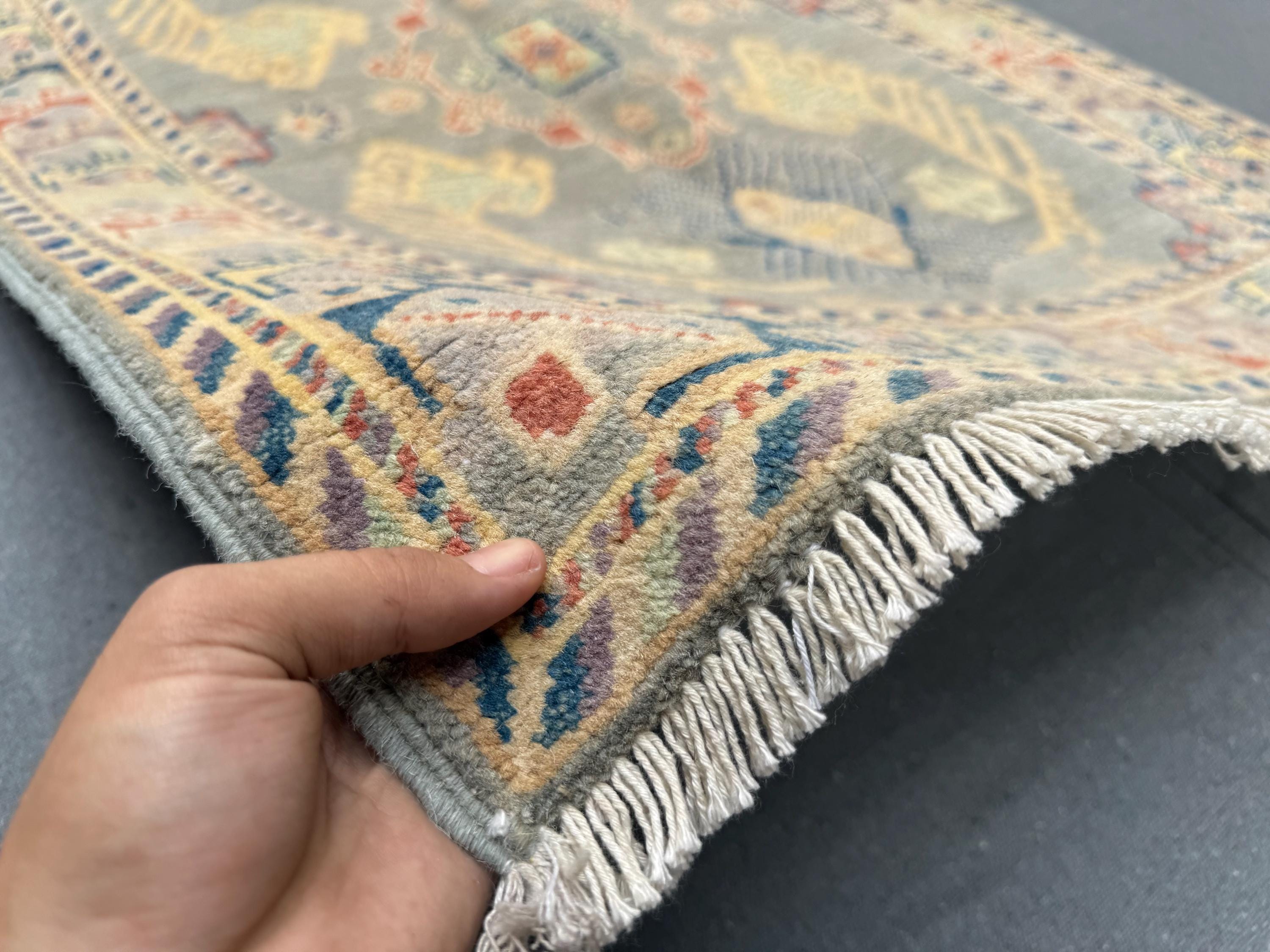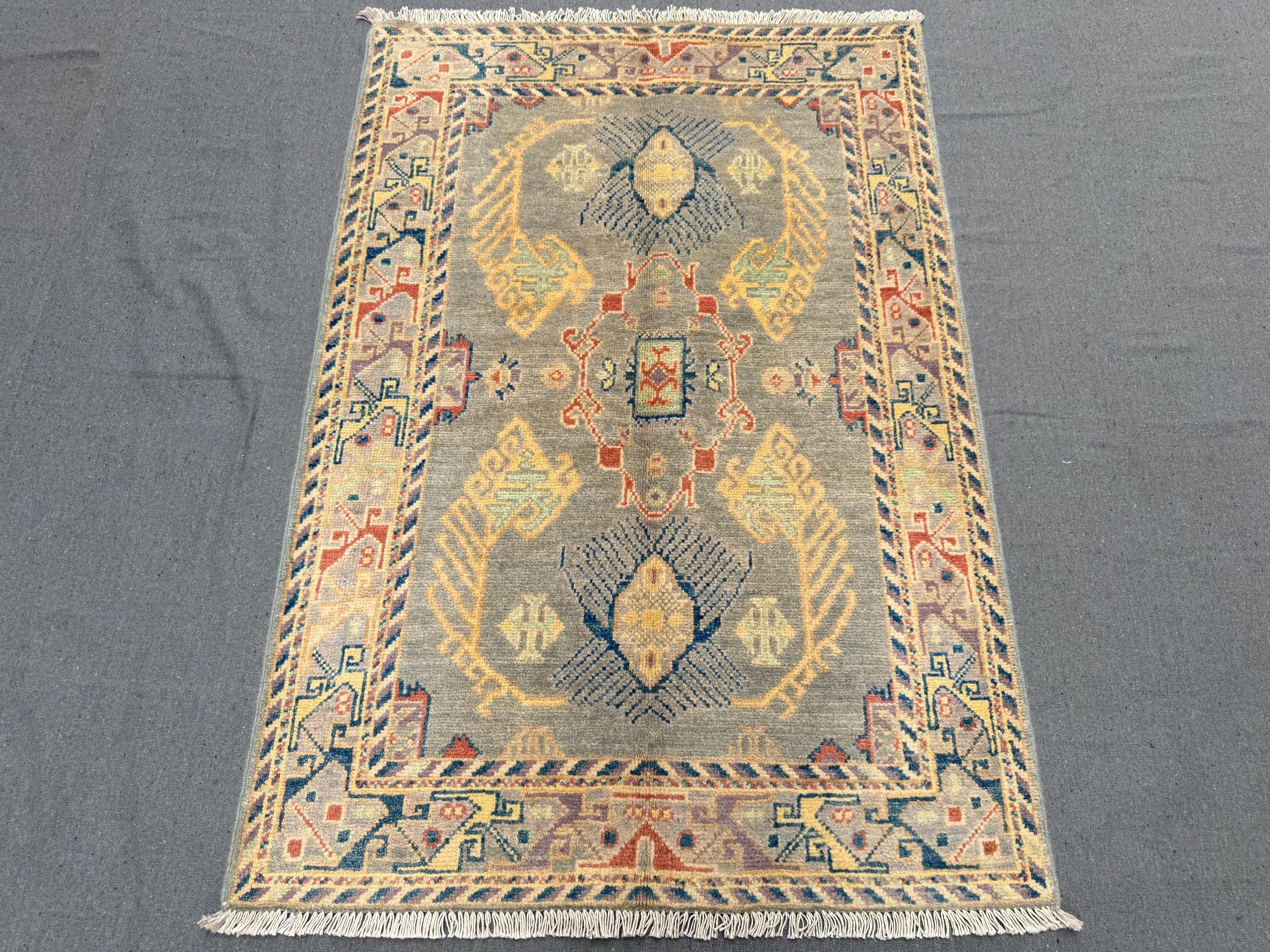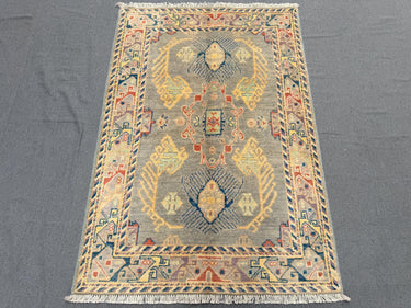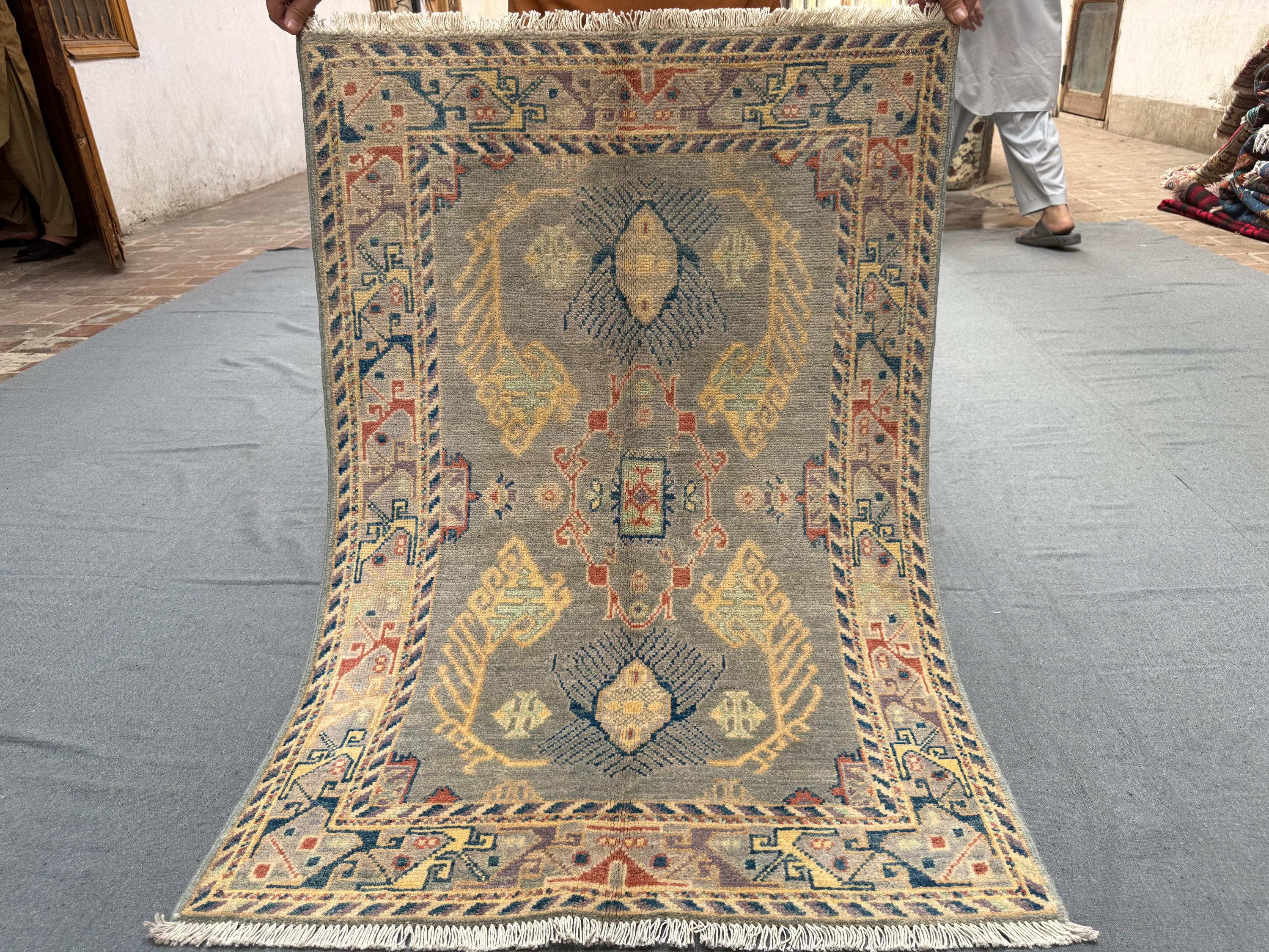 2.9x4 Kazak Rug Muted Wool Area Carpet with Tribal Medallion Design, Gray & Gold Geometric Handwoven-Style Wool Rug for Living Room