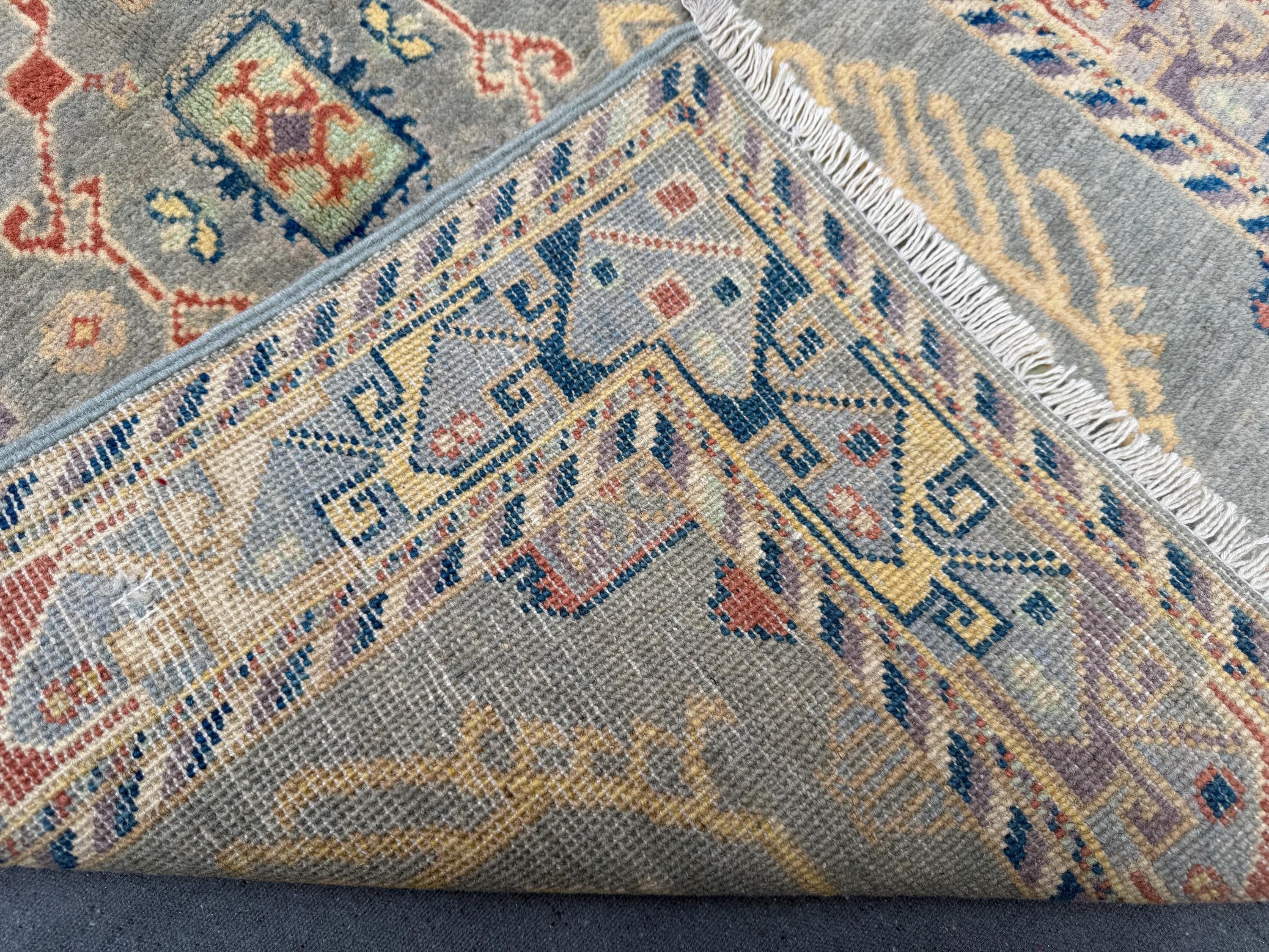 Measuring 7.11 x 10 ft (243 x 306 cm) , this rug is perfectly sized for living rooms, dining spaces, or offices, bringing warmth and artistry to large interiors. Its construction with hand-spun wool and vegetable dyes ensures durability and natural beauty, while the dense knotting makes it built to last for generations.