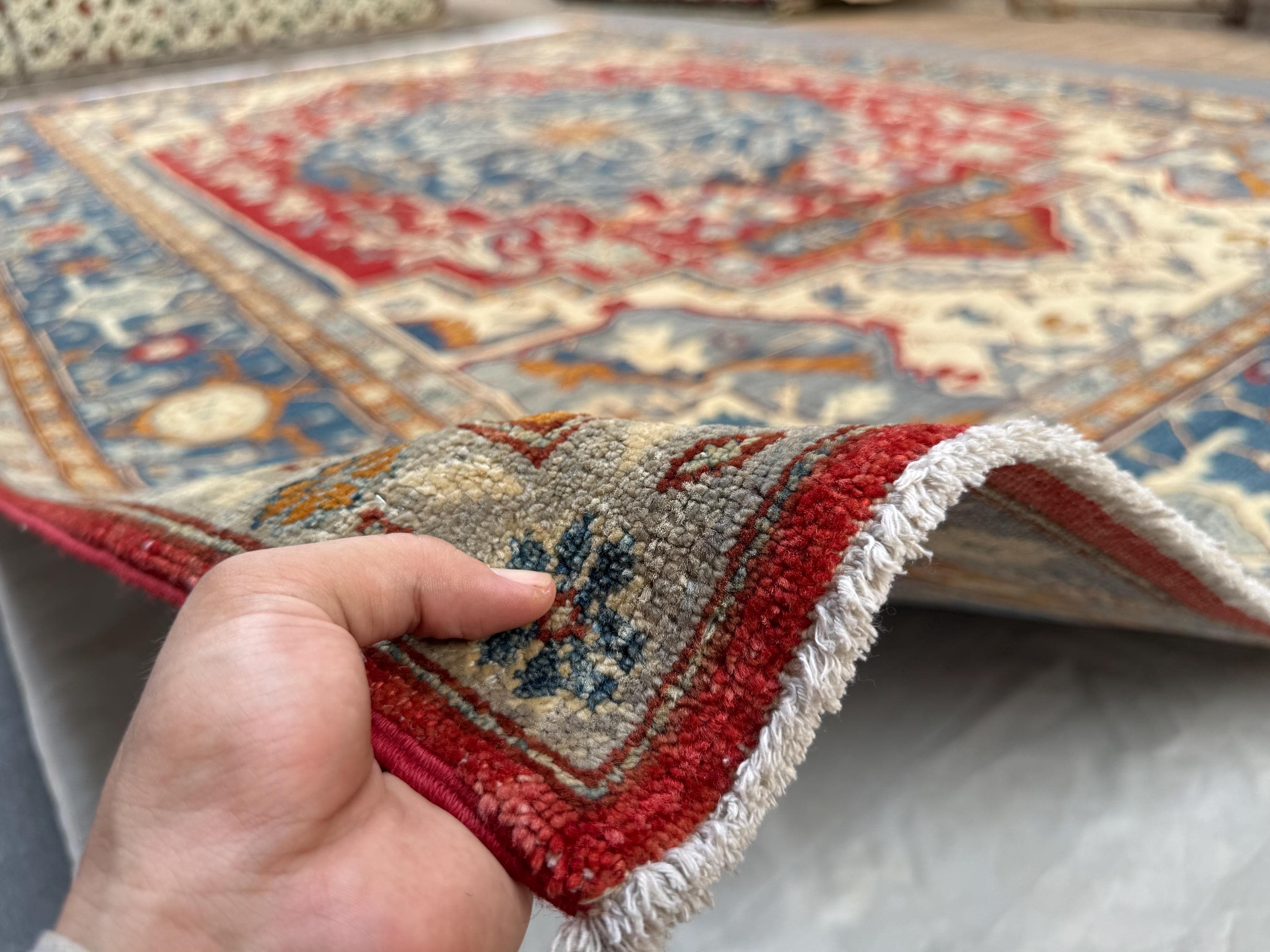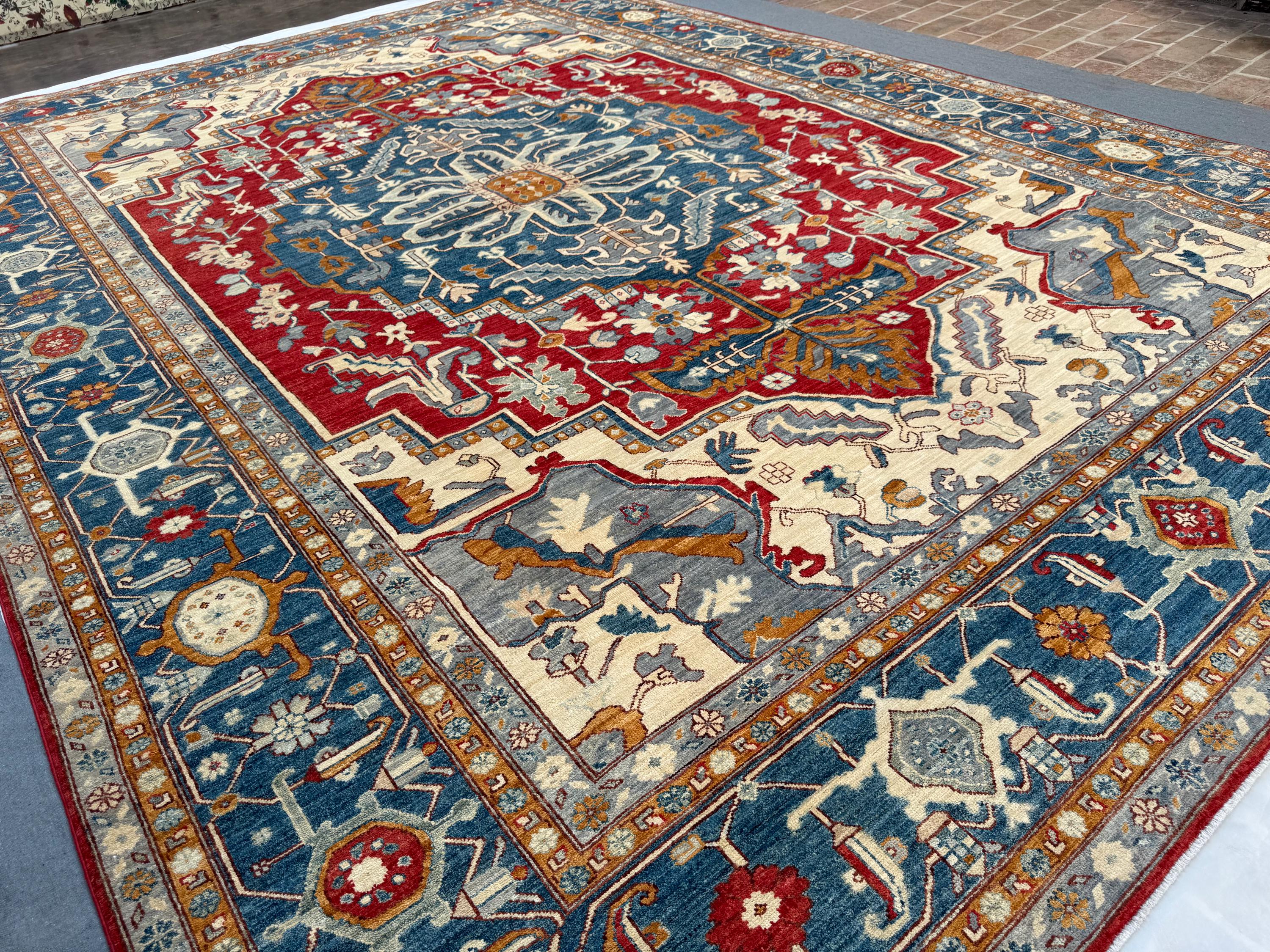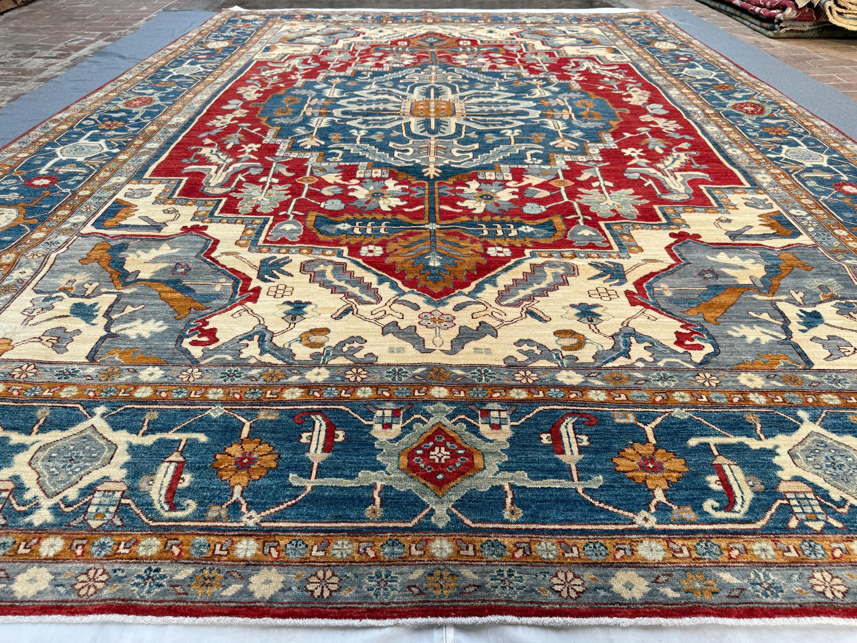 Afghan Heriz Rug 10x14 ft Hand-Knotted Wool Large Tribal Carpet, Red Blue Ivory Geometric Medallion Area Rug, Vintage Style 304x427 cm