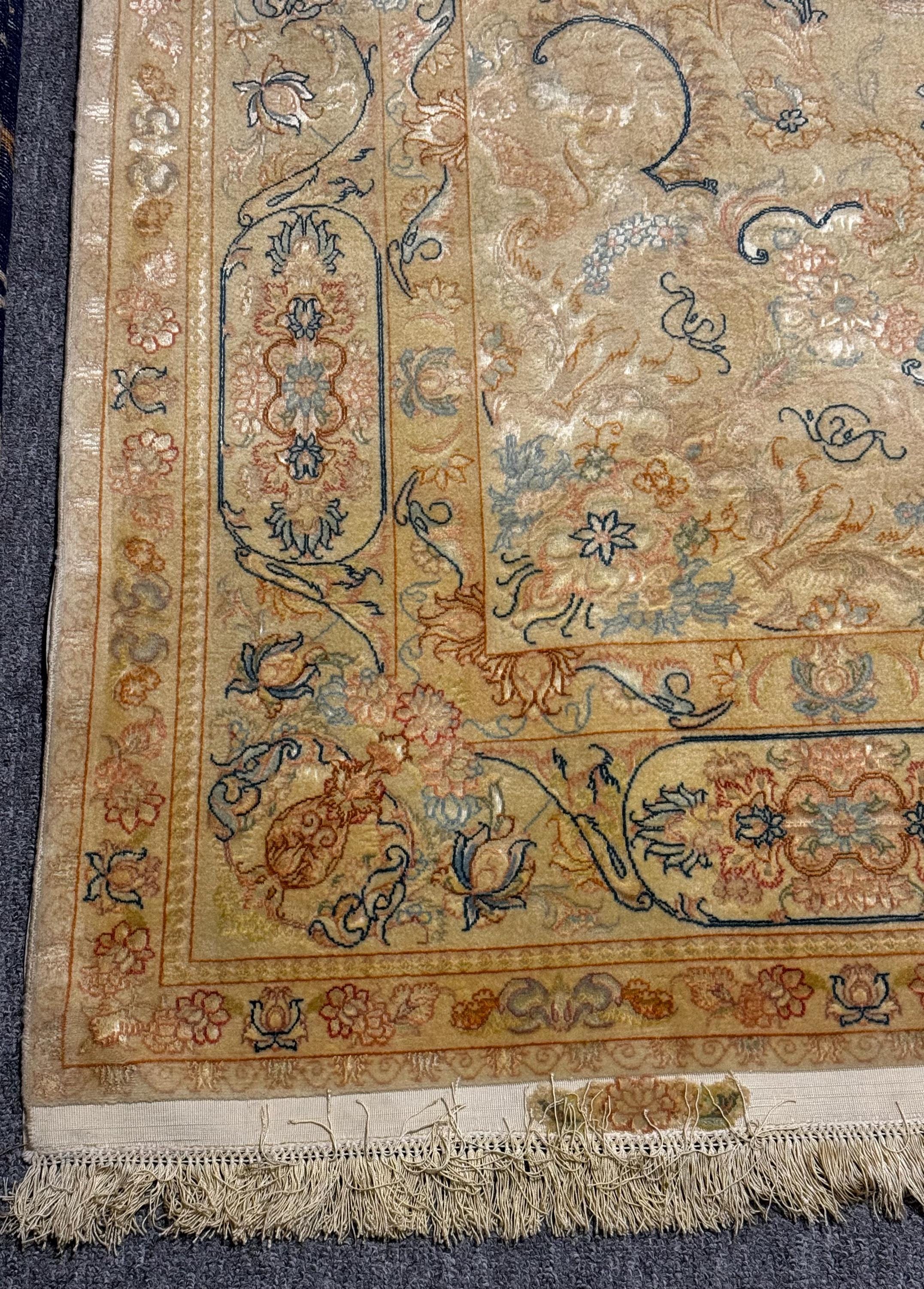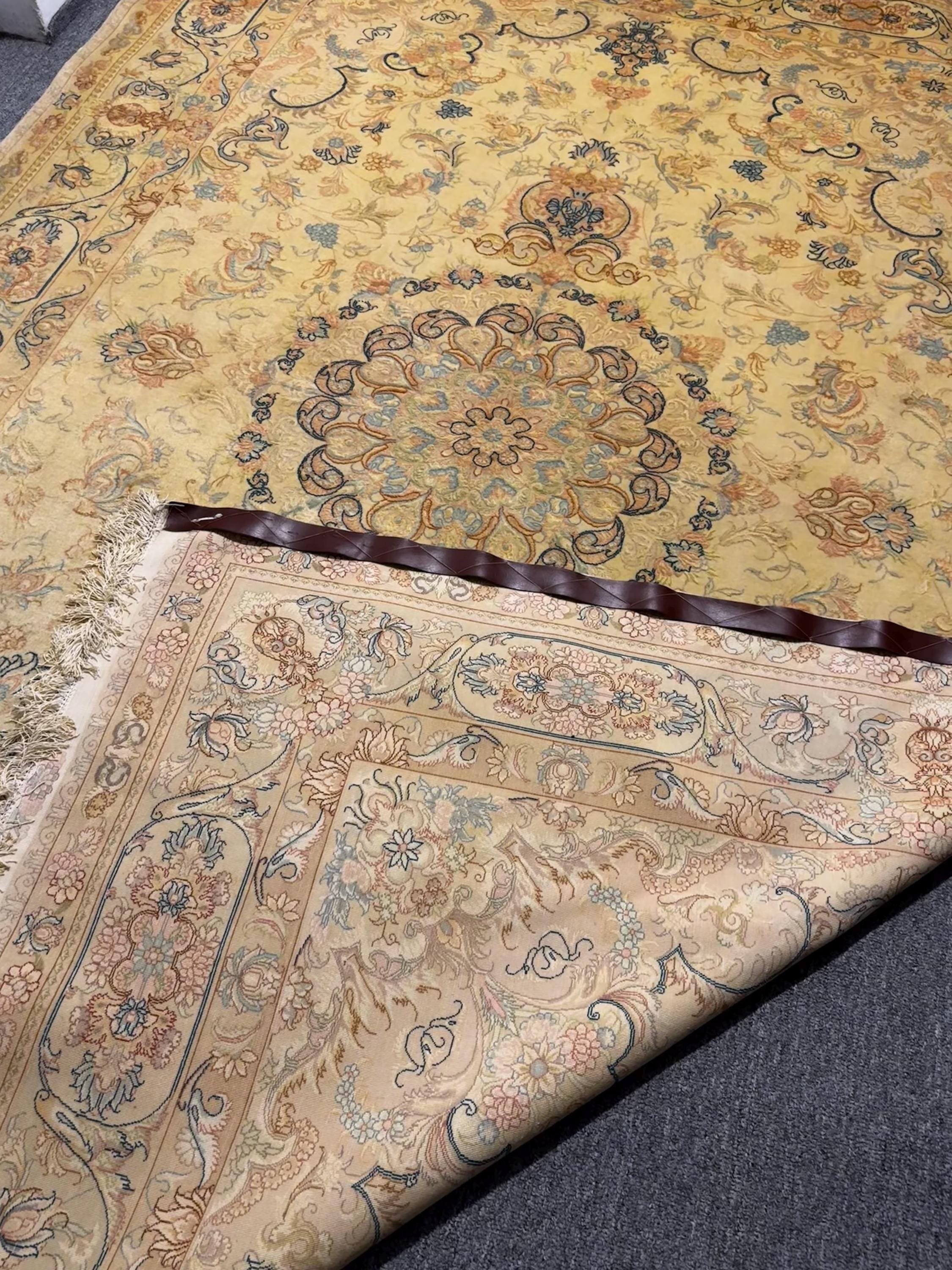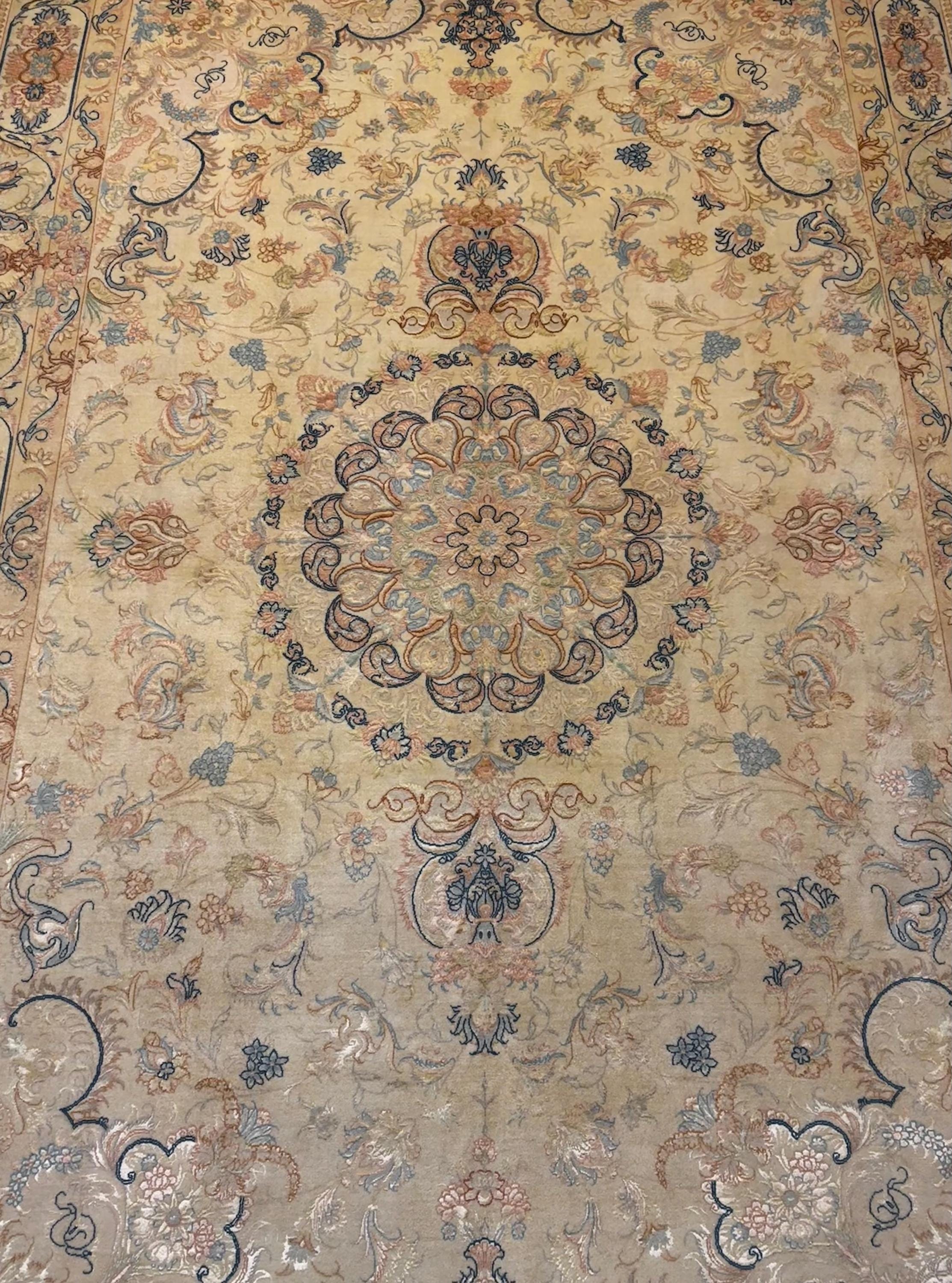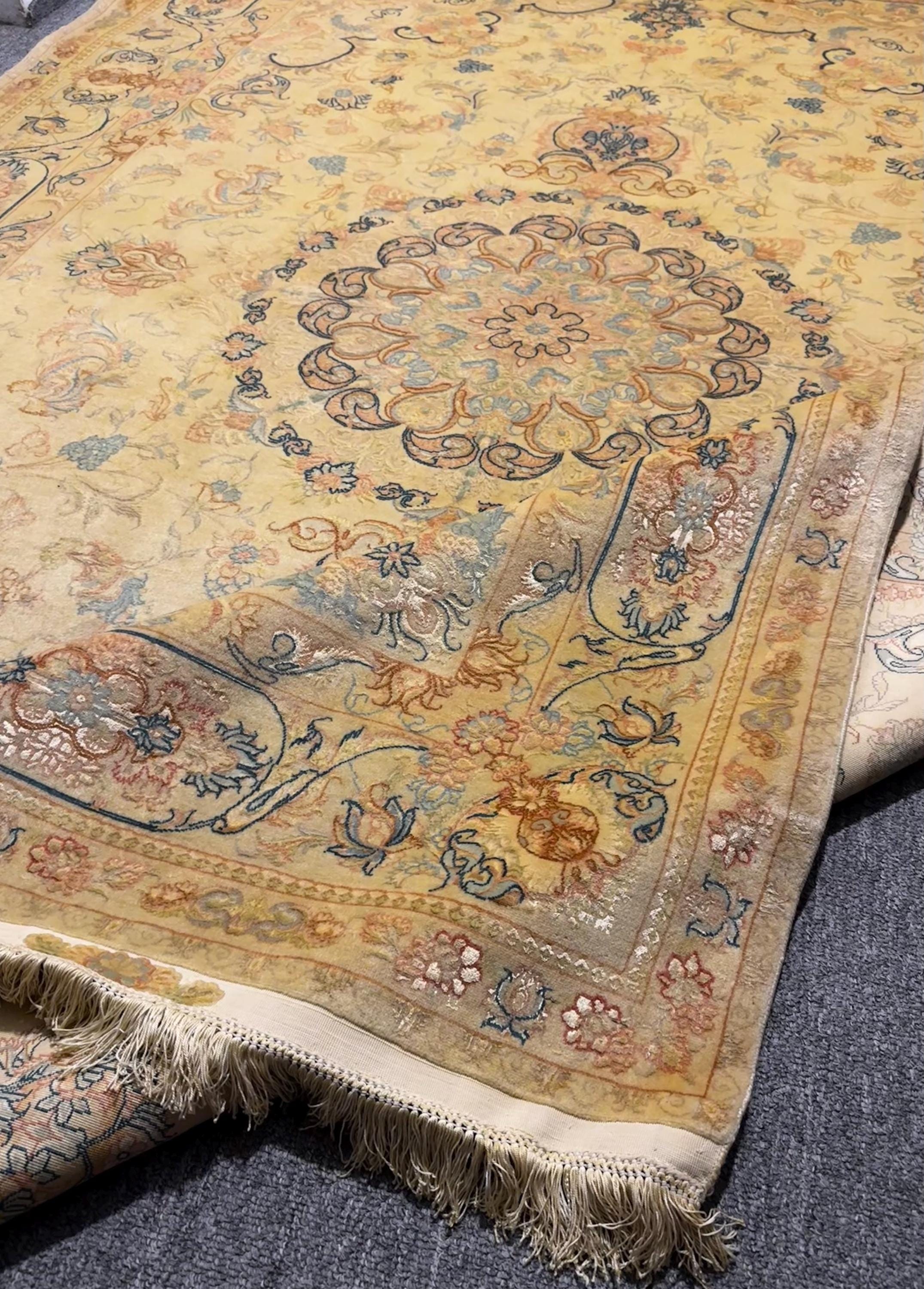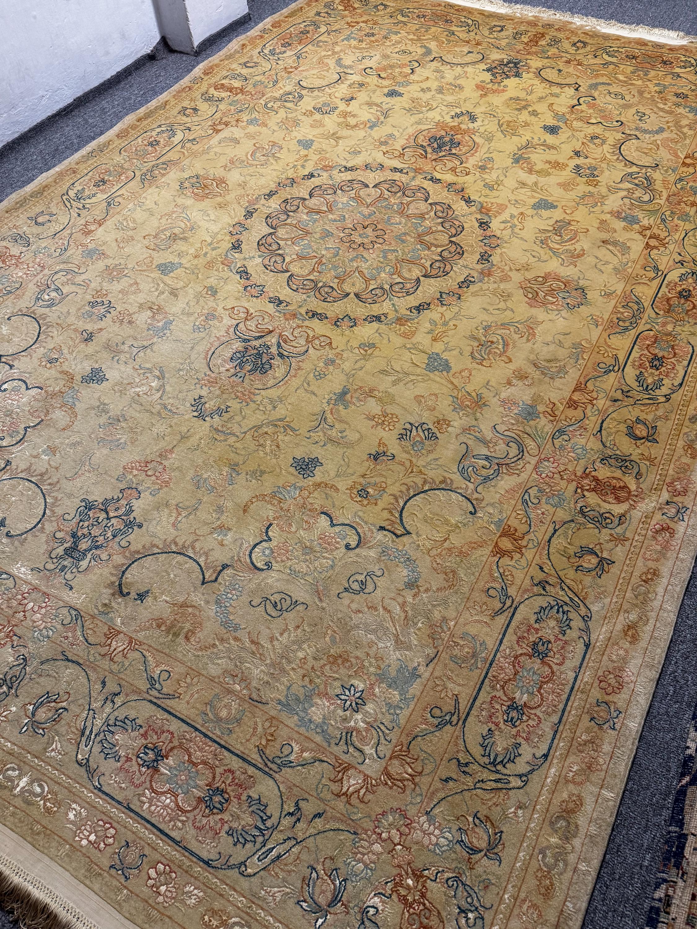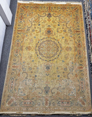 Golden Amber Shahi Tabriz Wool & Silk Rug 6x10 ft Handmade Floral Medallion Carpet, Luxury Yellow Beige Oriental Area Rug for Large Spaces