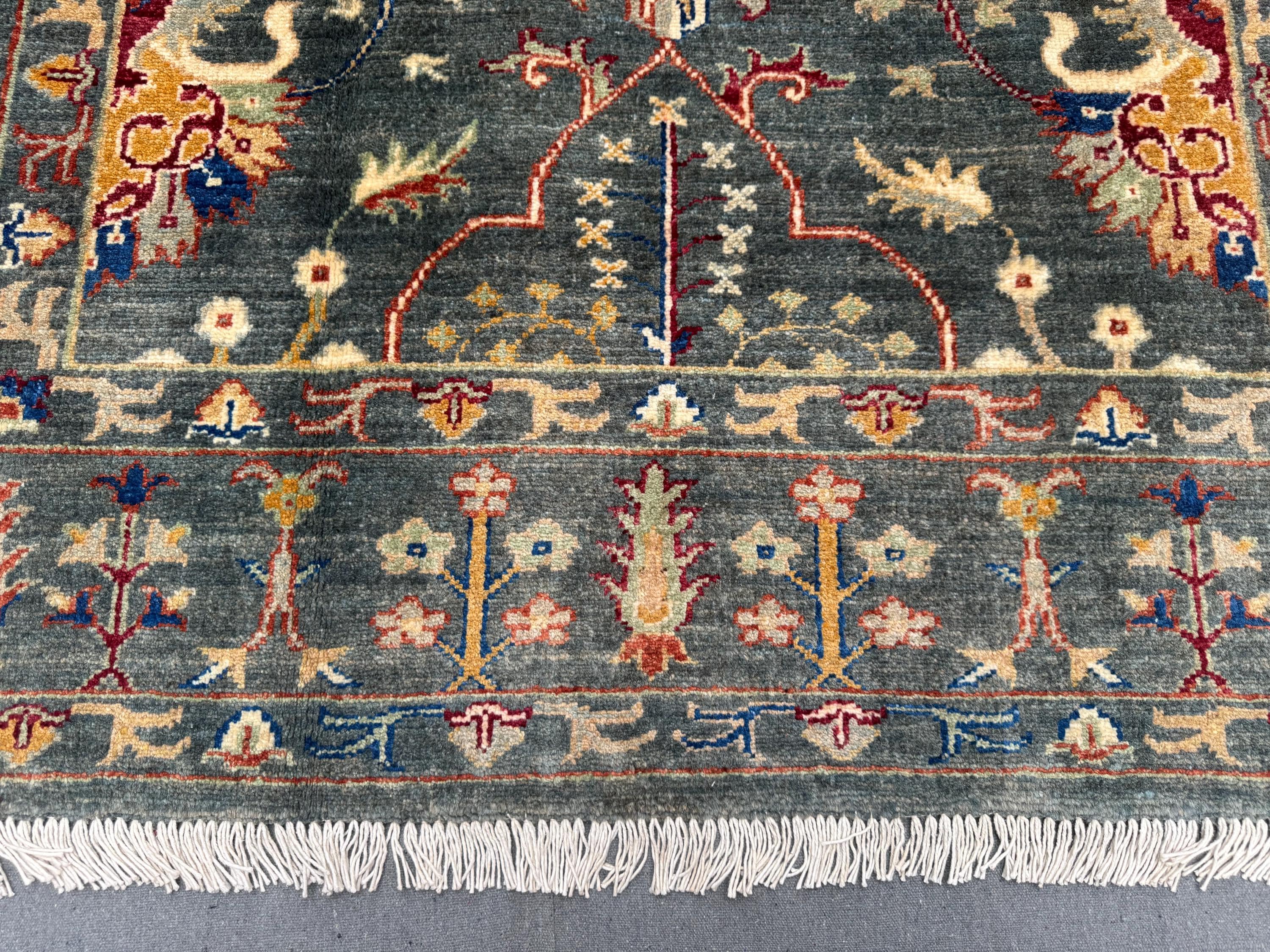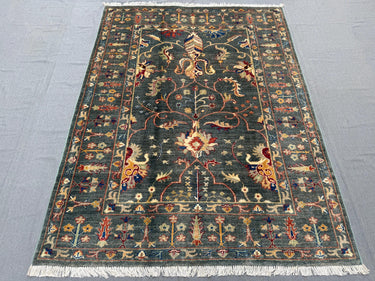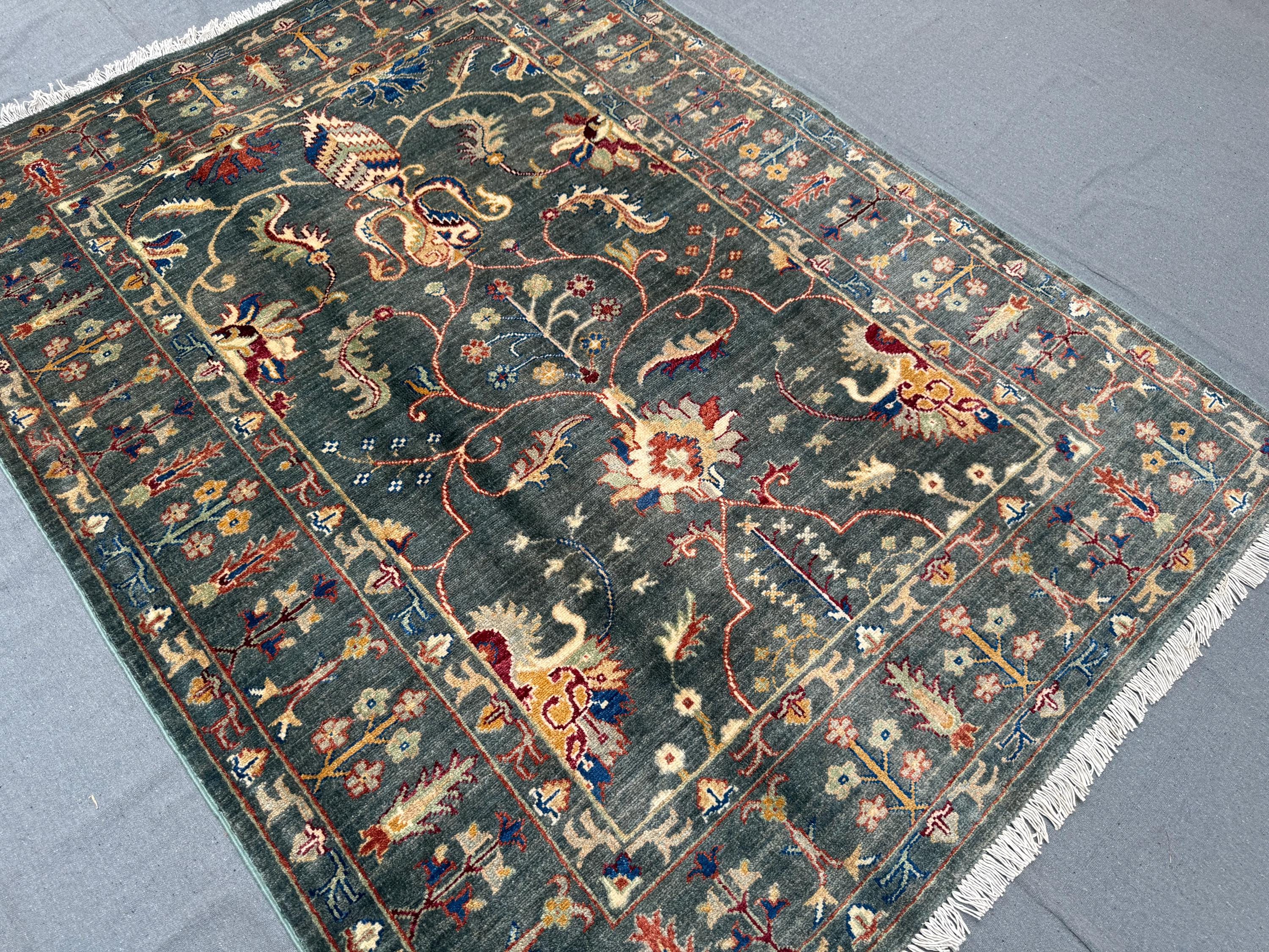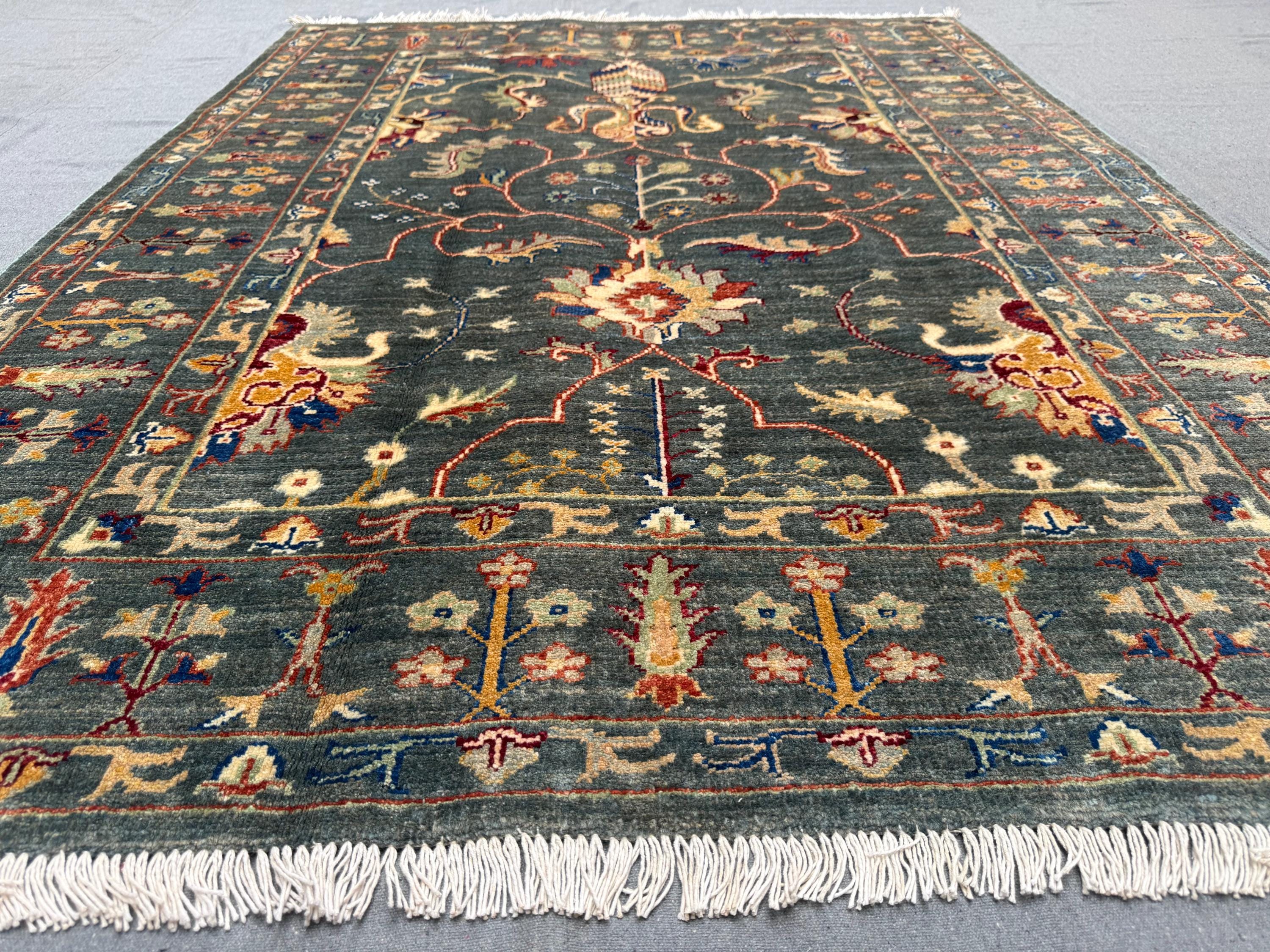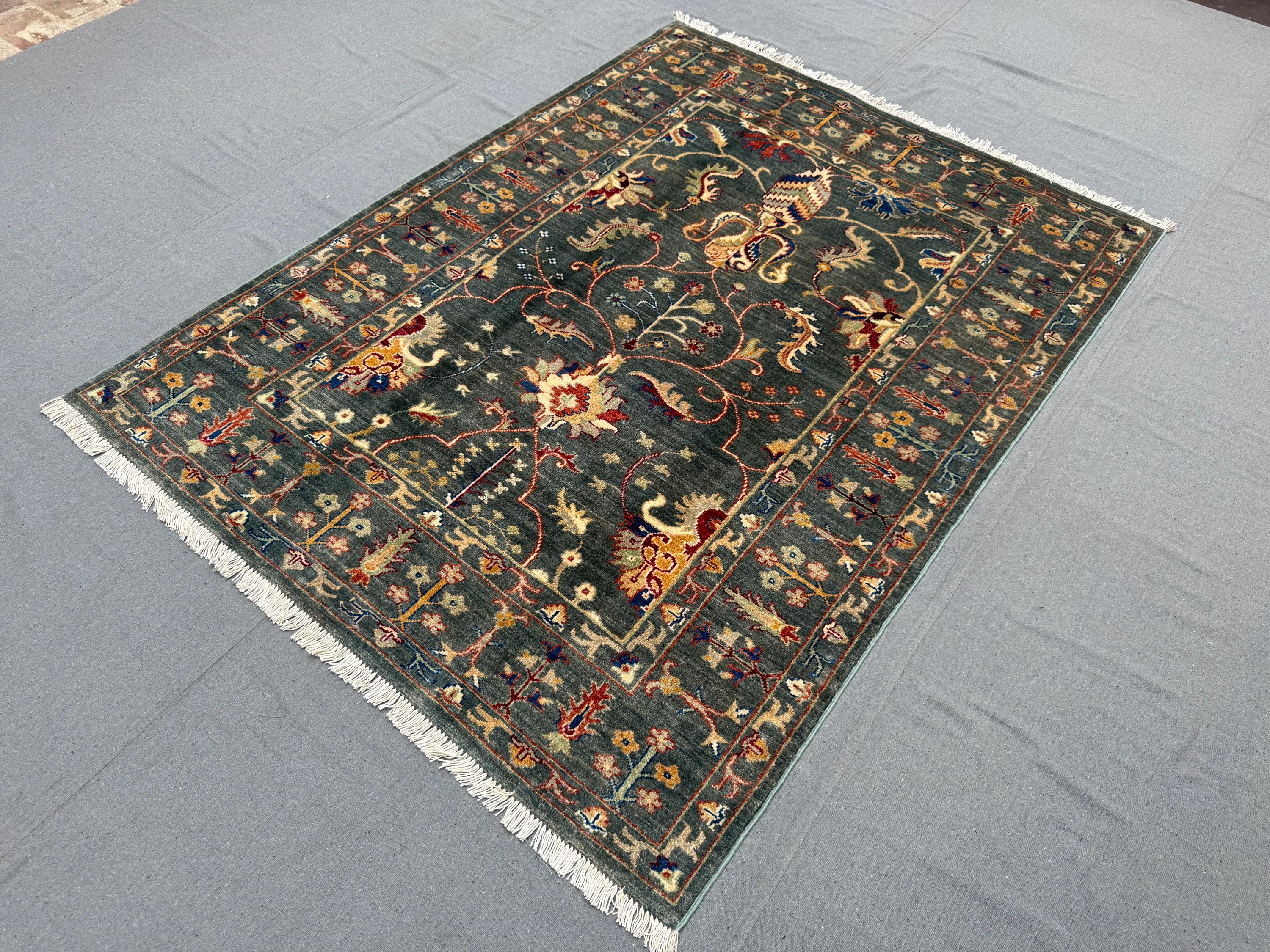 Sultani Area Rug 4x6, Dark Green Floral Wool Rug, Vintage Oriental Carpet, Persian Style Traditional Rug for Bedroom Entryway Office
