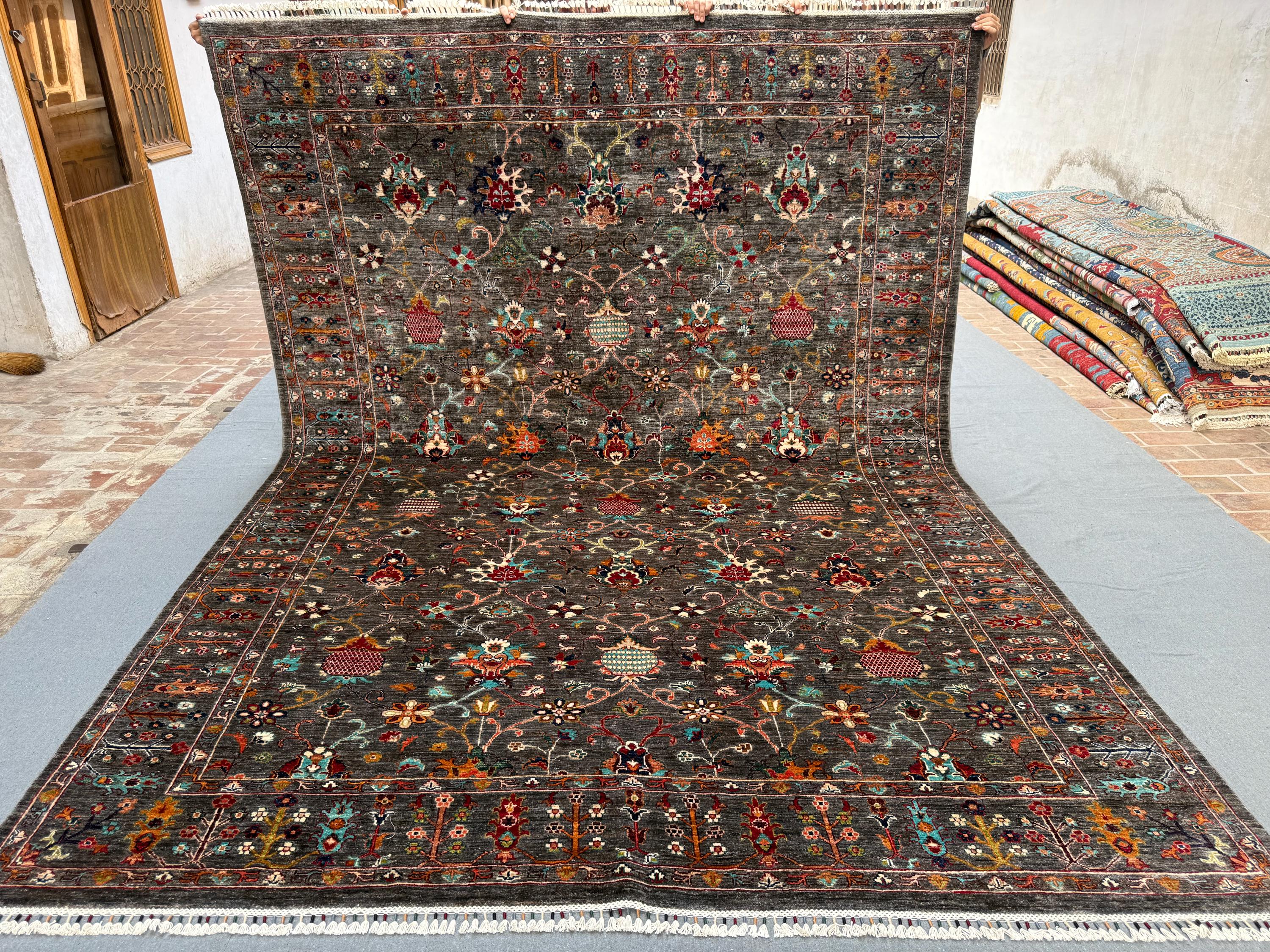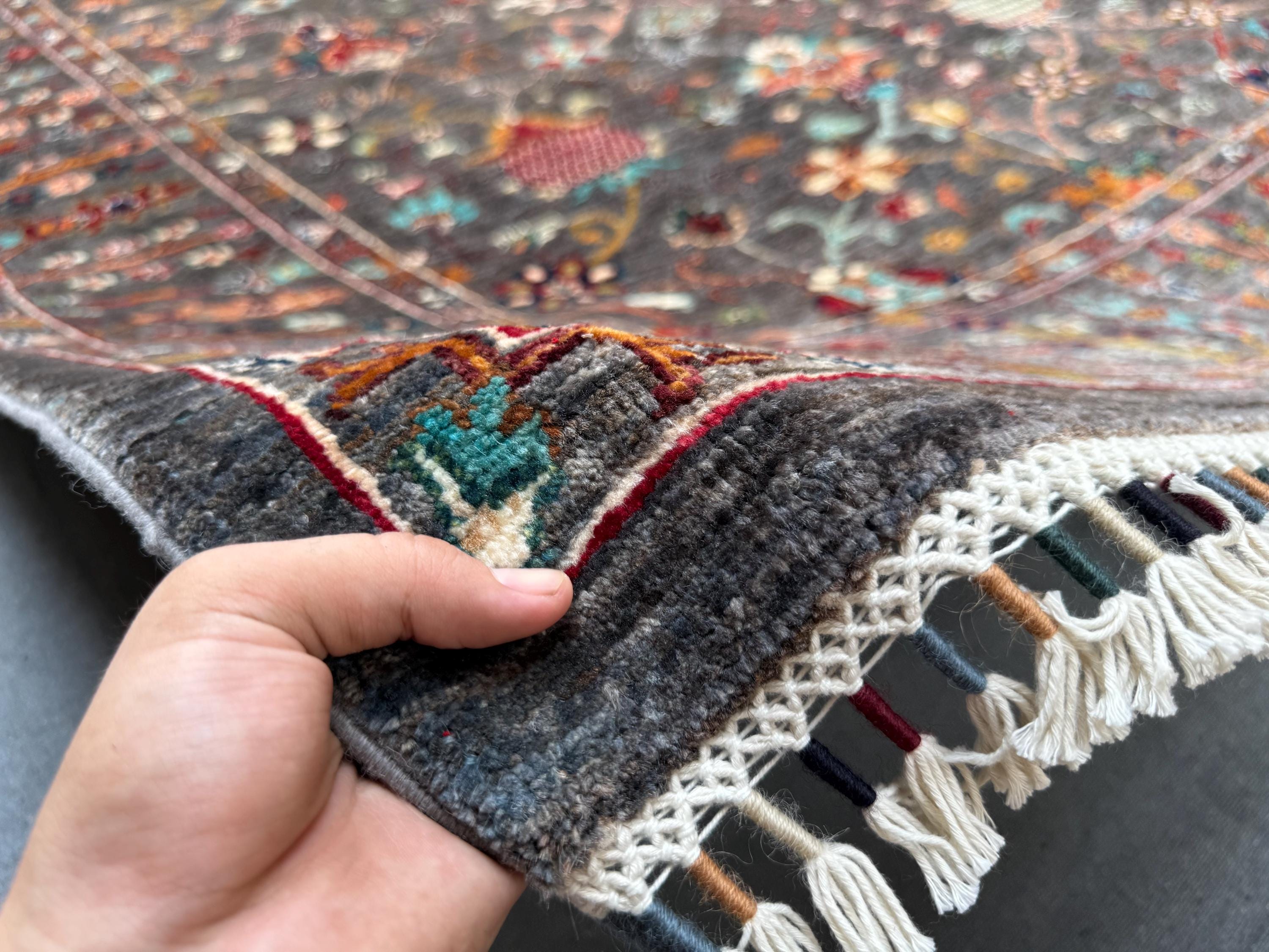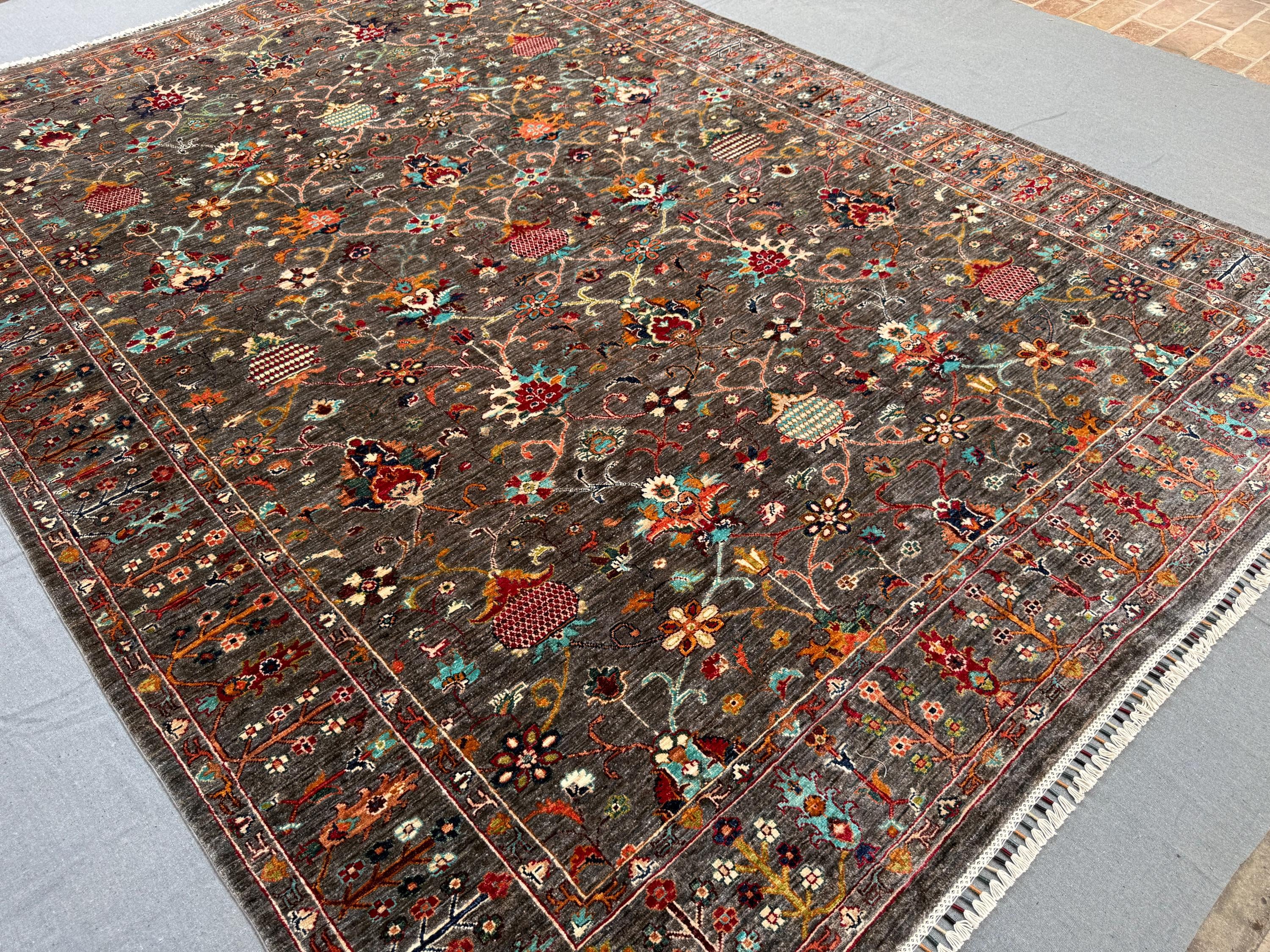 Sultani Handmade Wool Rug 8x11 ft, Charcoal Gray Floral Carpet, Large Oriental Design, Luxury Hand-Knotted Traditional Area Rug Décor