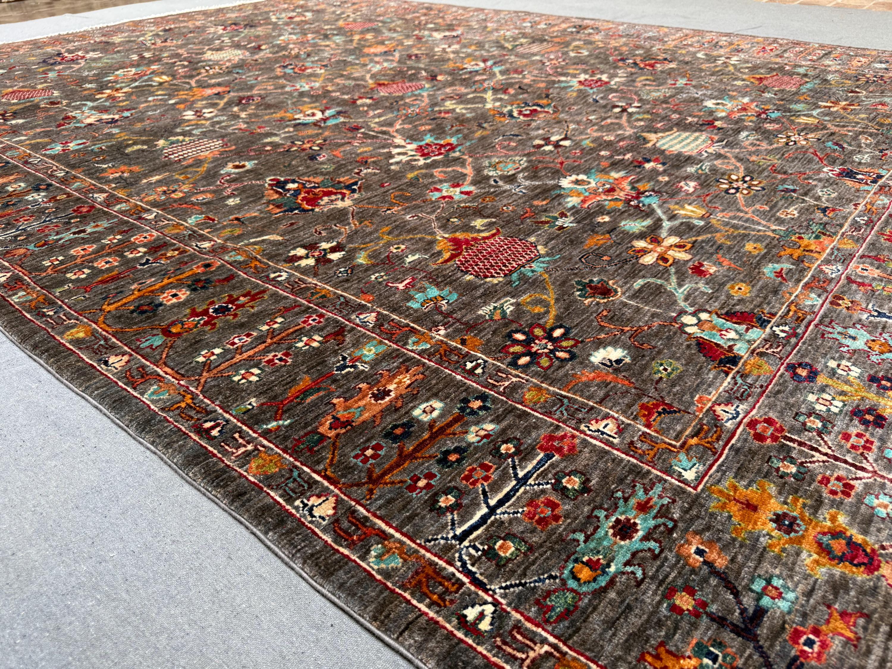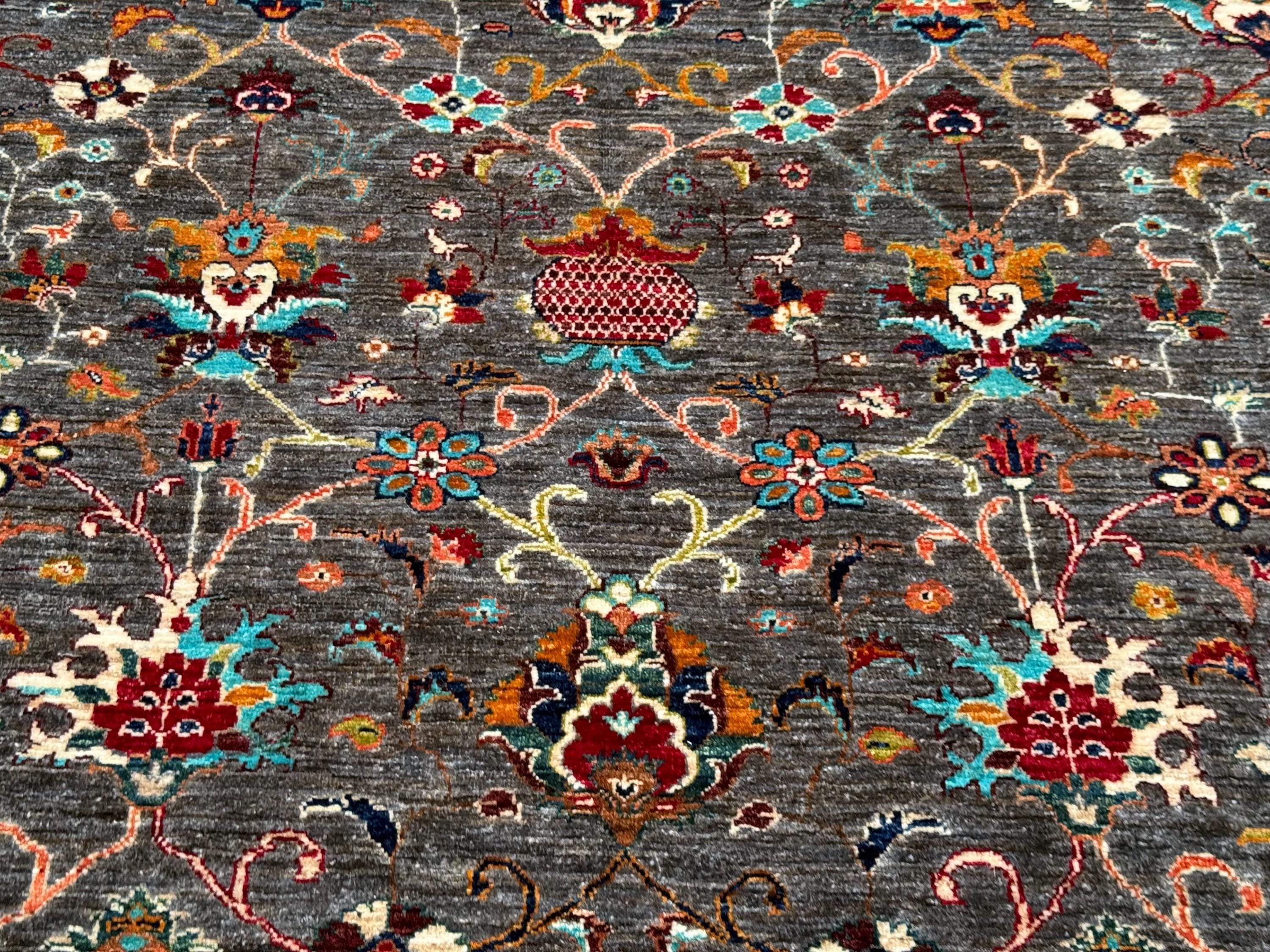 The Sultani handmade wool rug is a luxurious piece of craftsmanship showcasing a charcoal gray field adorned with elegant floral and vine motifs. With rich tones of burgundy, ivory, teal, and gold, the design creates a sophisticated and timeless look.