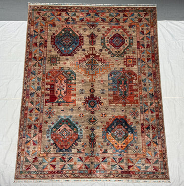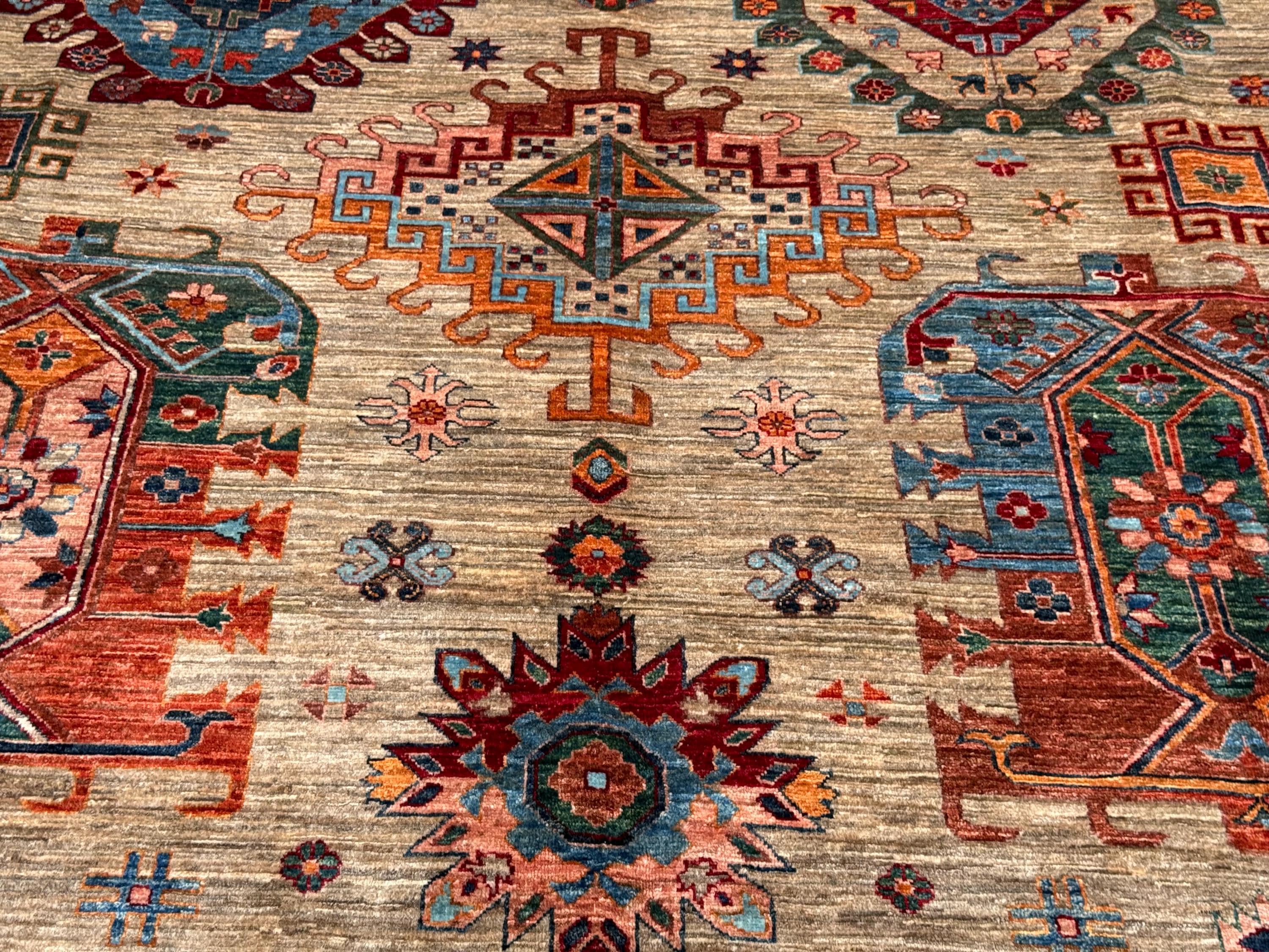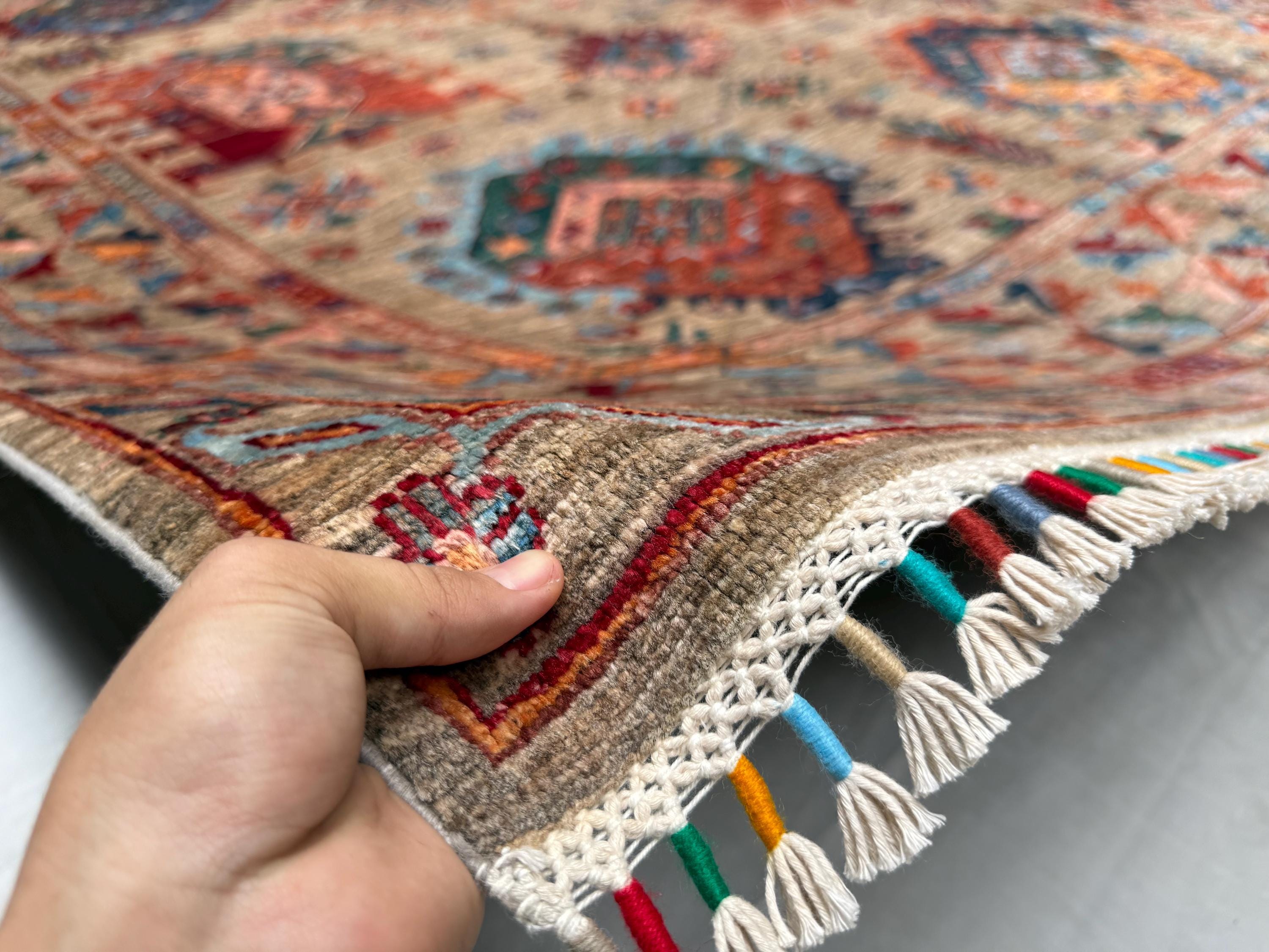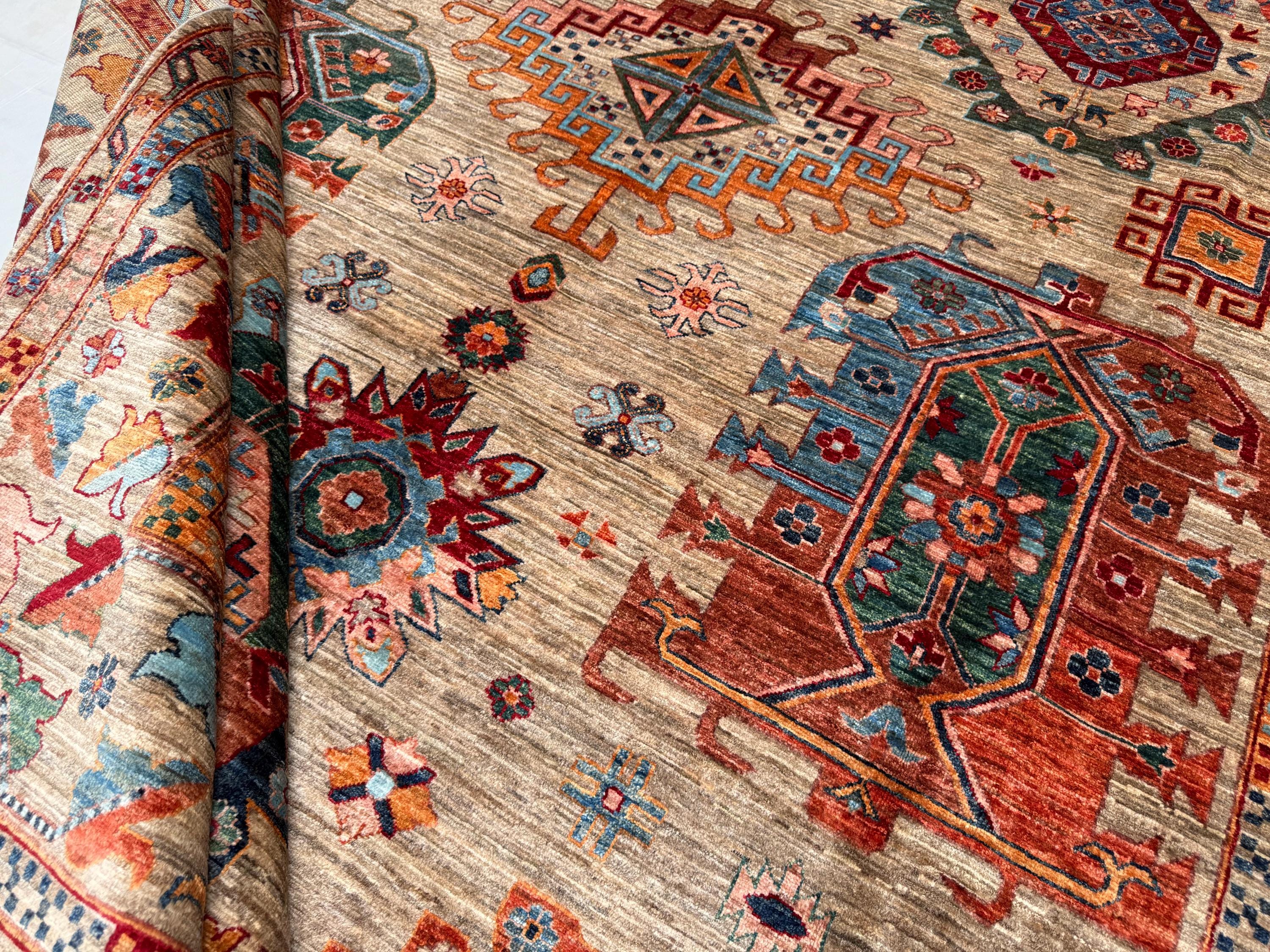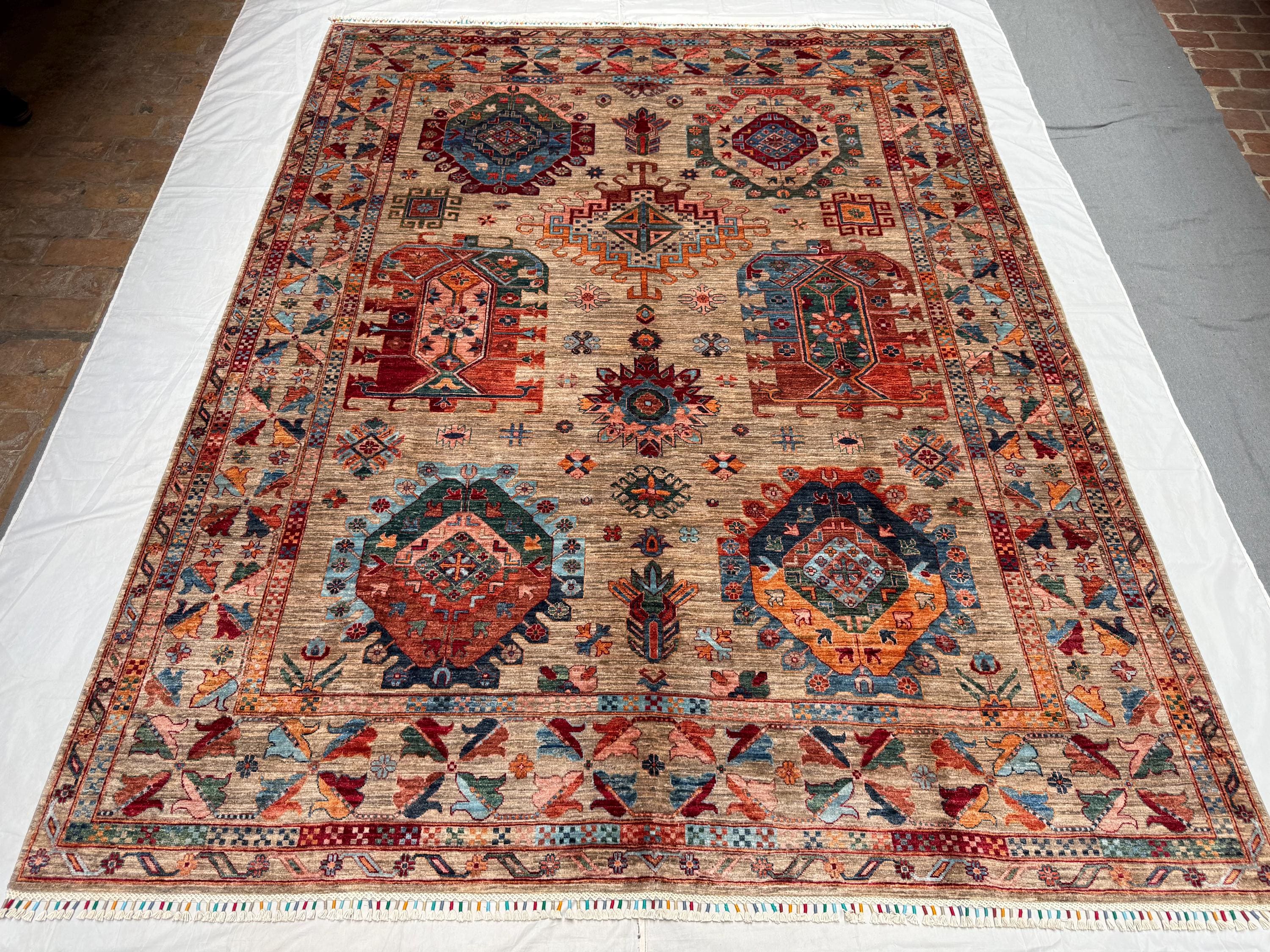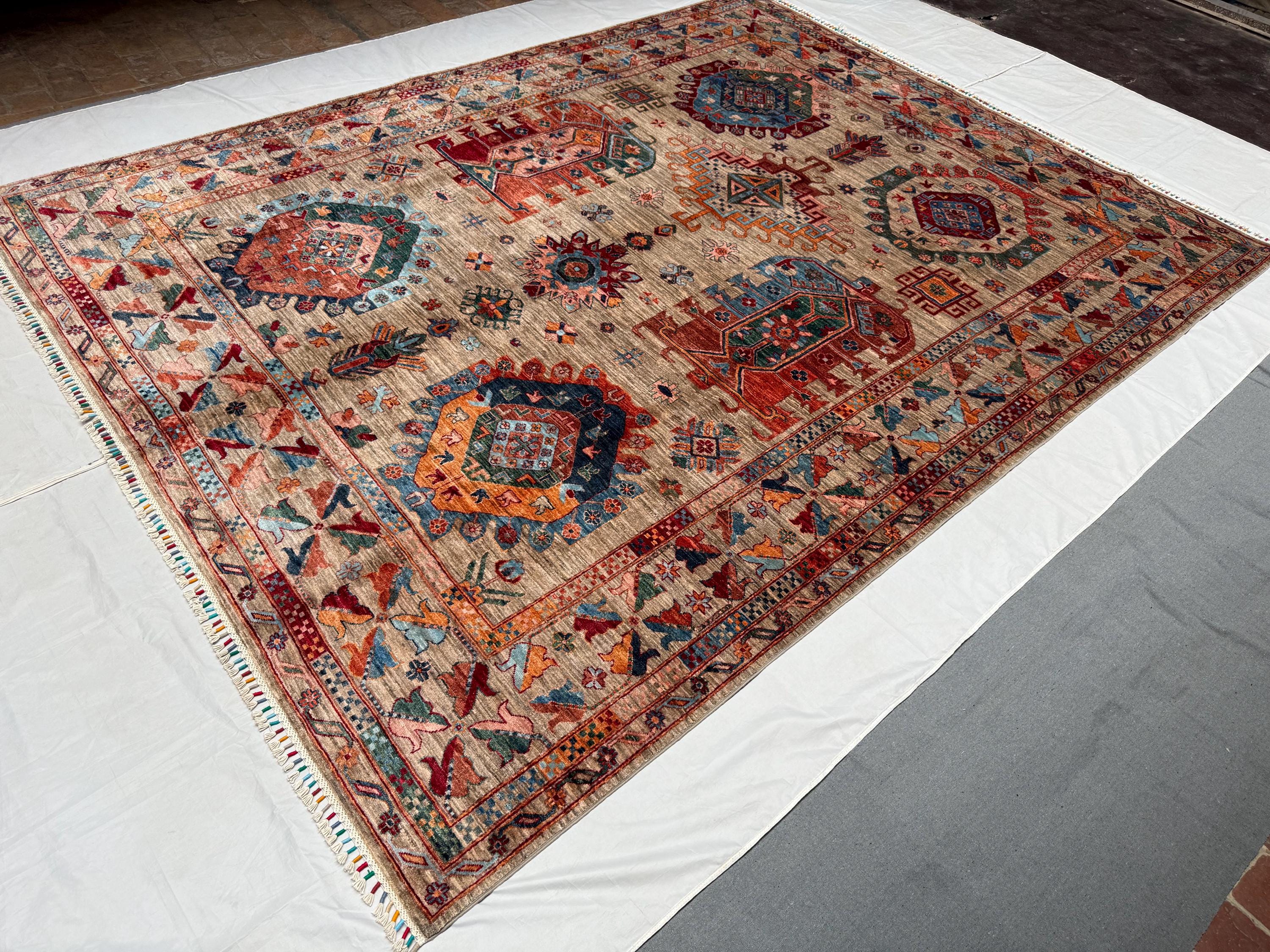 Waziri Afghan Rug 8.1x10.5 ft Hand-Knotted Wool Tribal Carpet, Beige Geometric Area Rug, Oriental Boho Home Décor, Large Wool Floor Rug