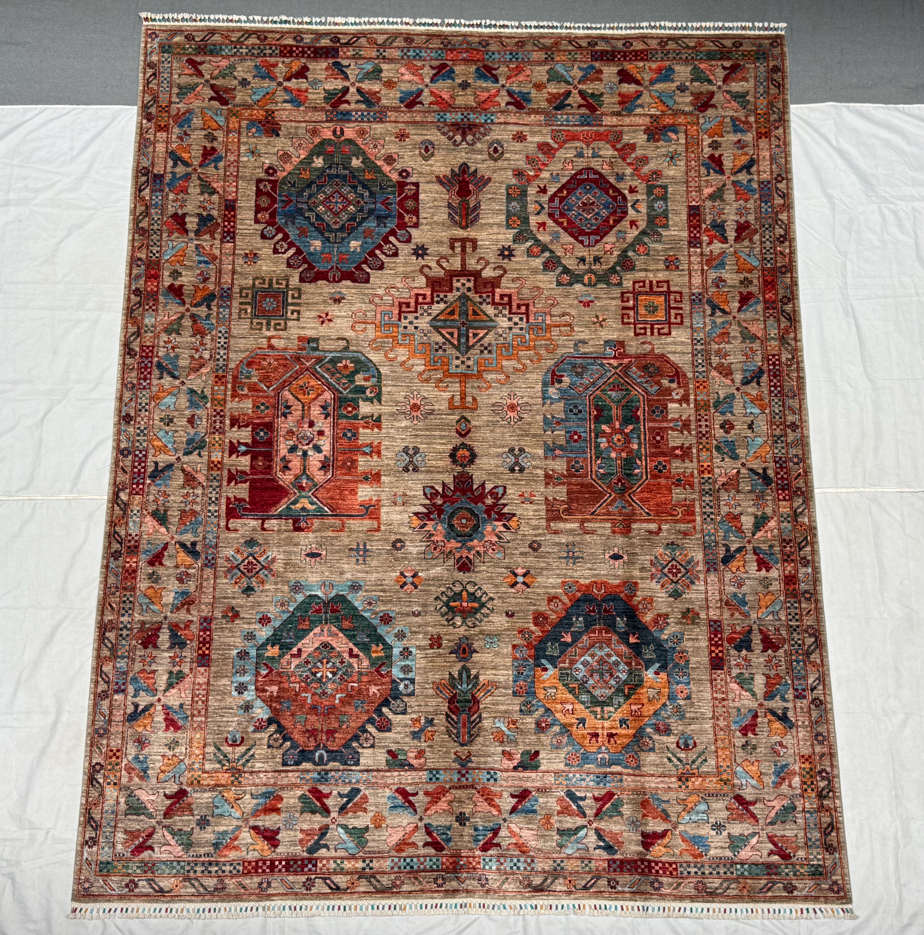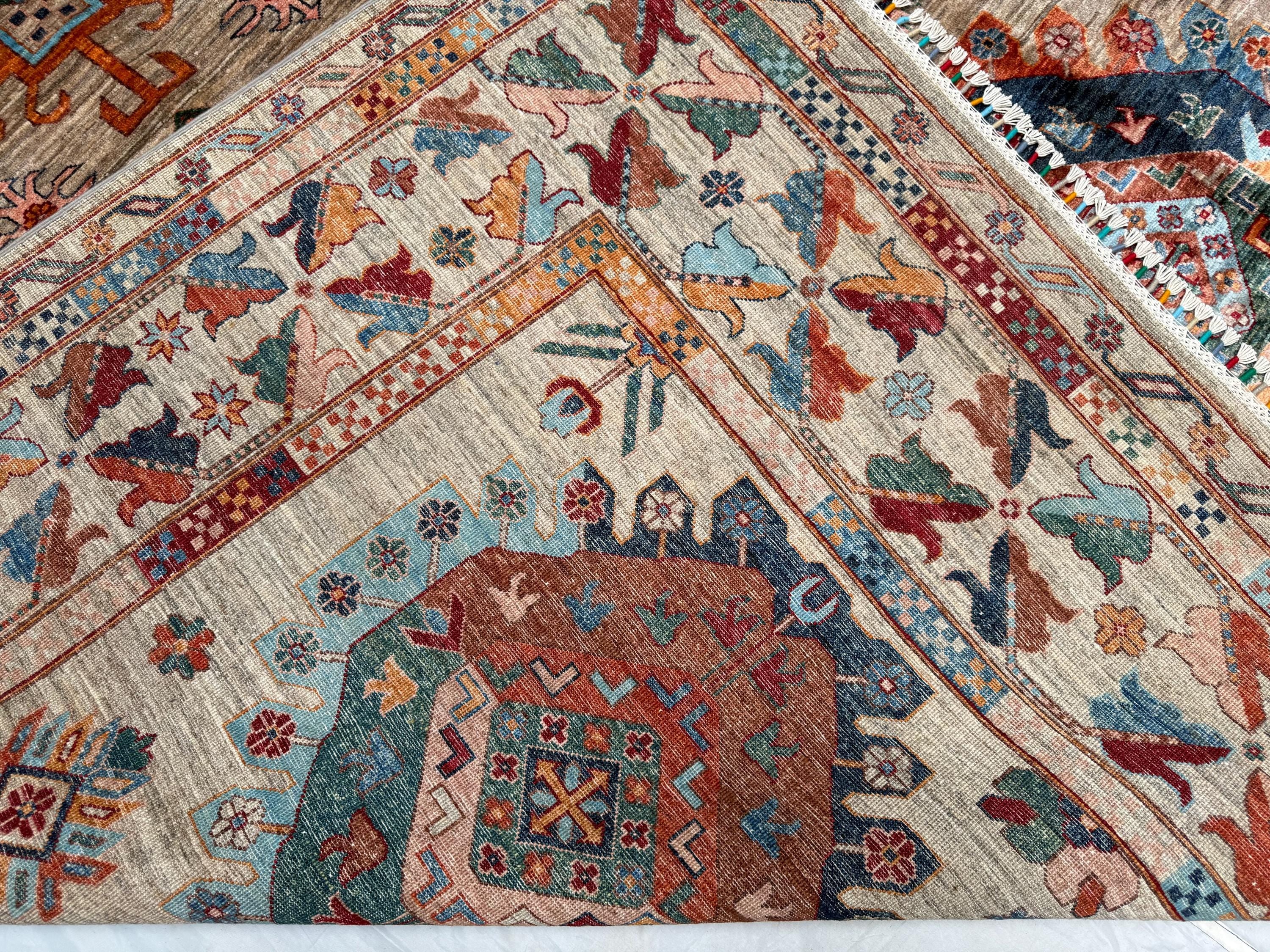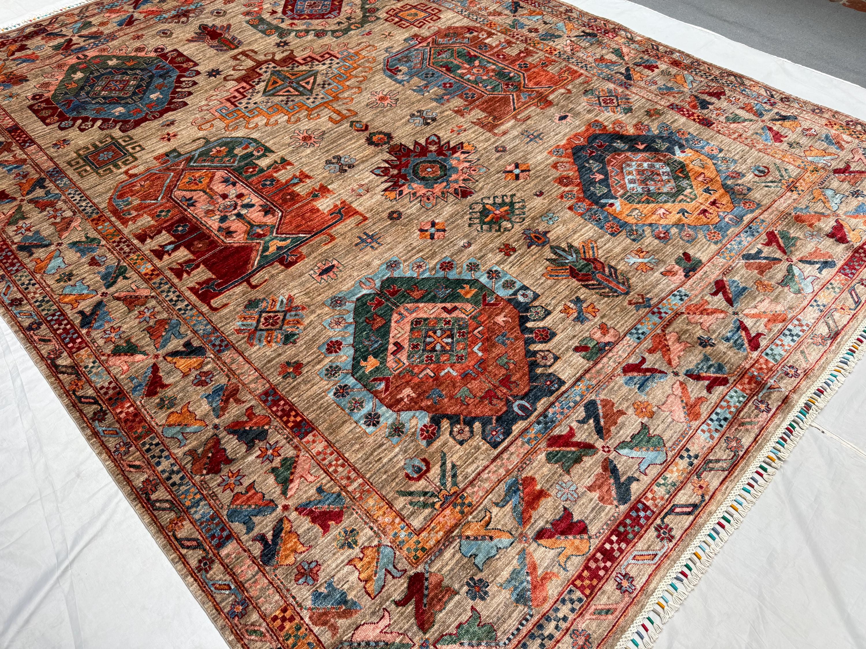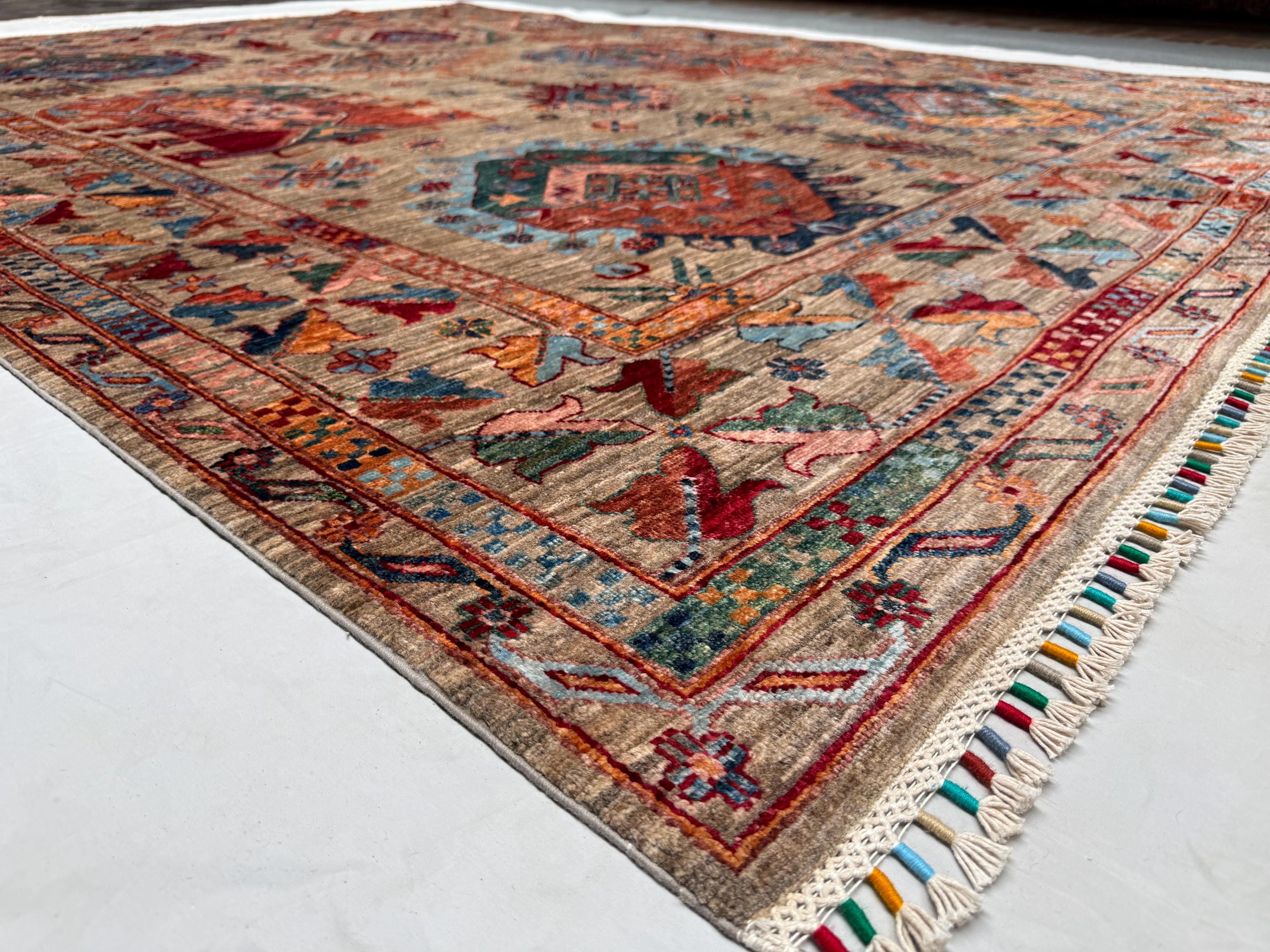 At 8.1x10.5 ft (247x315 cm), this large rug is perfect for living rooms, dining spaces, or bedrooms, adding warmth, depth, and elegance. The detailed borders and symmetrical tribal motifs evoke a timeless sense of balance—making it both a functional floor covering and a collectible work of art.