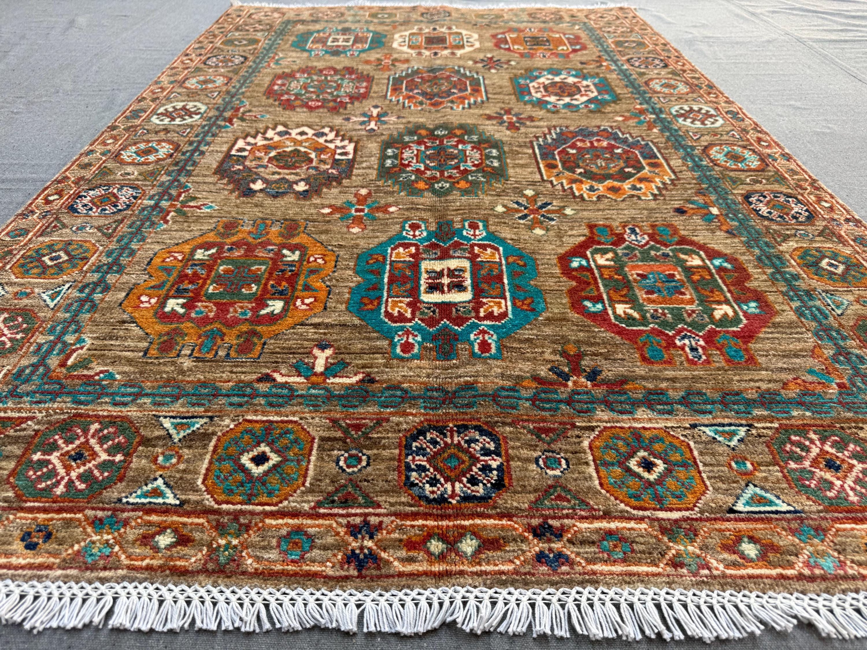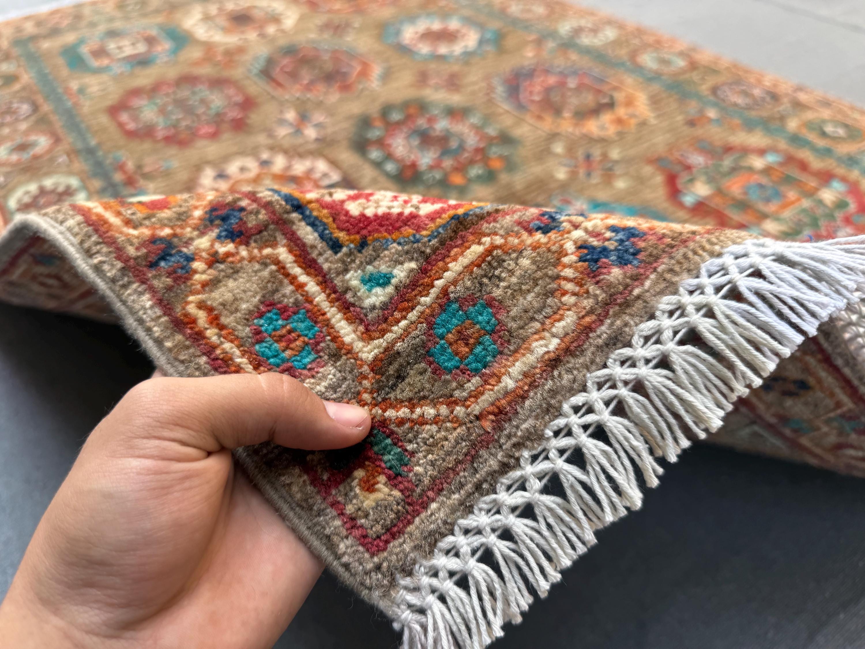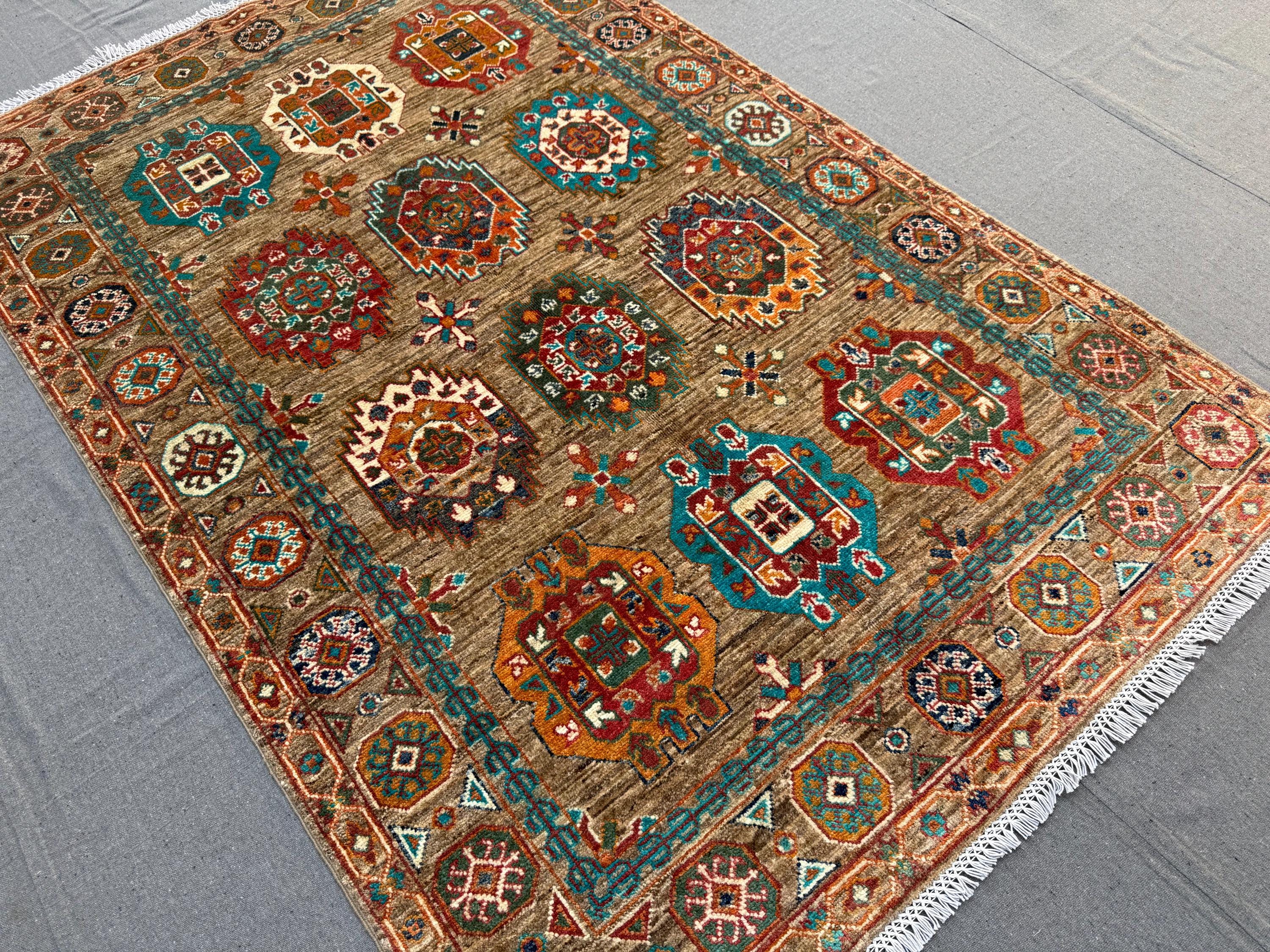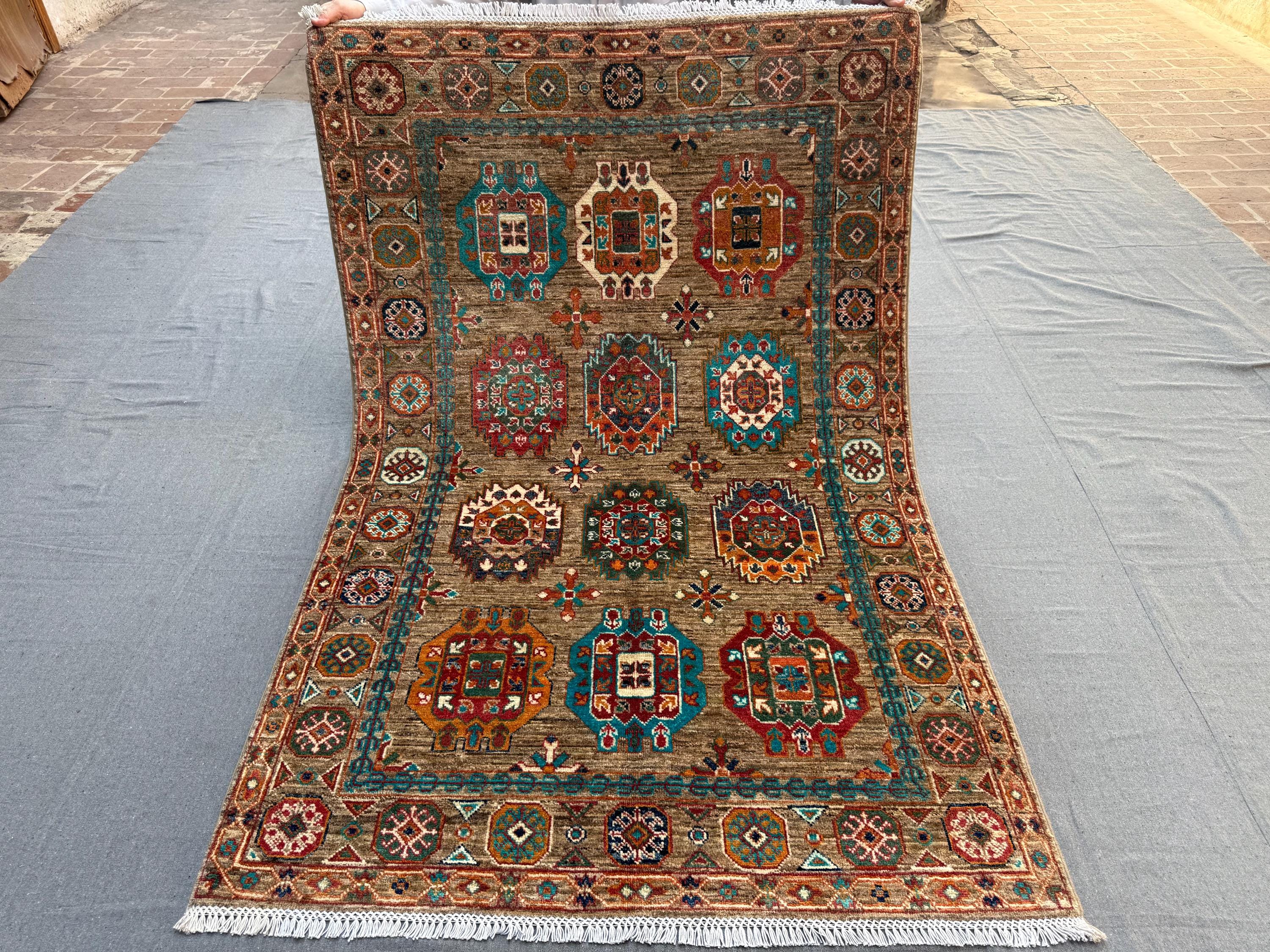 Waziri Geometric Rug 4x6 ft Handmade Wool Tribal Afghan Carpet, Brown & Teal Khotan Style Area Rug with Medallion Motifs for Home Décor