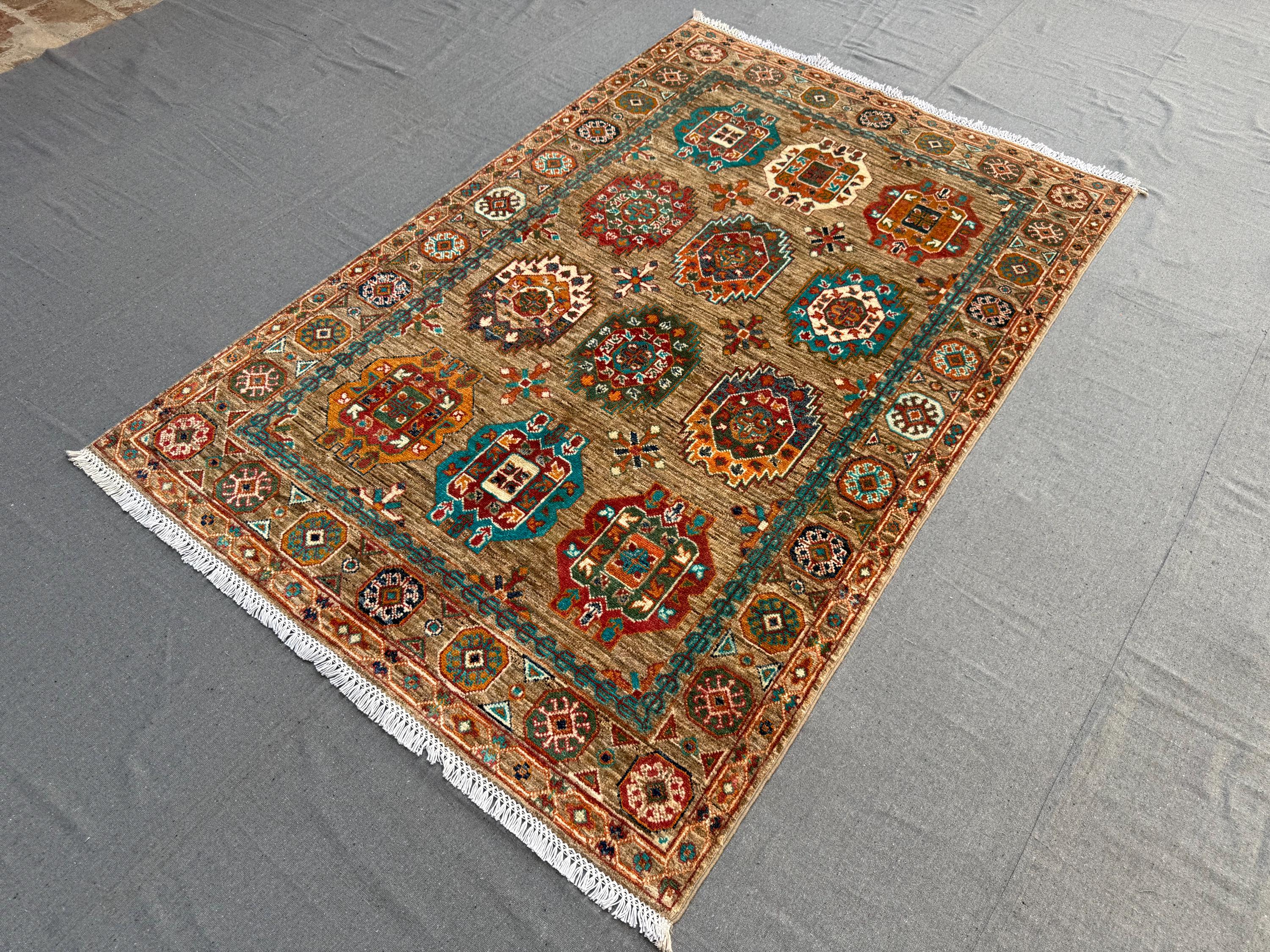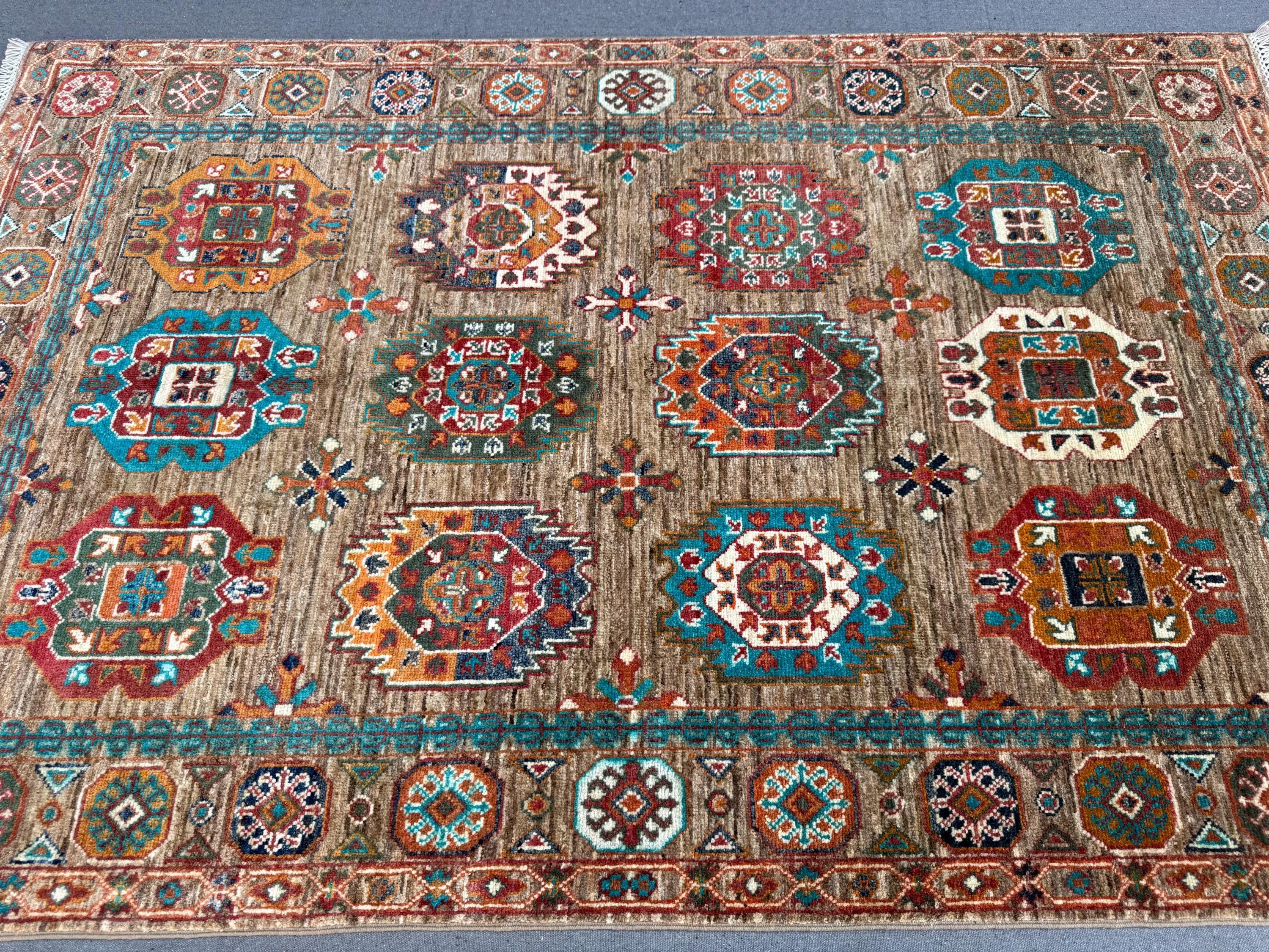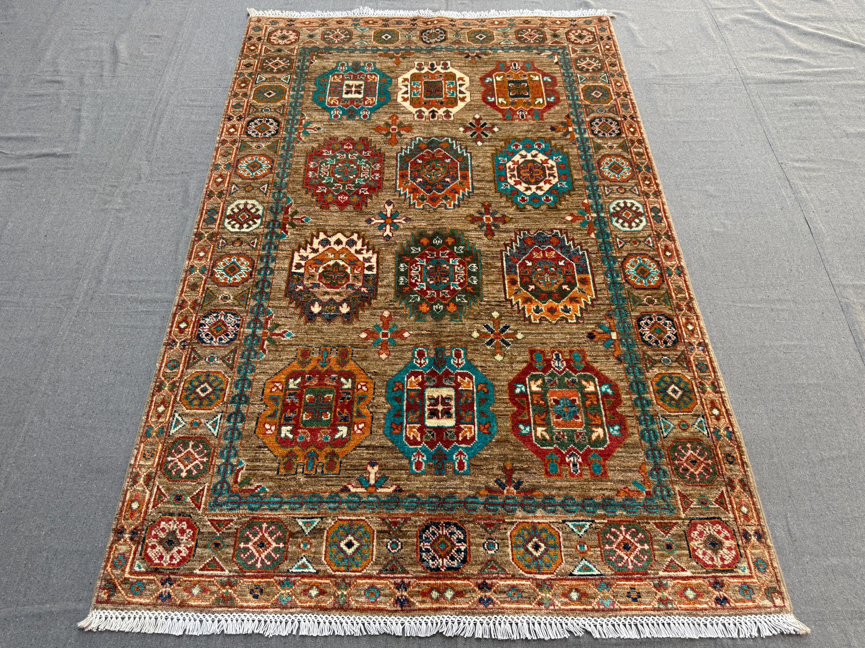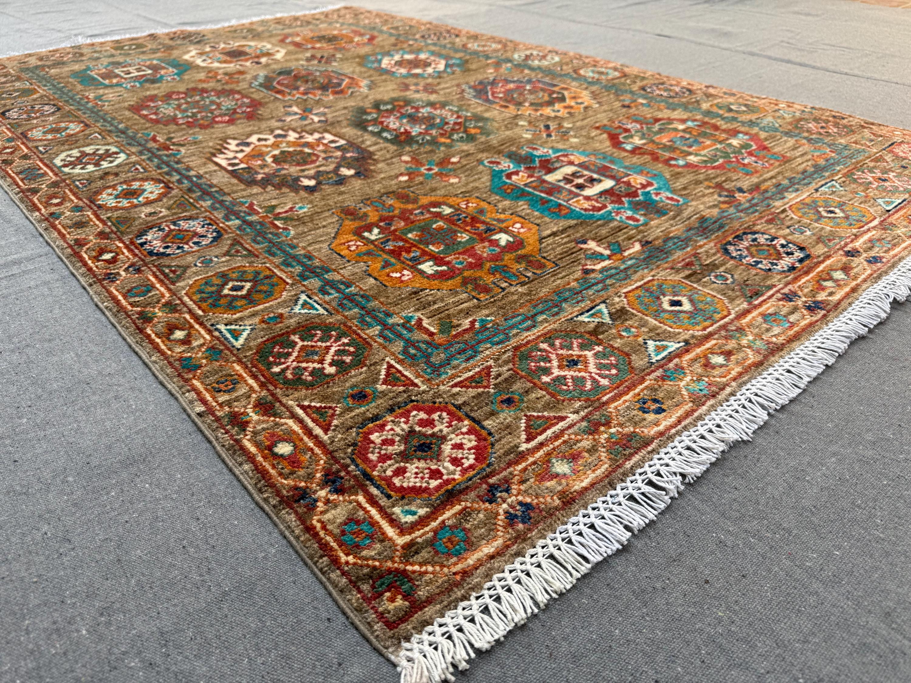 Waziri Geometric Rug 4x6 ft Handmade Wool Tribal Afghan Carpet, Brown & Teal Khotan Style Area Rug with Medallion Motifs for Home Décor