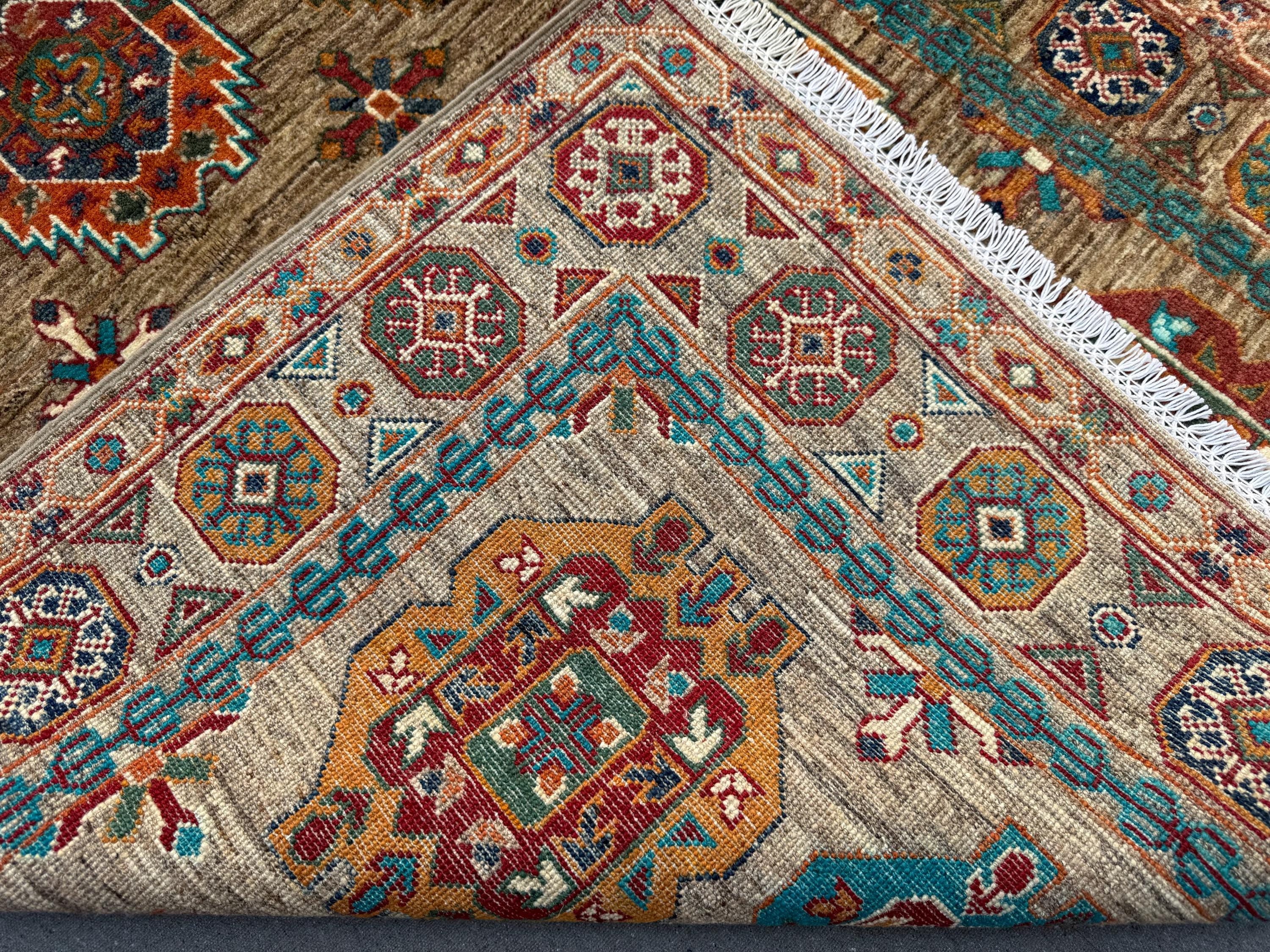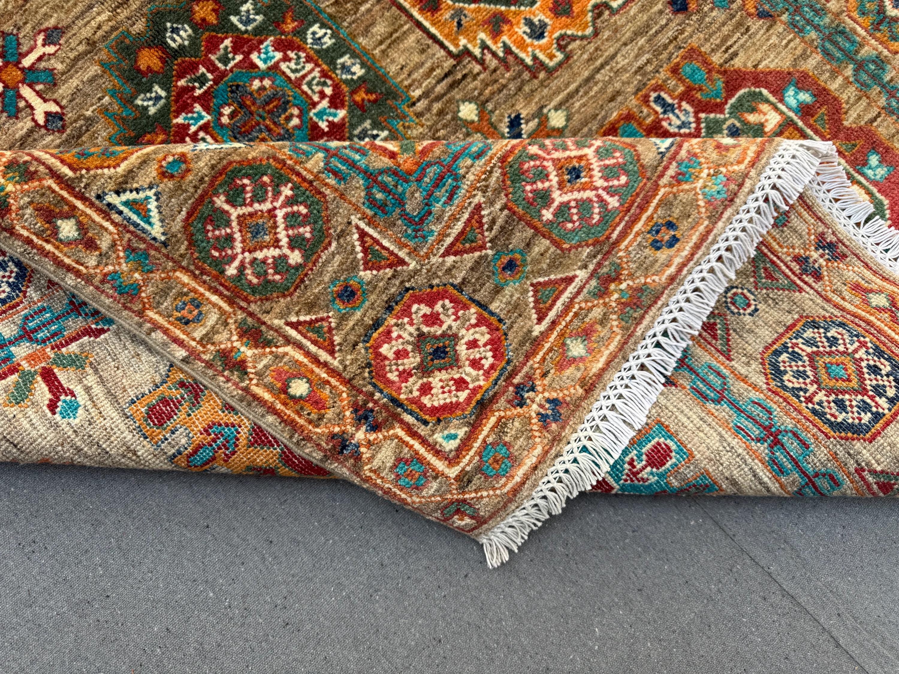 Add vibrant character and artisan charm to your home with this Handmade Waziri Wool Rug, featuring bold geometric medallions, tribal motifs, and a richly textured brown field accented with teal, gold, ivory, and brick-red tones. This striking Oriental design brings together centuries-old weaving traditions with a colorful modern touch.