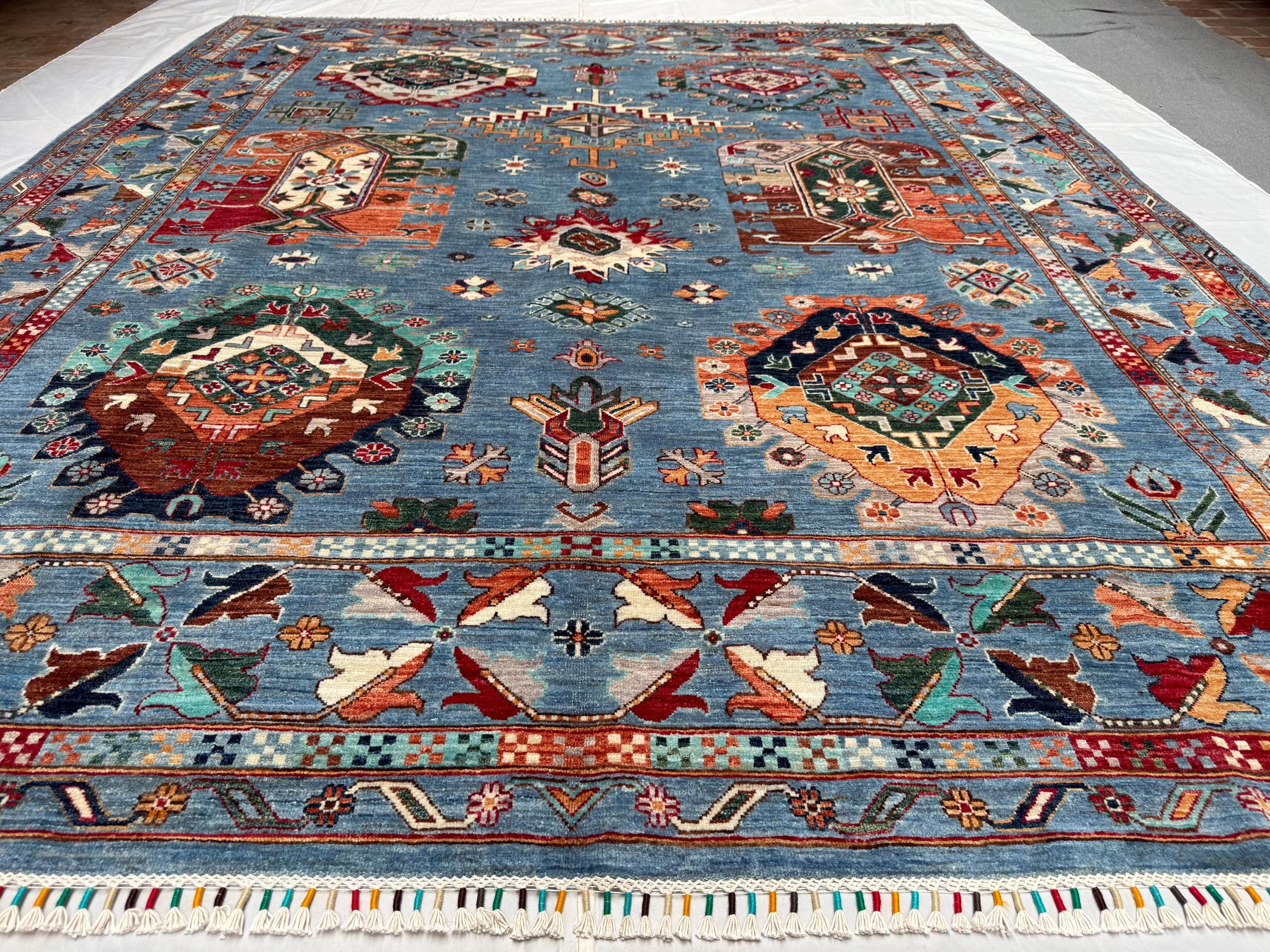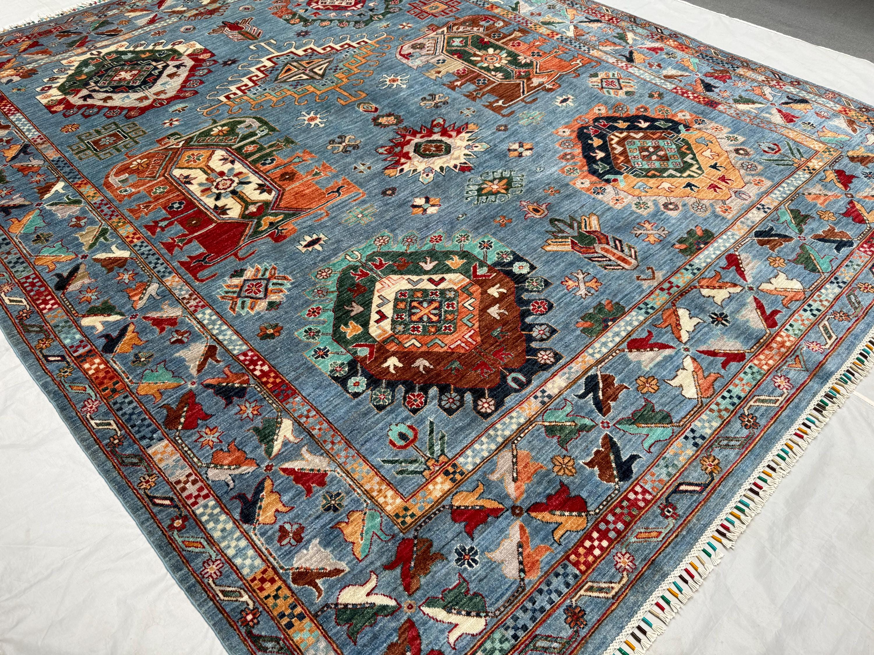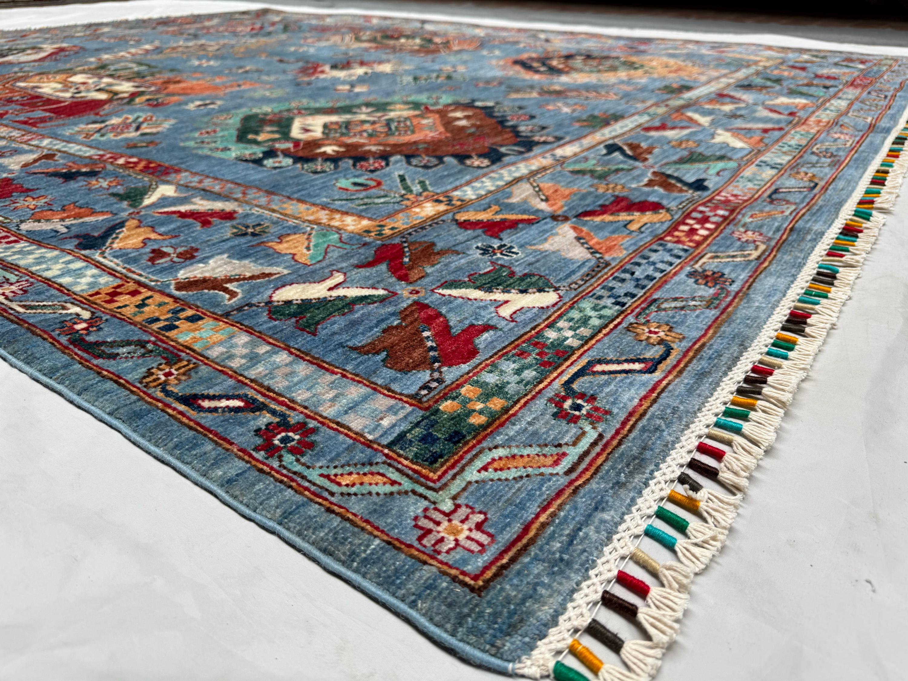 Waziri Oriental Rug 8.2x9.10 ft Hand-Knotted Wool Tribal Carpet, Blue Geometric Area Rug, Boho Home Décor, Large Wool Floor Rug