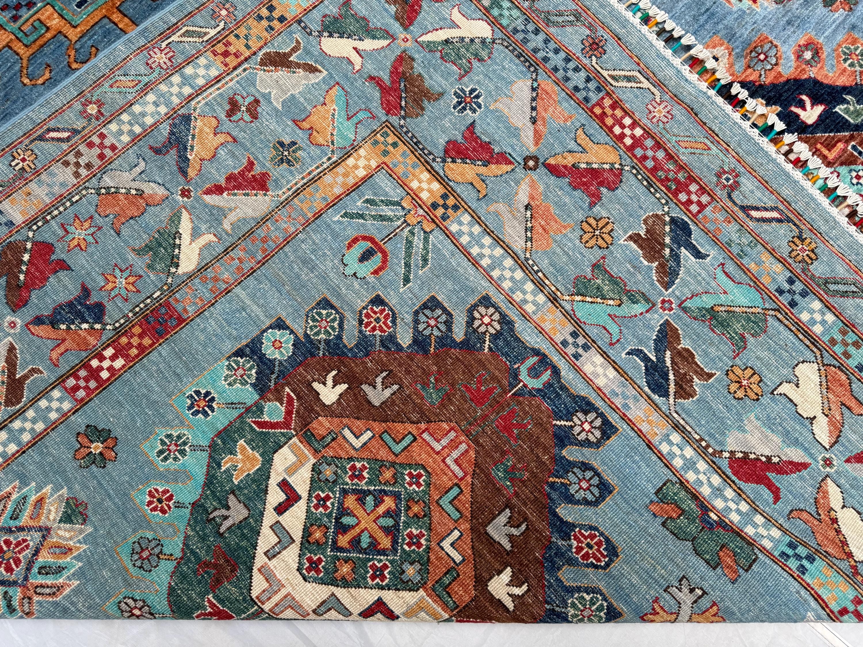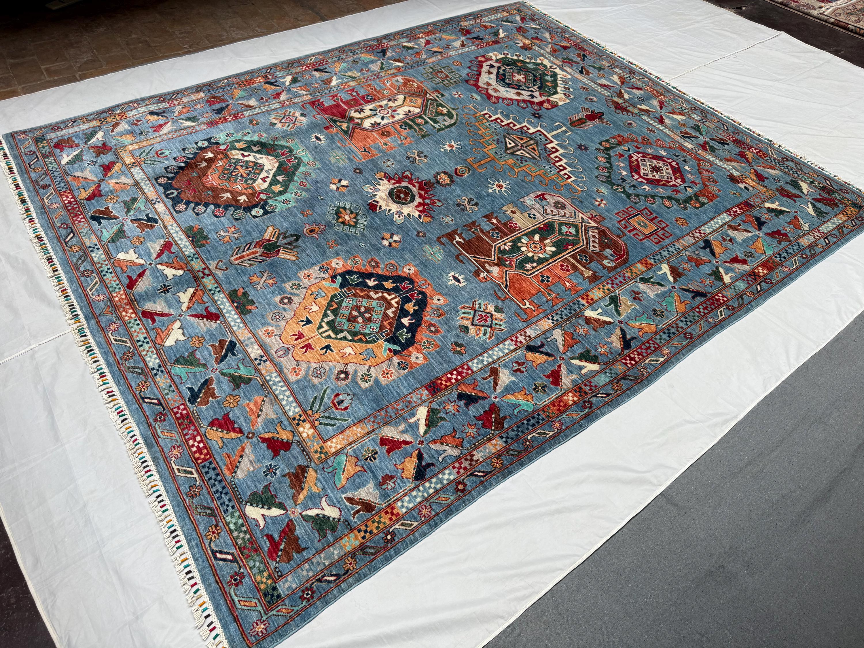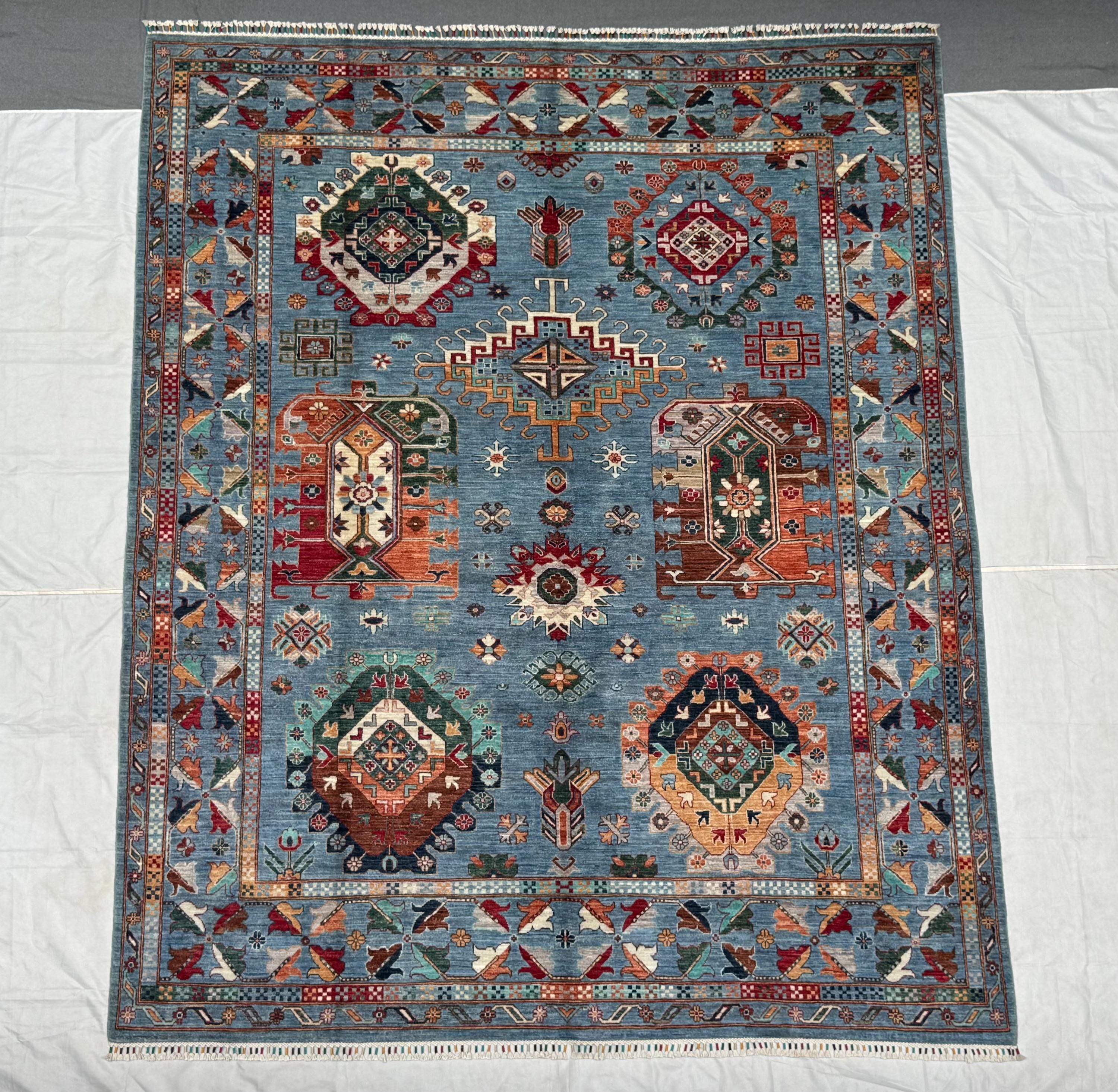 Waziri Oriental Rug 8.2x9.10 ft Hand-Knotted Wool Tribal Carpet, Blue Geometric Area Rug, Boho Home Décor, Large Wool Floor Rug
