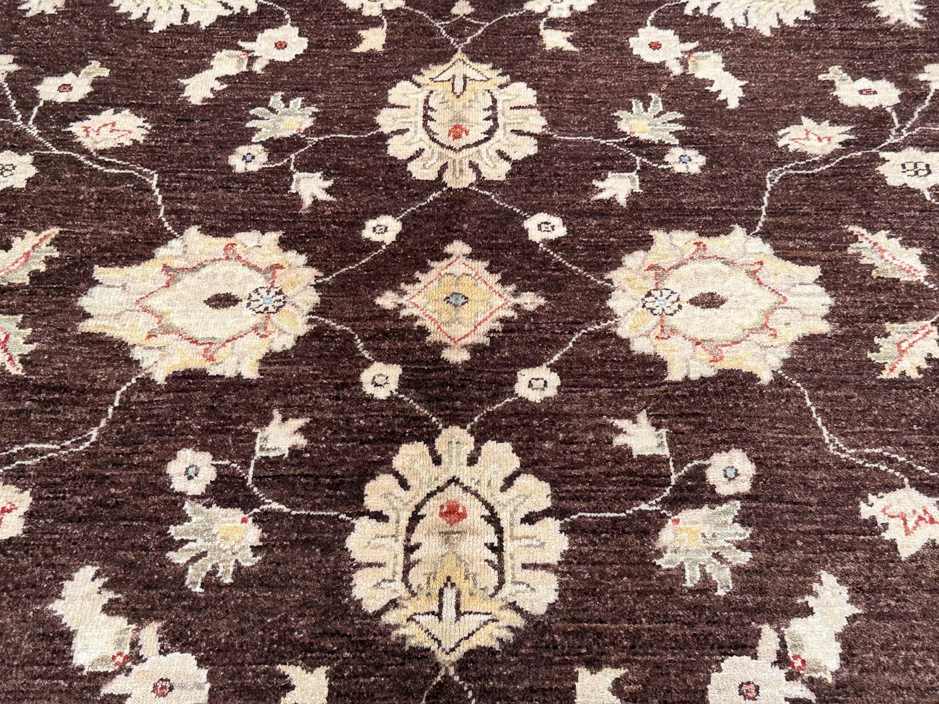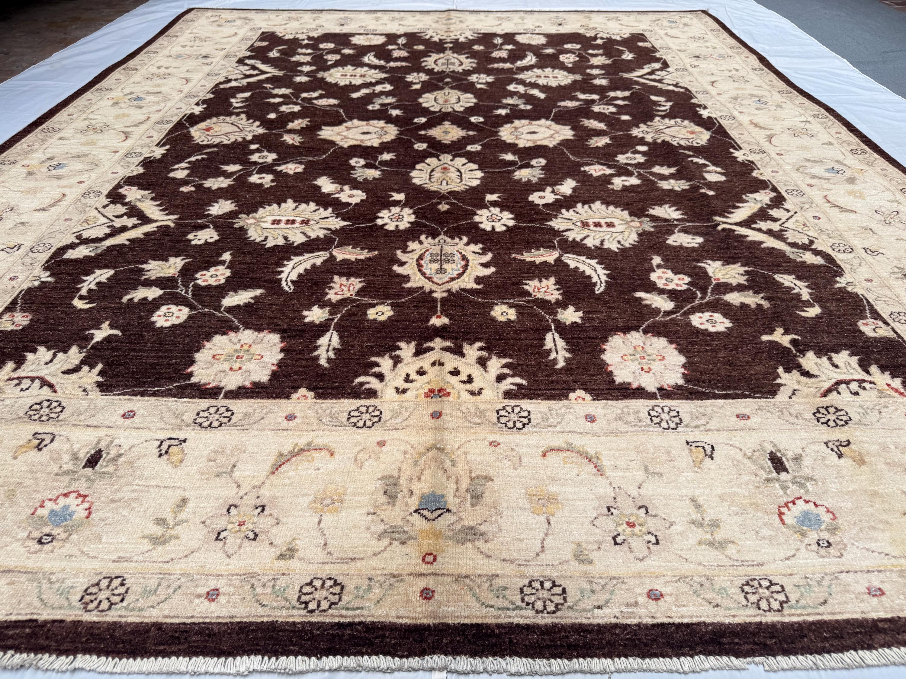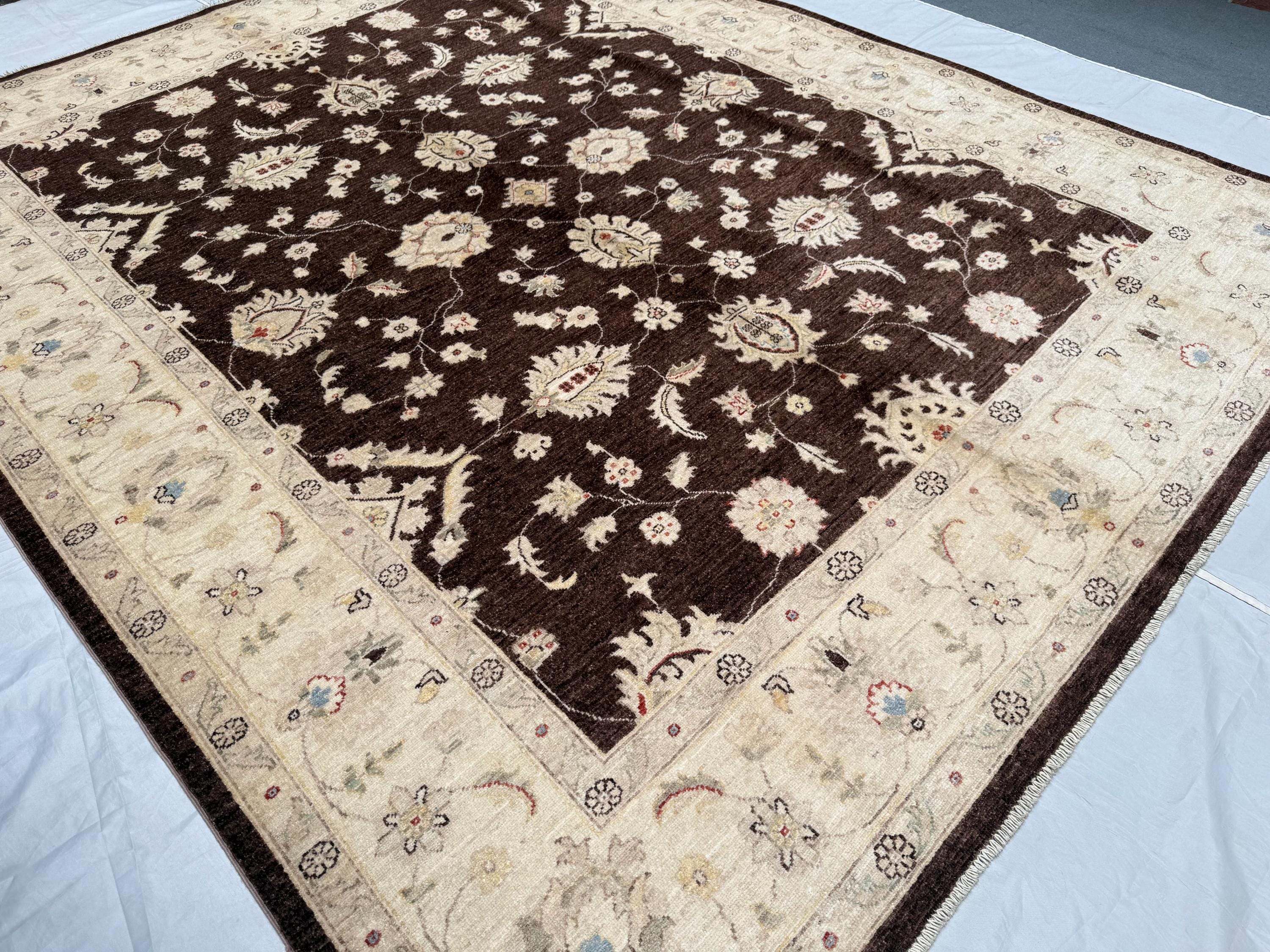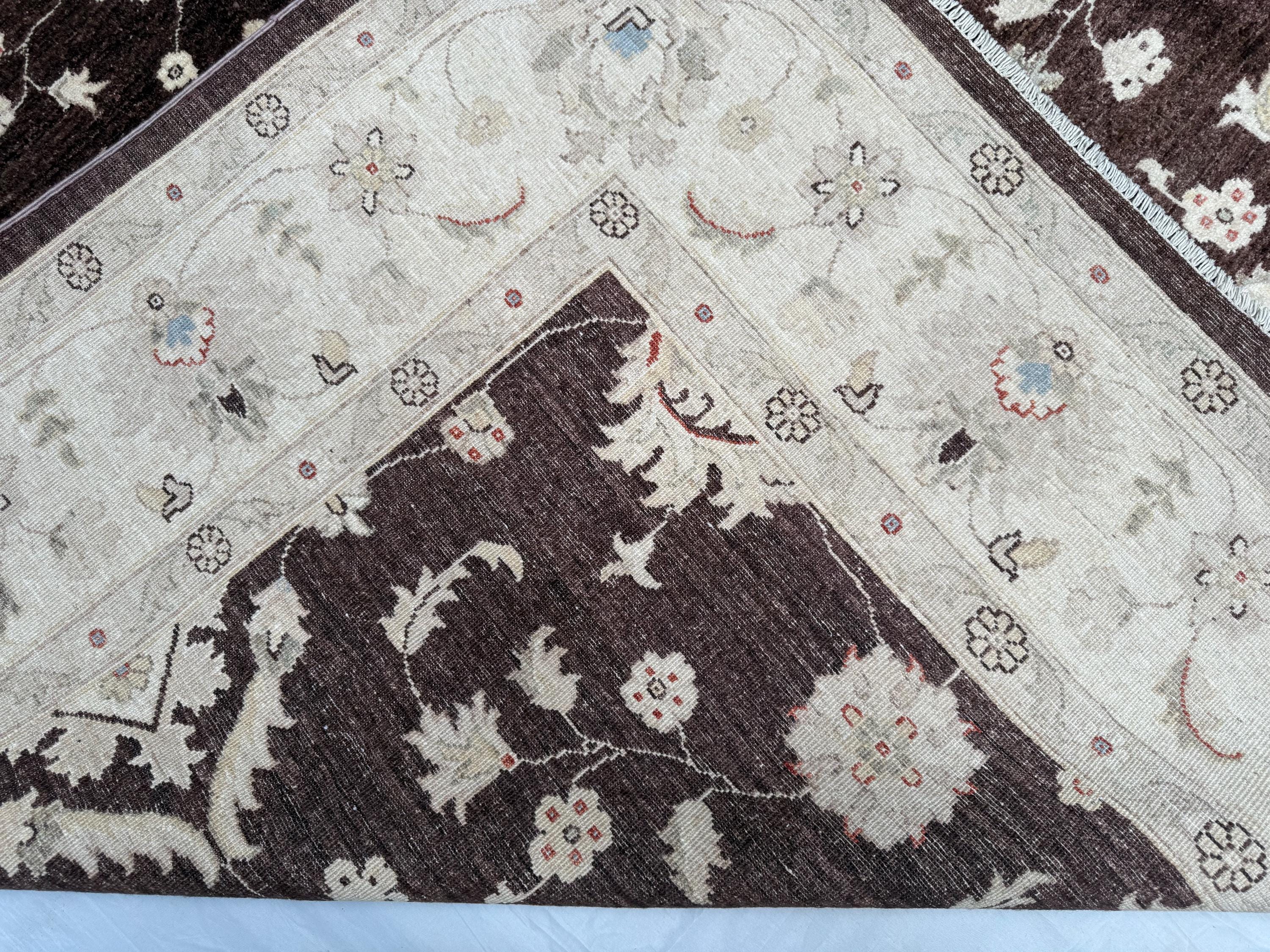 This brand new Ziglar Chobi rug combines timeless floral artistry with luxurious craftsmanship. Hand-knotted from 100% natural wool, it features a rich brown field framed by a soft ivory border, decorated with intricate floral and vine motifs. The warm, neutral tones make it an elegant centerpiece that complements both classic and modern interiors.