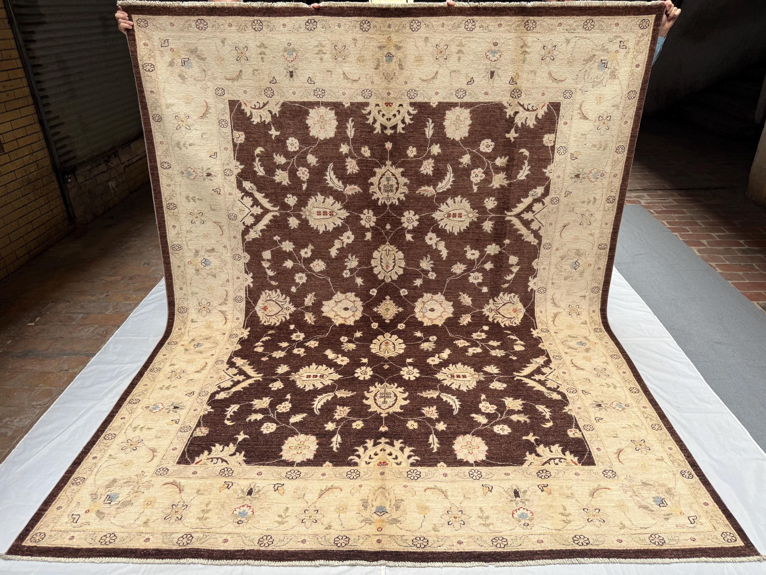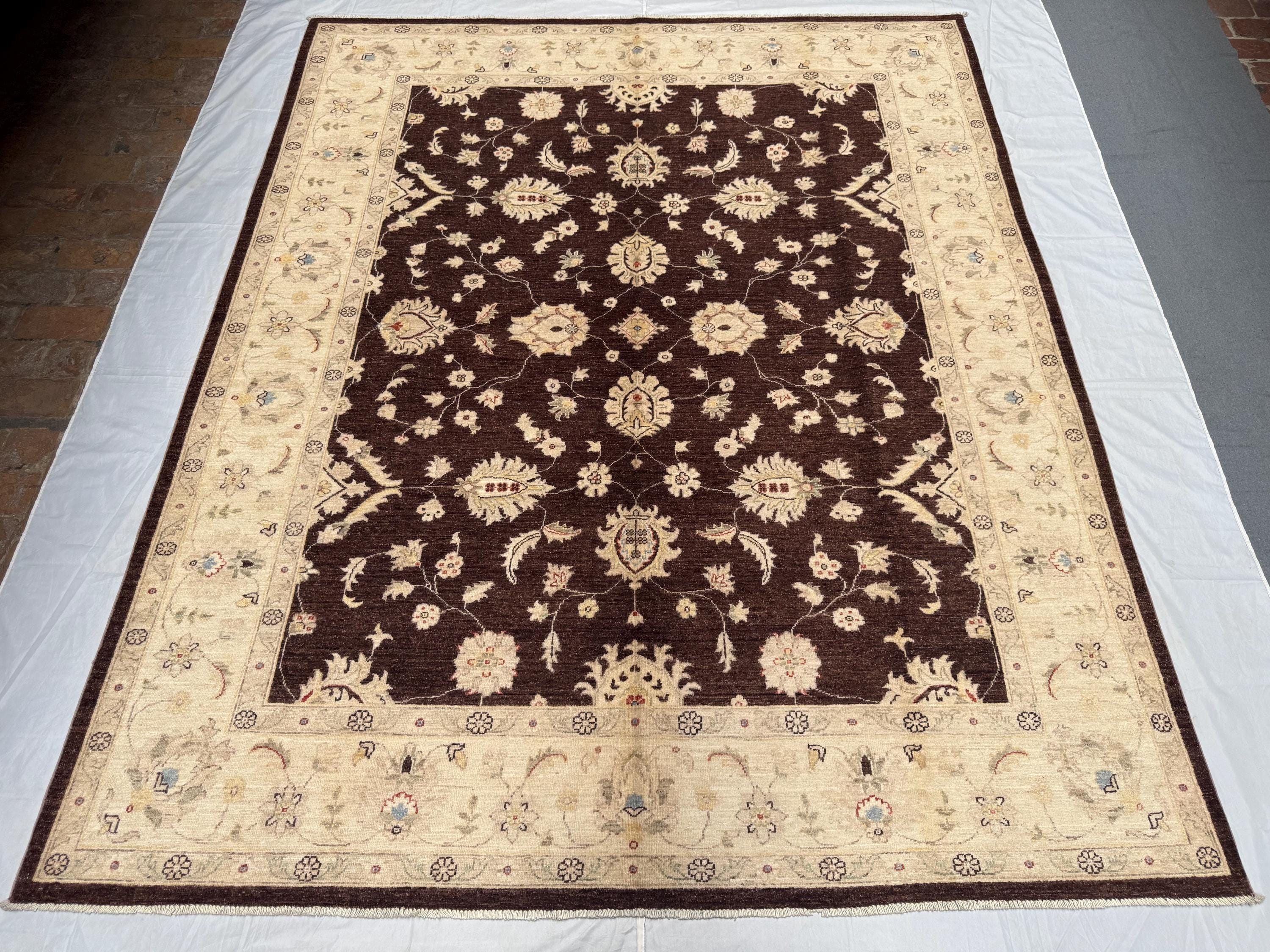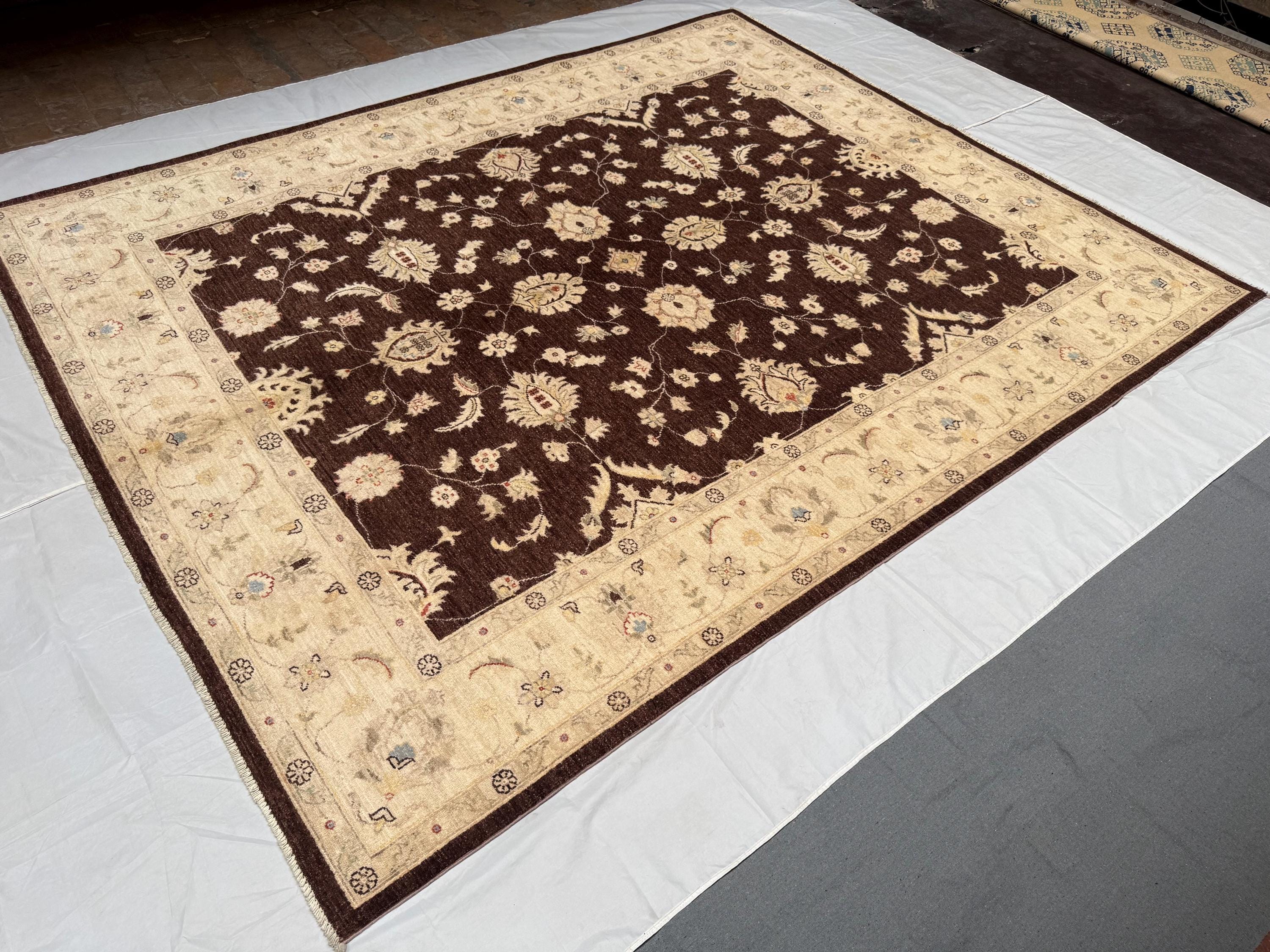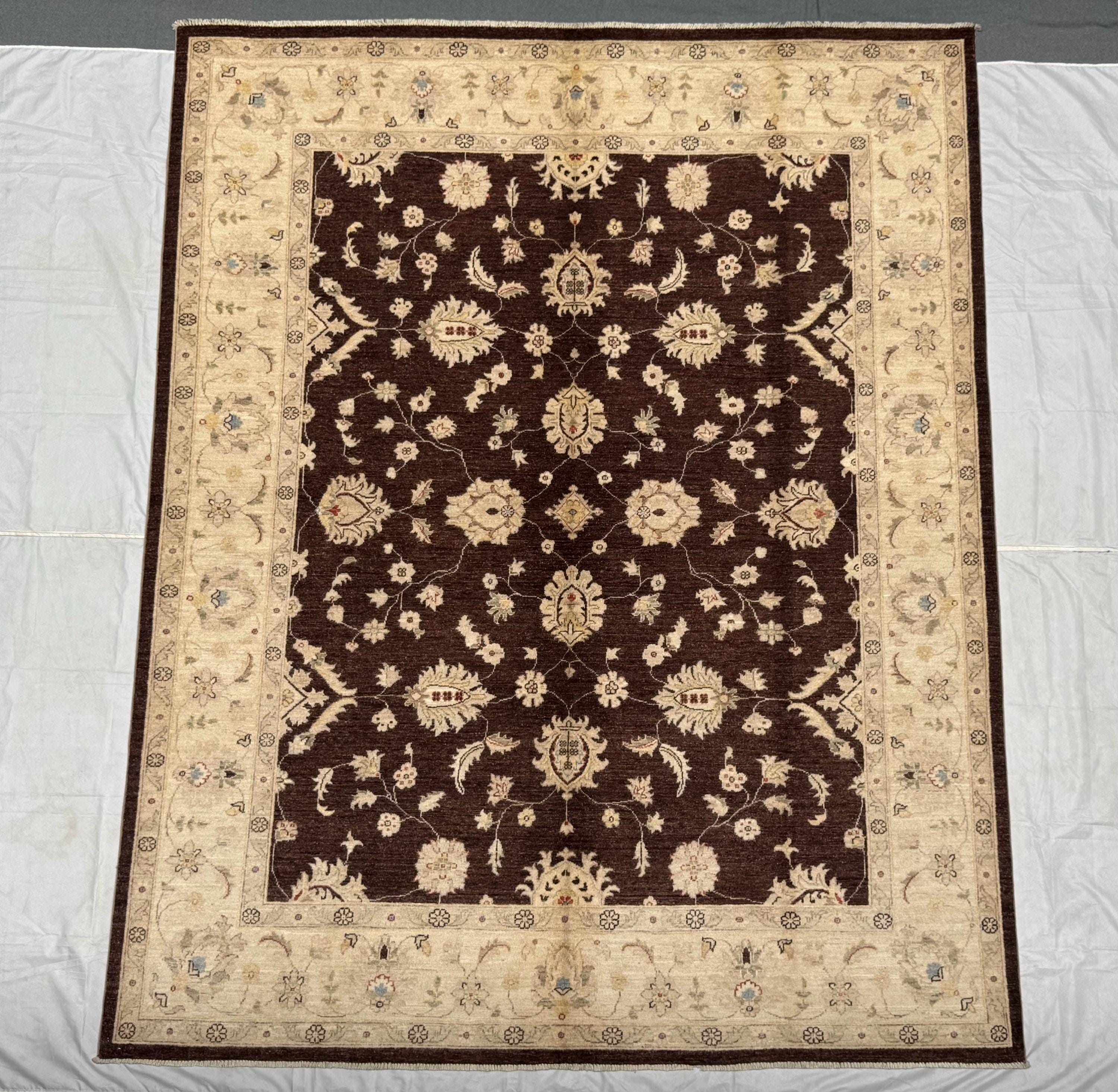This brand new Ziglar Chobi rug combines timeless floral artistry with luxurious craftsmanship. Hand-knotted from 100% natural wool, it features a rich brown field framed by a soft ivory border, decorated with intricate floral and vine motifs. The warm, neutral tones make it an elegant centerpiece that complements both classic and modern interiors.