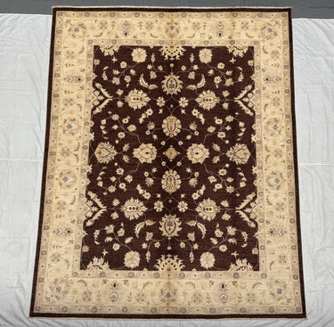 Ziglar Chobi Rug 8x10 ft Hand-Knotted Wool Brown Ivory Carpet, Traditional Floral Oriental Area Rug, Elegant Boho Home Décor